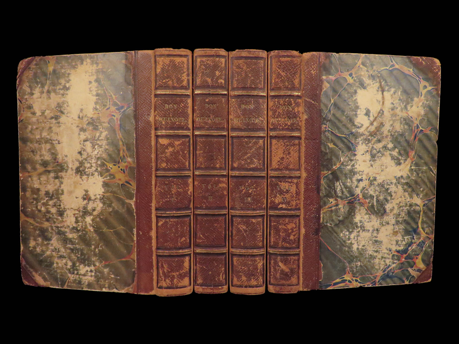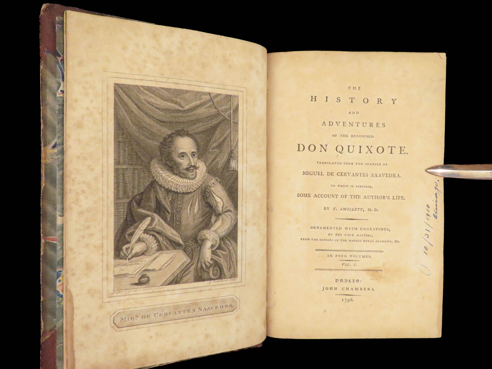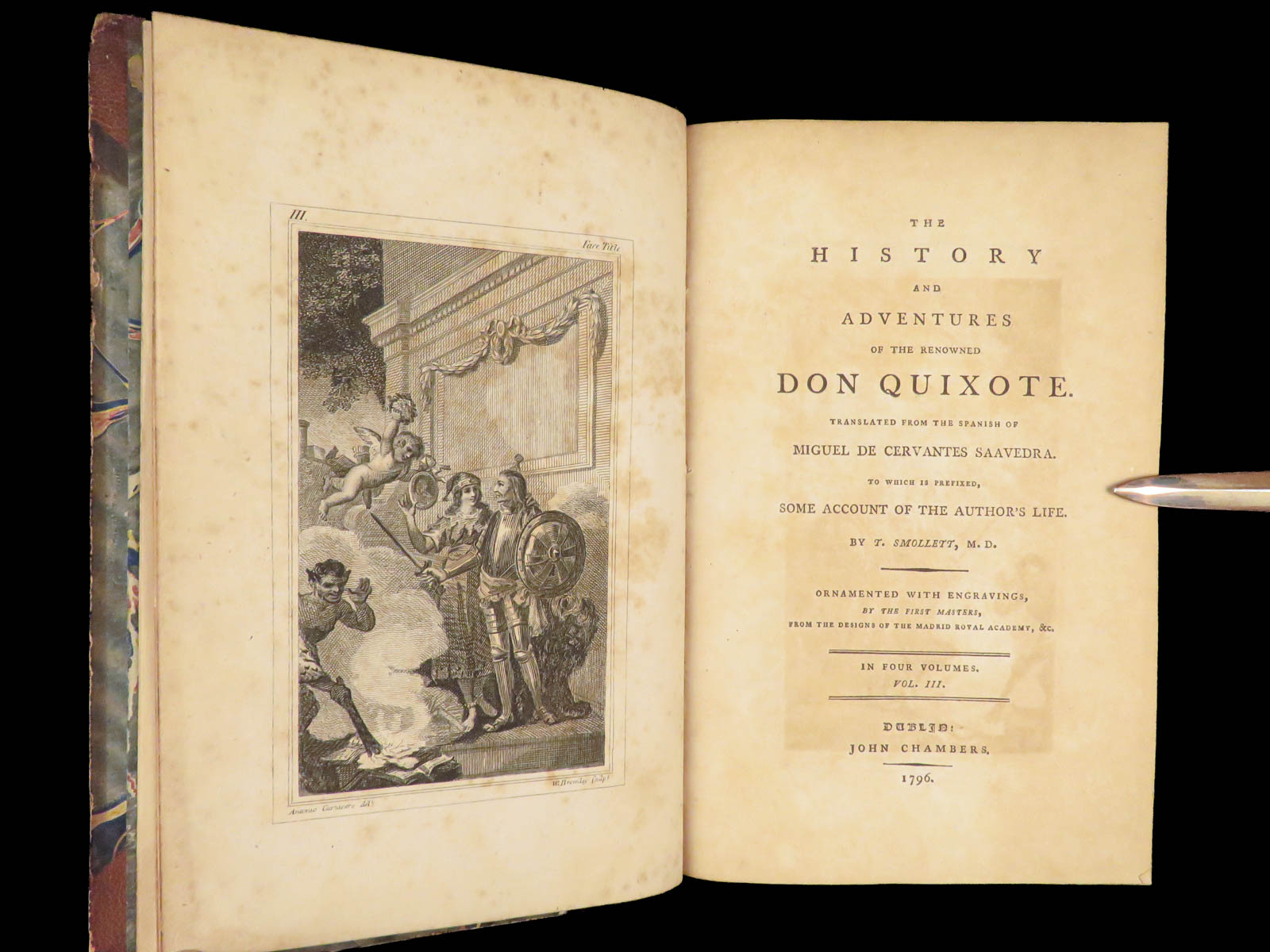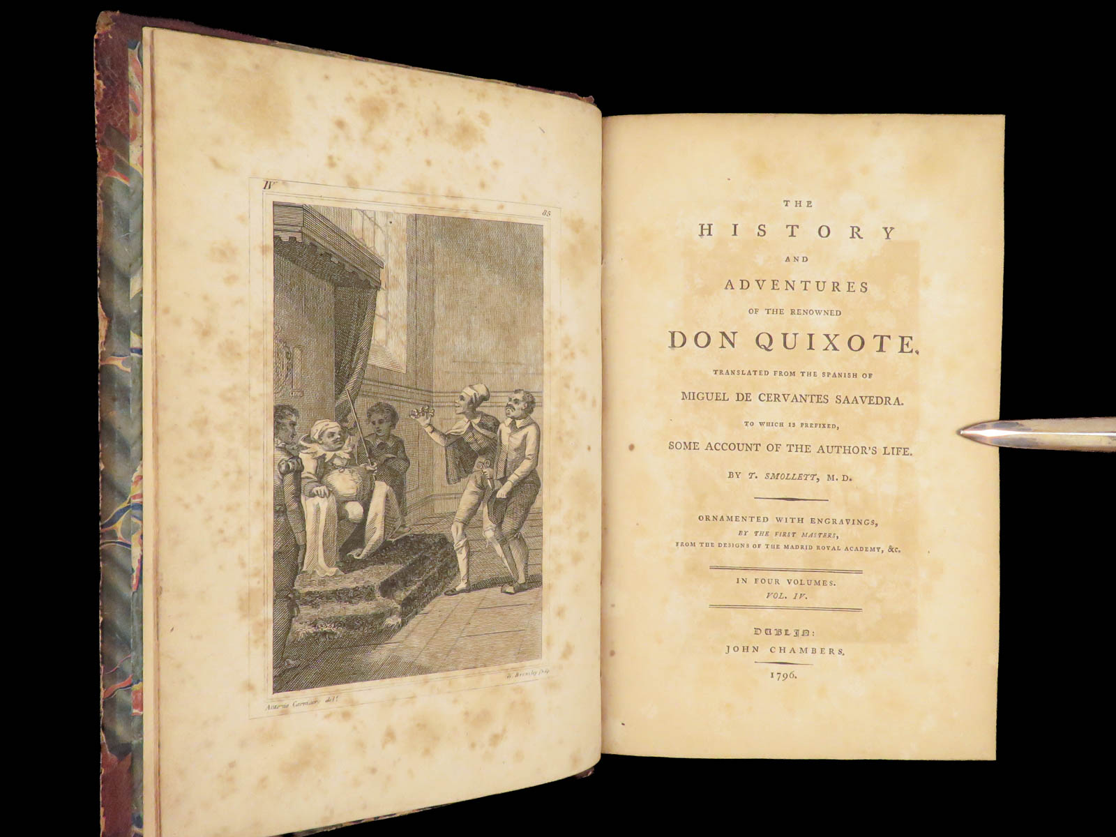 First Dublin edition of Cervantes’ Don Quixote translated by Tobias Smollett, published in 1796 in four volumes with 22 engraved plates, notable for its literary significance and eighteenth-century Irish imprint.