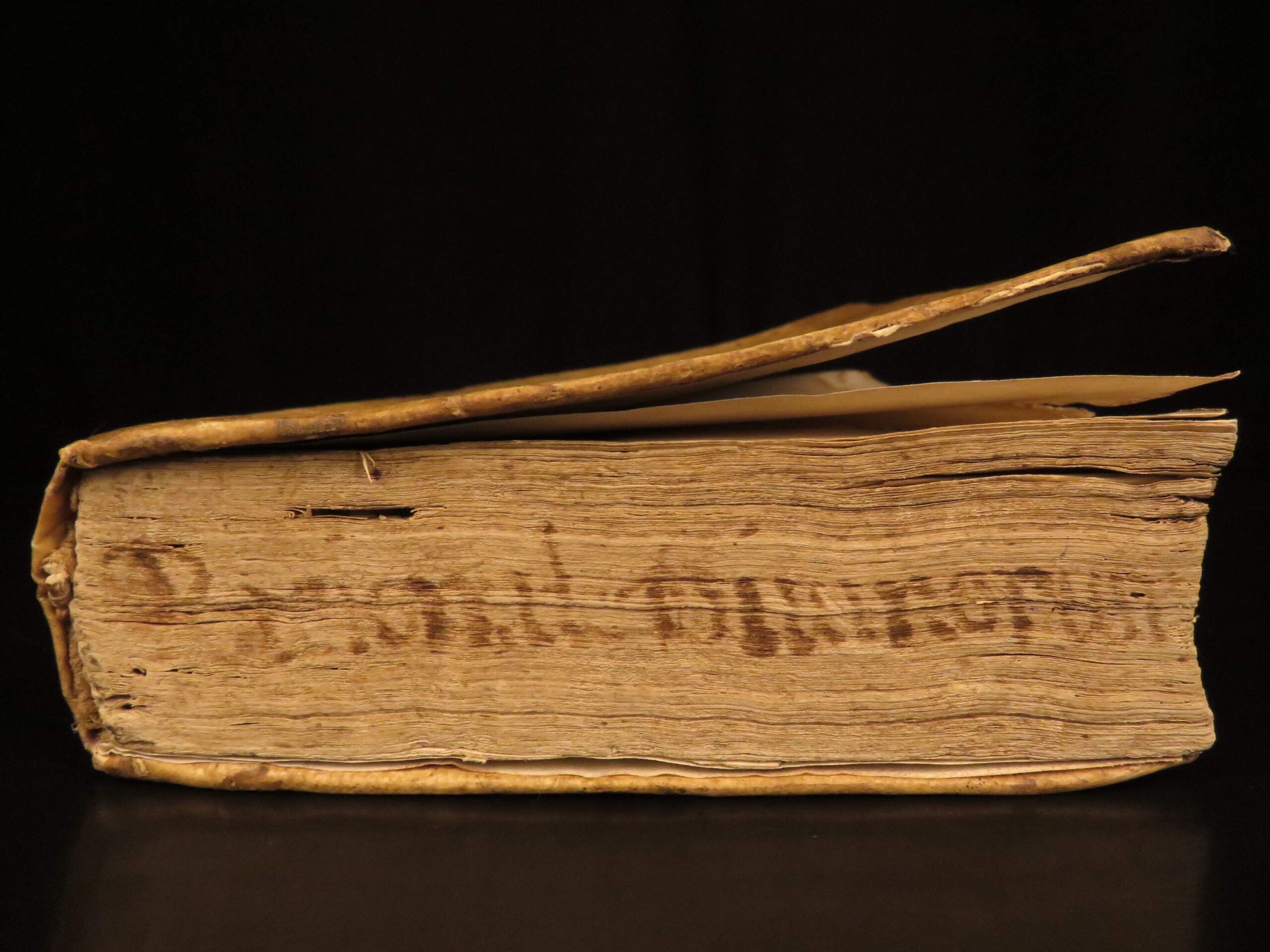 Good. Full vellum binding tight and secure, with visible wrinkling and staining but no material loss. Many page corners and edges show loss. Pages display moderate age toning.