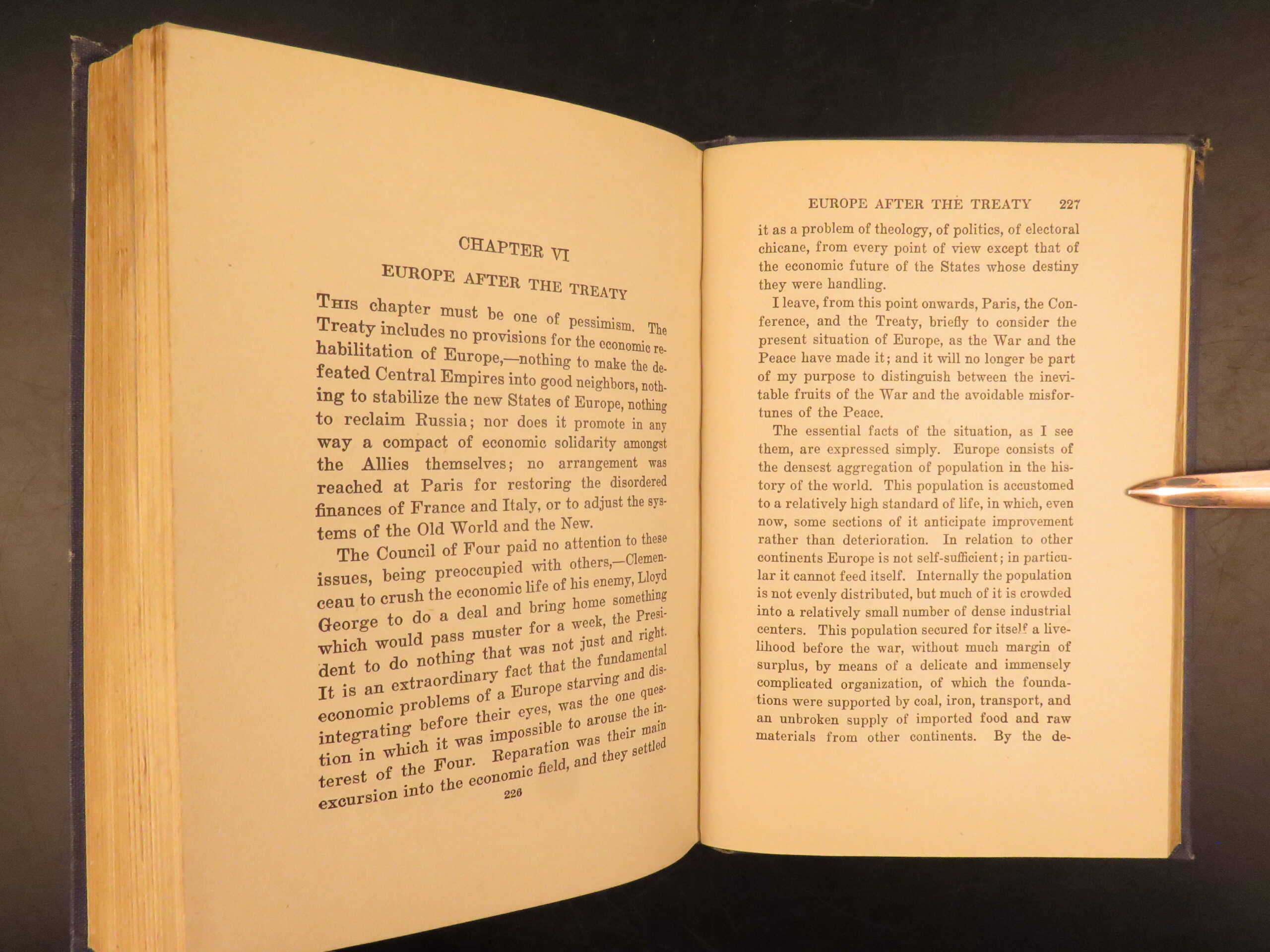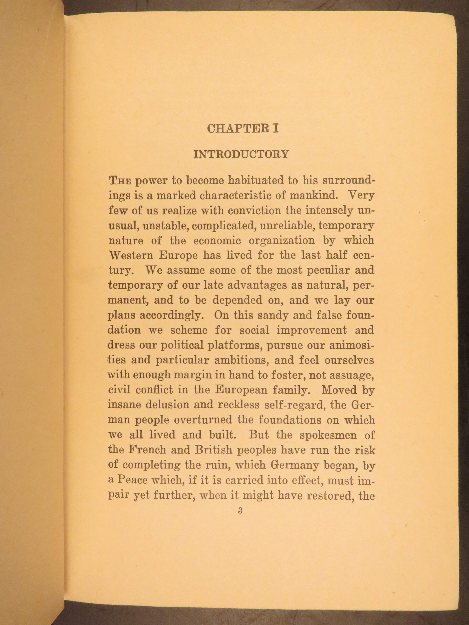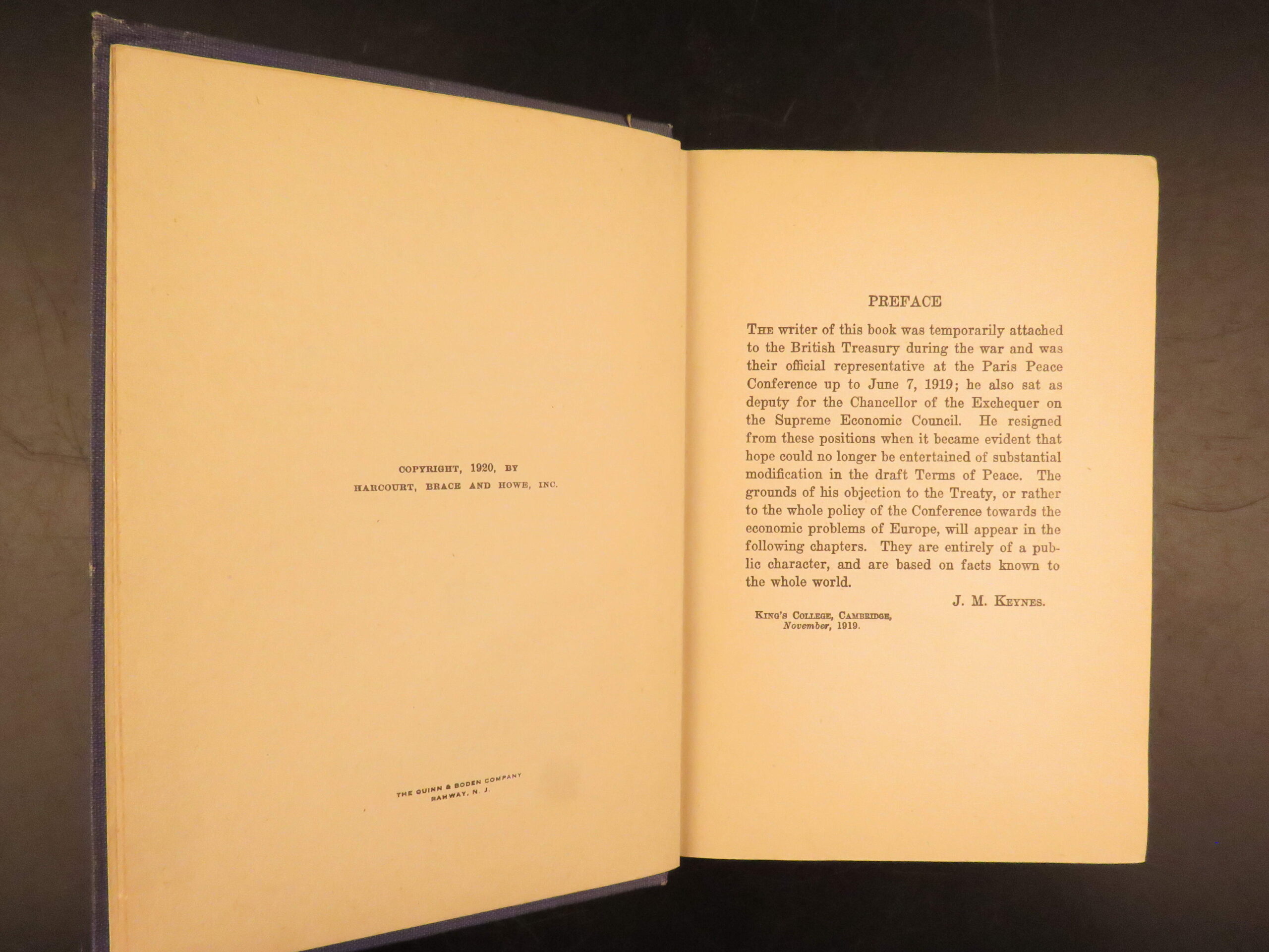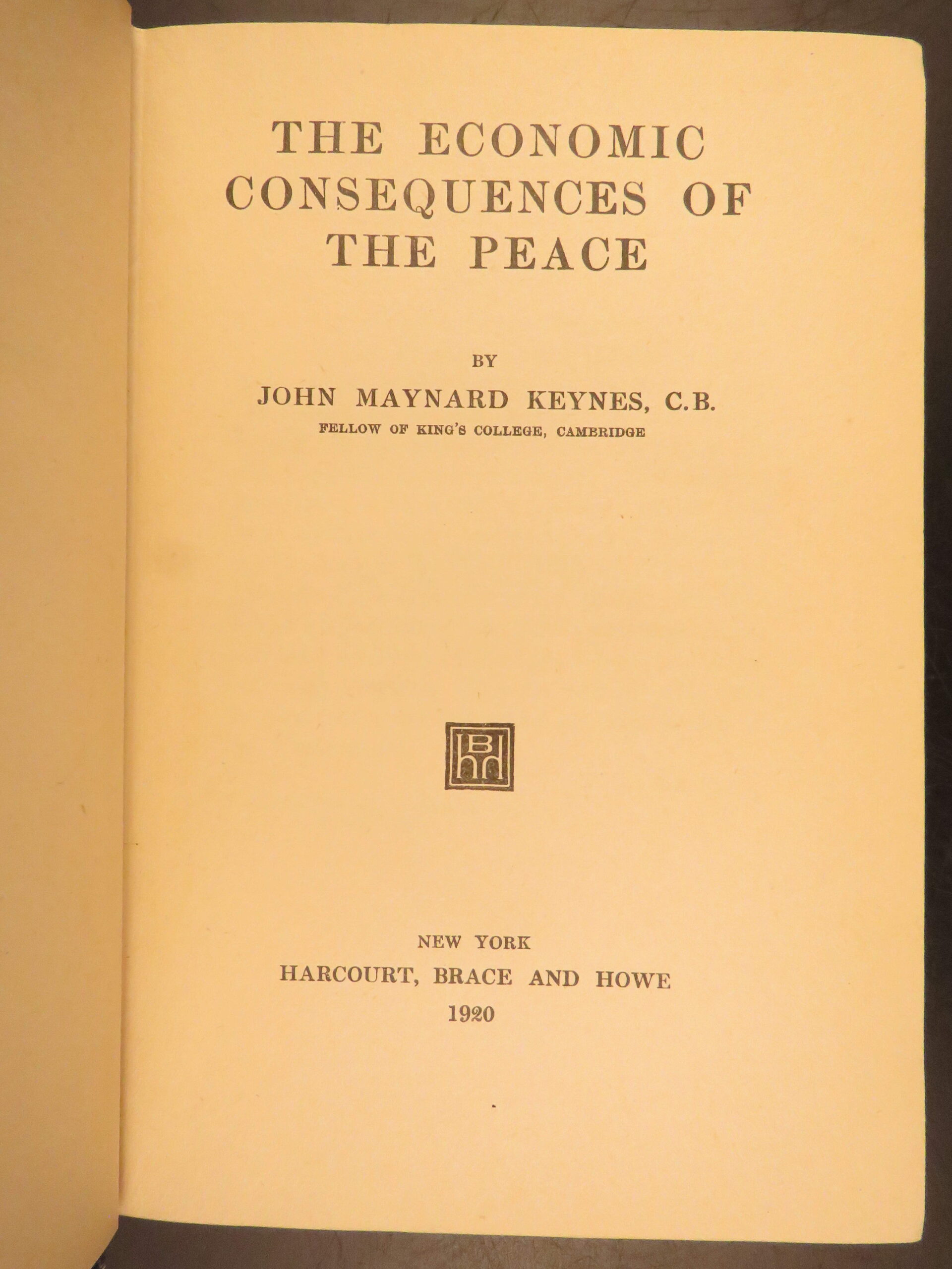First American edition of The Economic Consequences of the Peace by John Maynard Keynes, 1920, a major critique of the Treaty of Versailles and its reparations settlement.