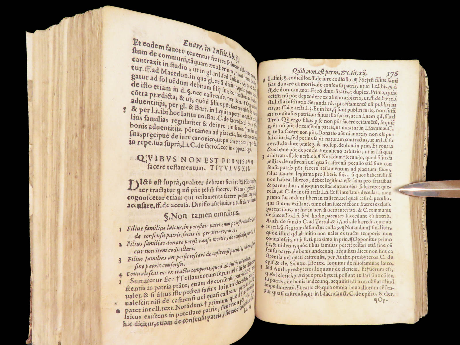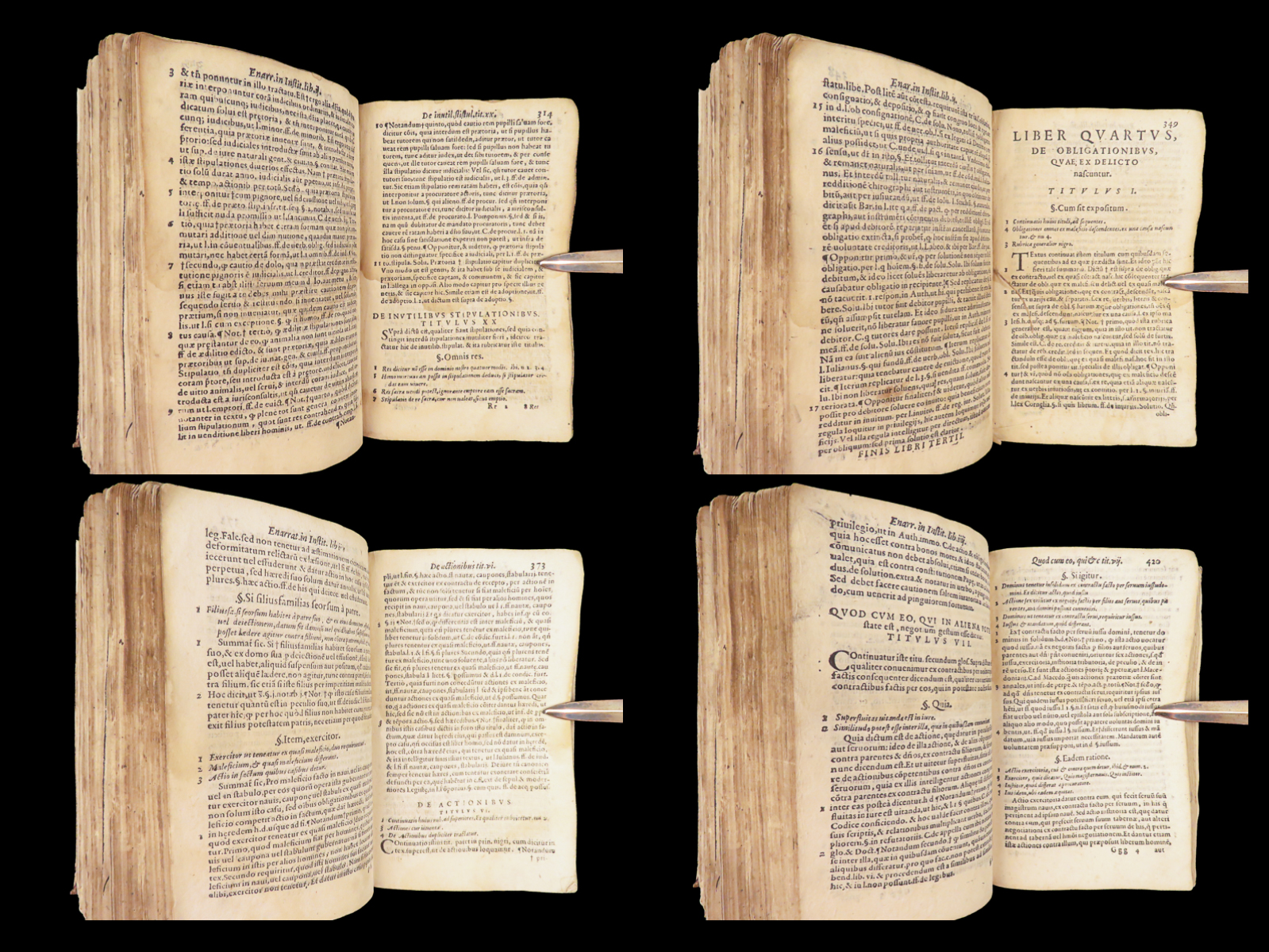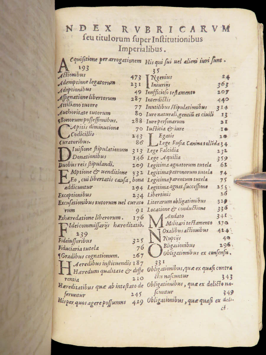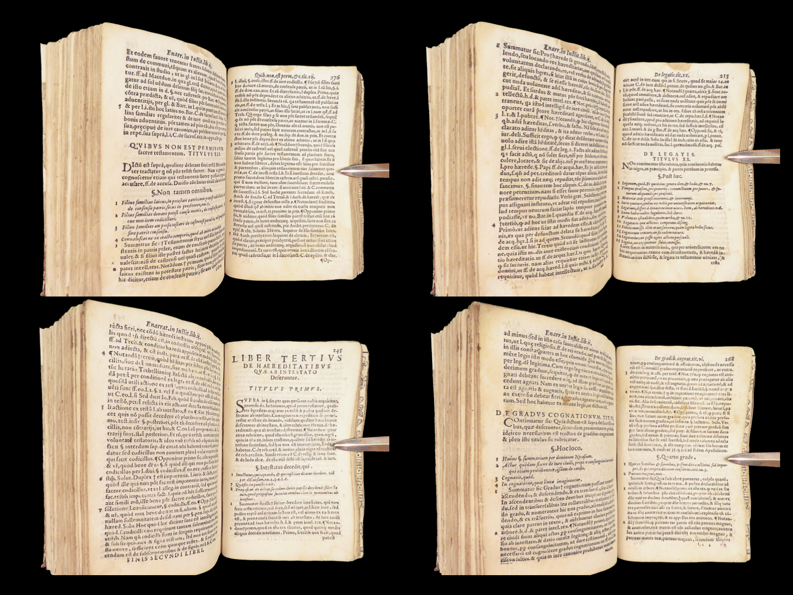 Enarrationes in quatuor libros Institutionum imperialium by Nicasius a Woerda is a 1583 printing of his commentary on the four books of Justinian’s Institutiones, or Imperial Institutes, one of the main sections of the larger Corpus Juris Civilis. It proved to be one of the best commentaries on Roman jurisprudence. This 16th-century edition was collected and edited by Borgaruccio Borgarucci.