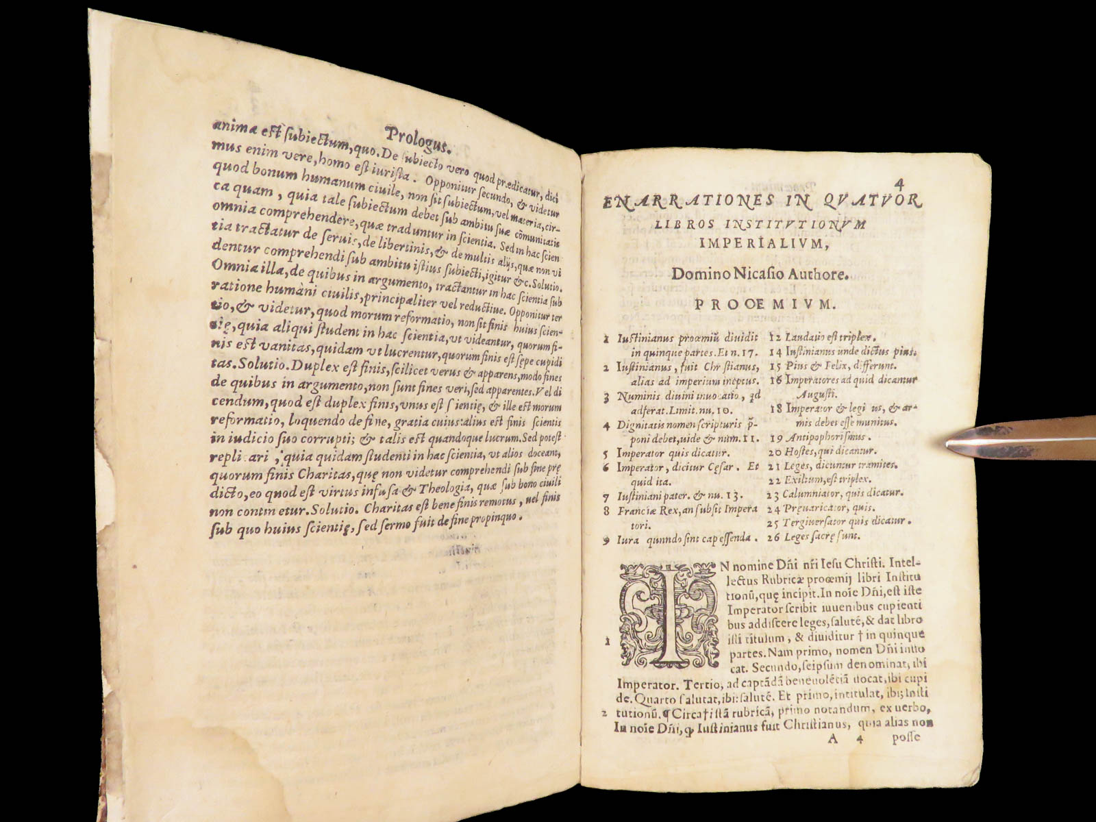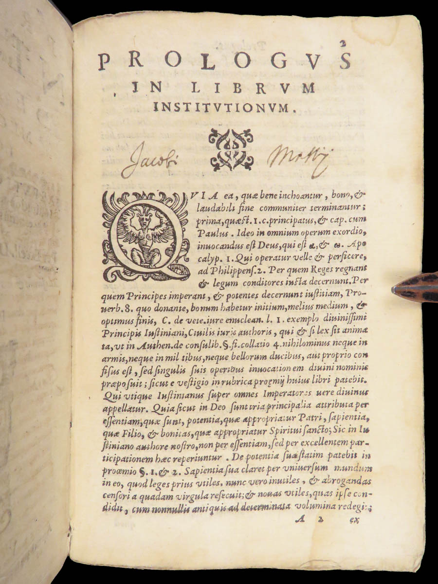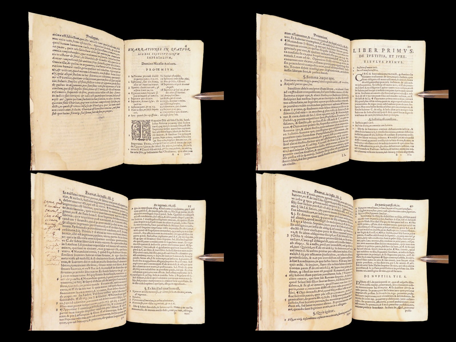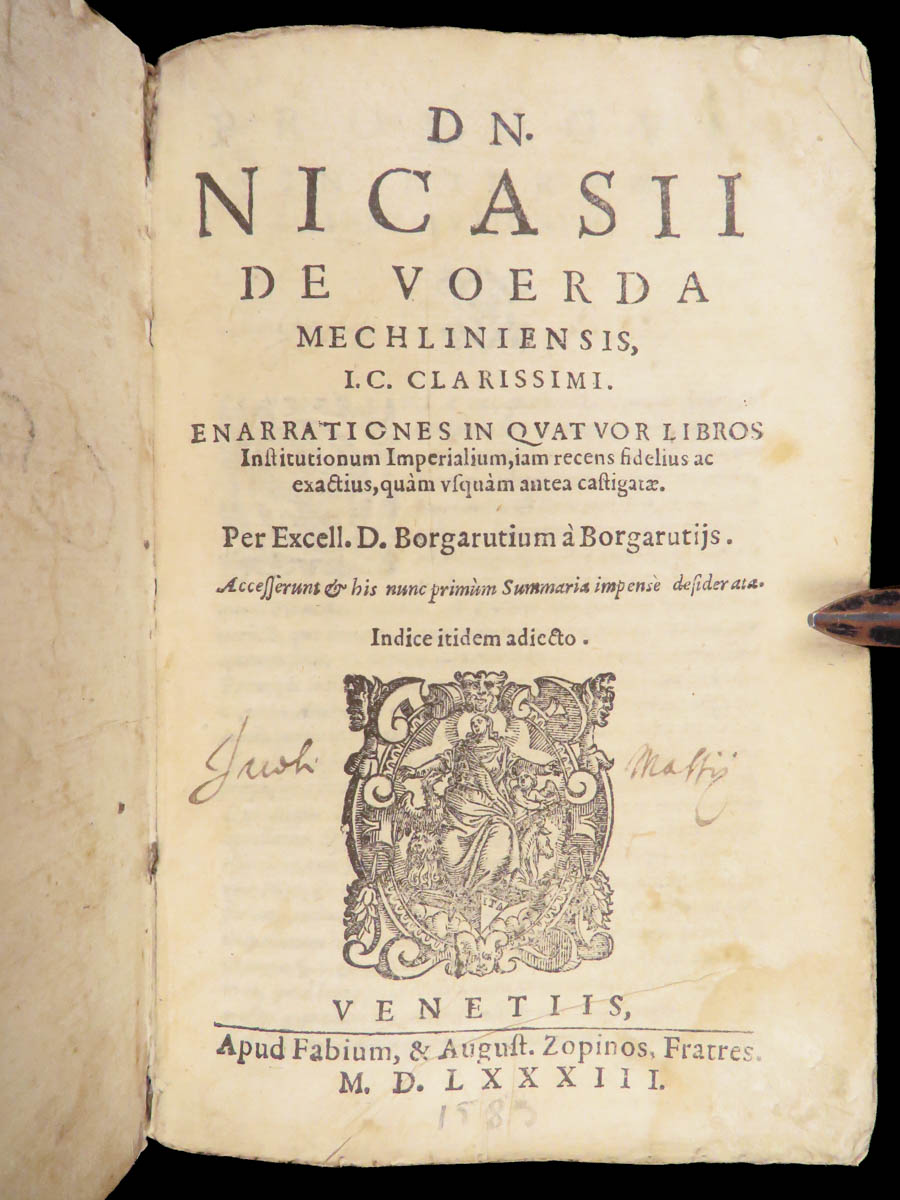 Nicasius a Woerda’s 1583 Enarrationes in quatuor libros Institutionum imperialium (Venice) is a Latin legal commentary on Justinian’s Institutiones with two woodcut engravings.