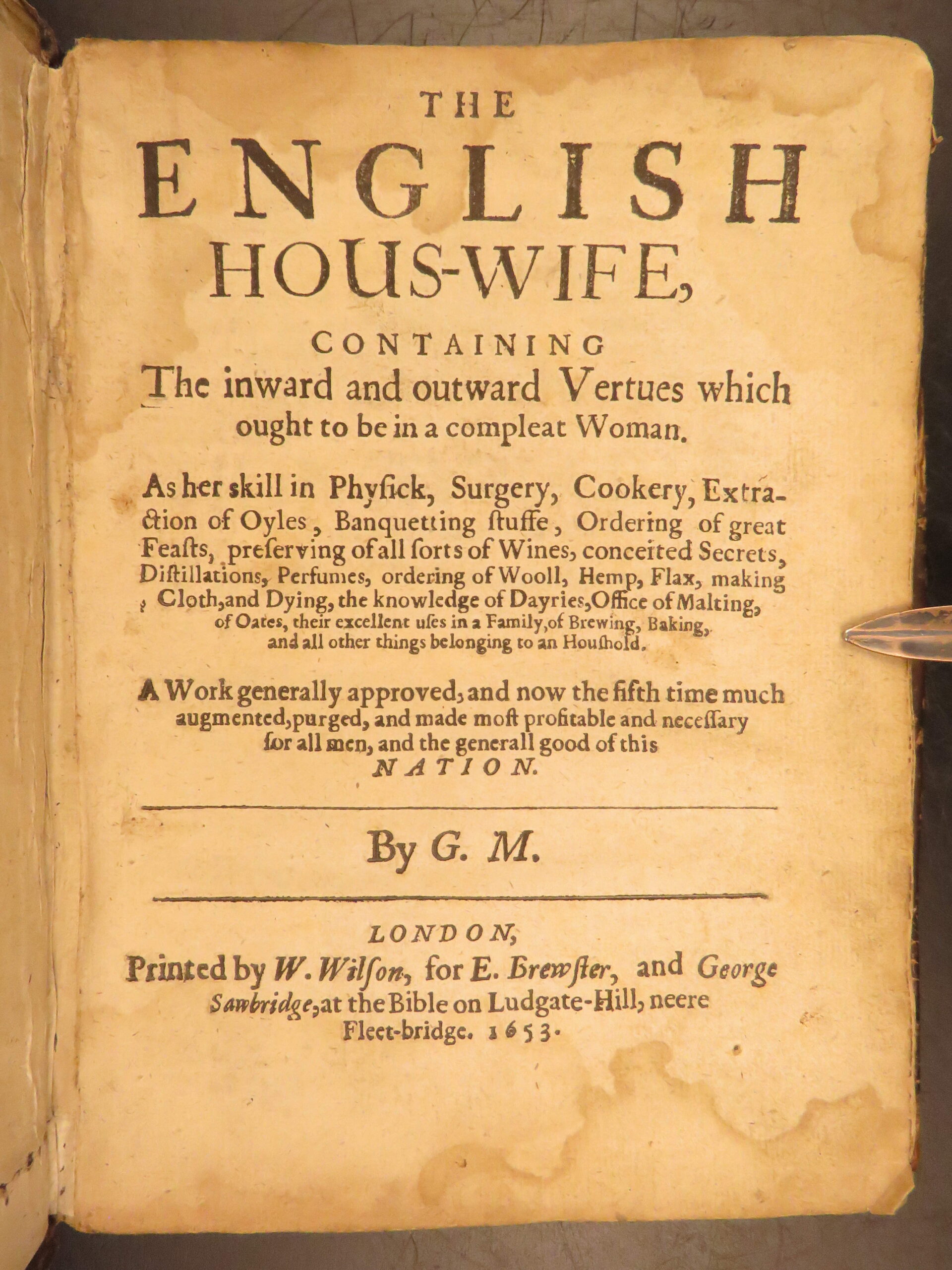Fifth edition of Gervase Markham’s The English House-Wife (1653), covering 17th-century food preparation, conduct, and household routines for English women.