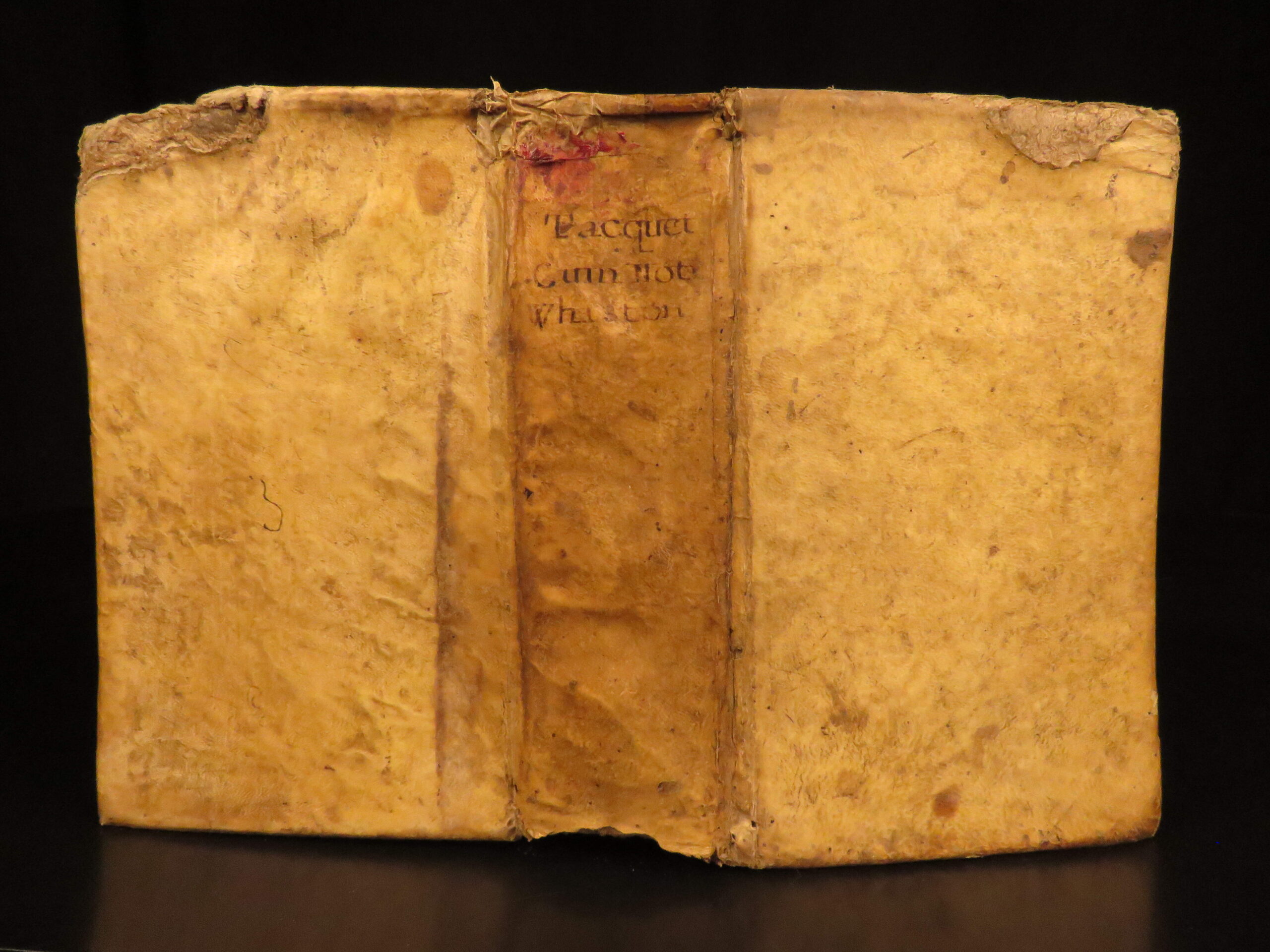 Good. Full vellum binding secure with visible staining and some loss at the rear hinge; text block stable; notable spotting and foxing throughout; text remains legible.