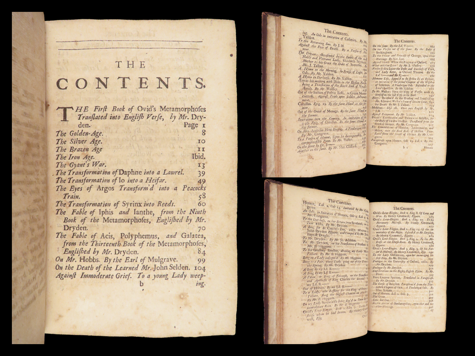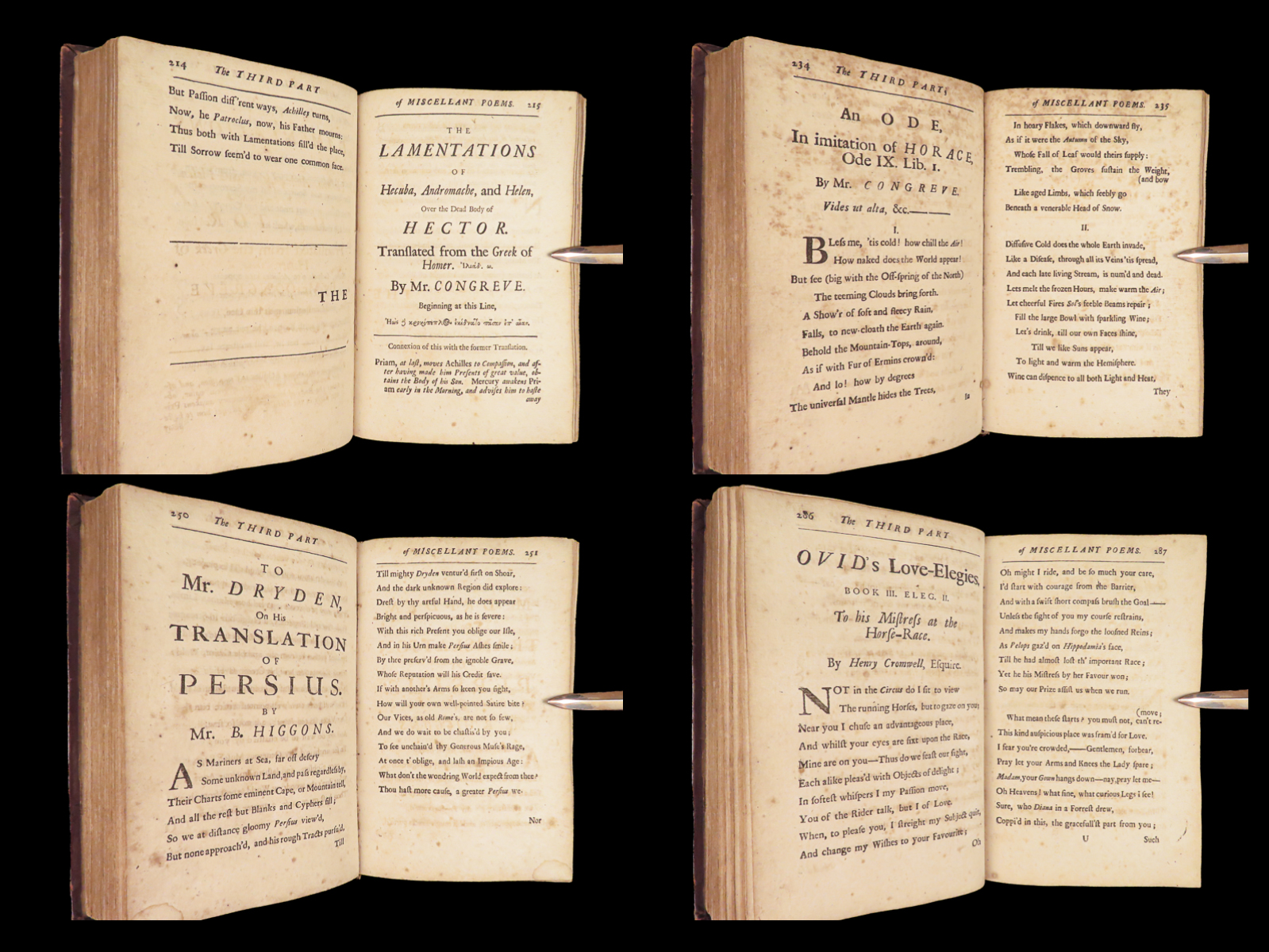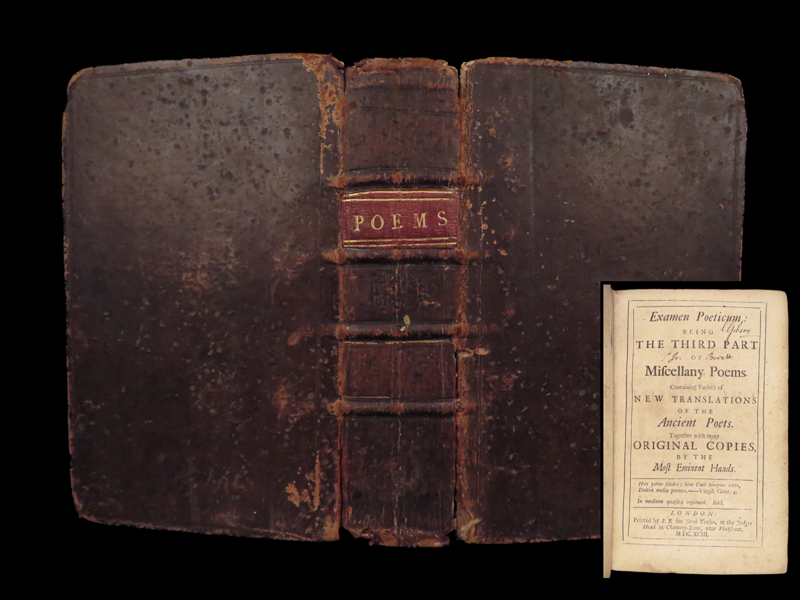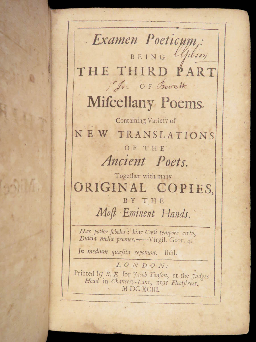 First edition of Examen Poeticum, published in London by Jacob Tonson in 1693, the third part of Tonson’s Miscellany containing Dryden’s translations of Ovid and Homer alongside Catullus, Horace, and Fulvio Testi.