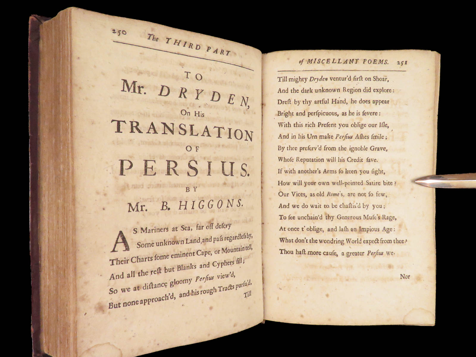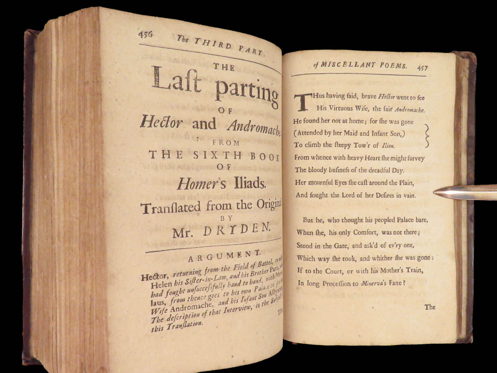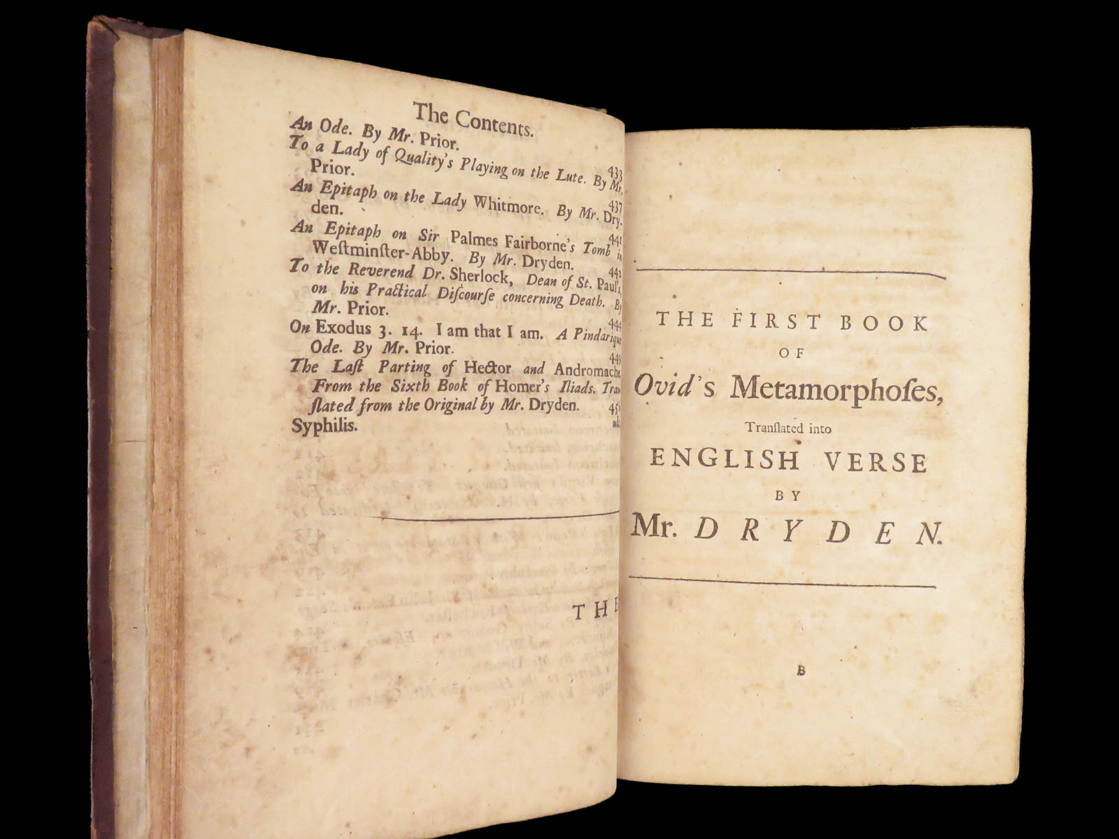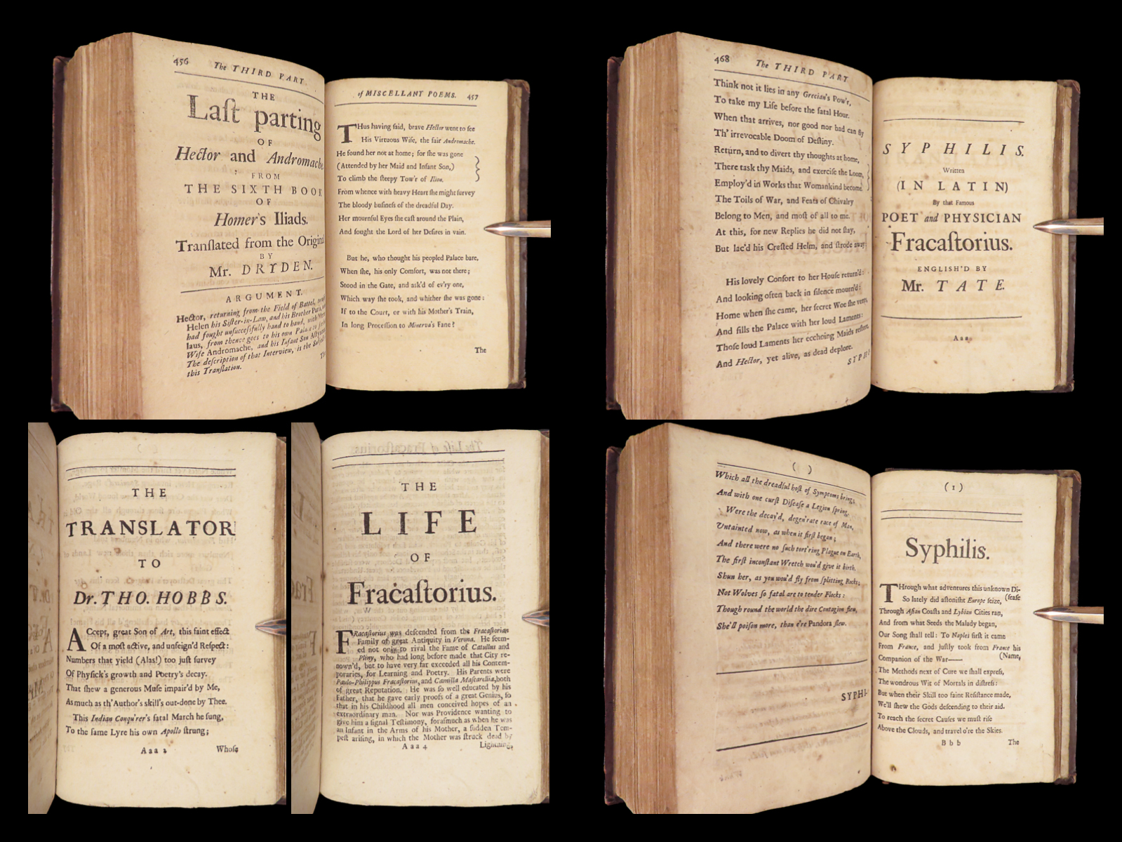 First edition of Examen Poeticum, published in London by Jacob Tonson in 1693, the third part of Tonson’s Miscellany containing Dryden’s translations of Ovid and Homer alongside Catullus, Horace, and Fulvio Testi.
