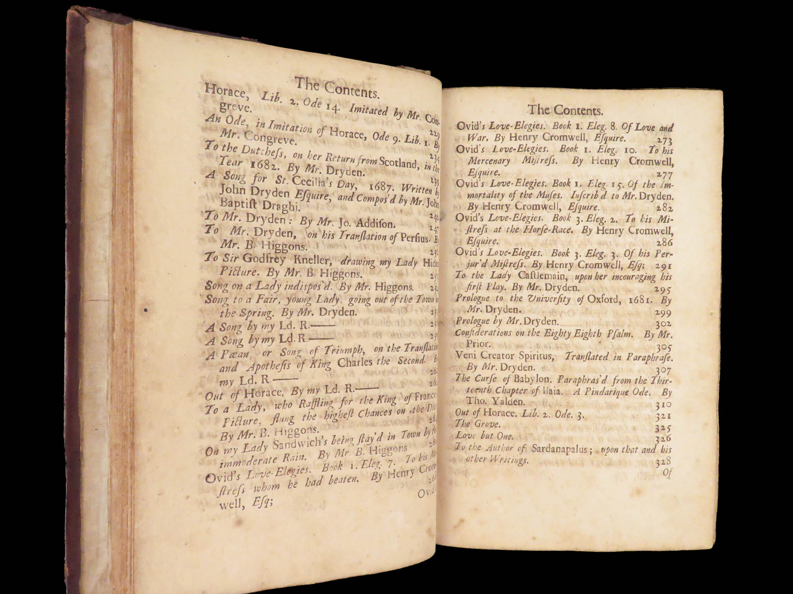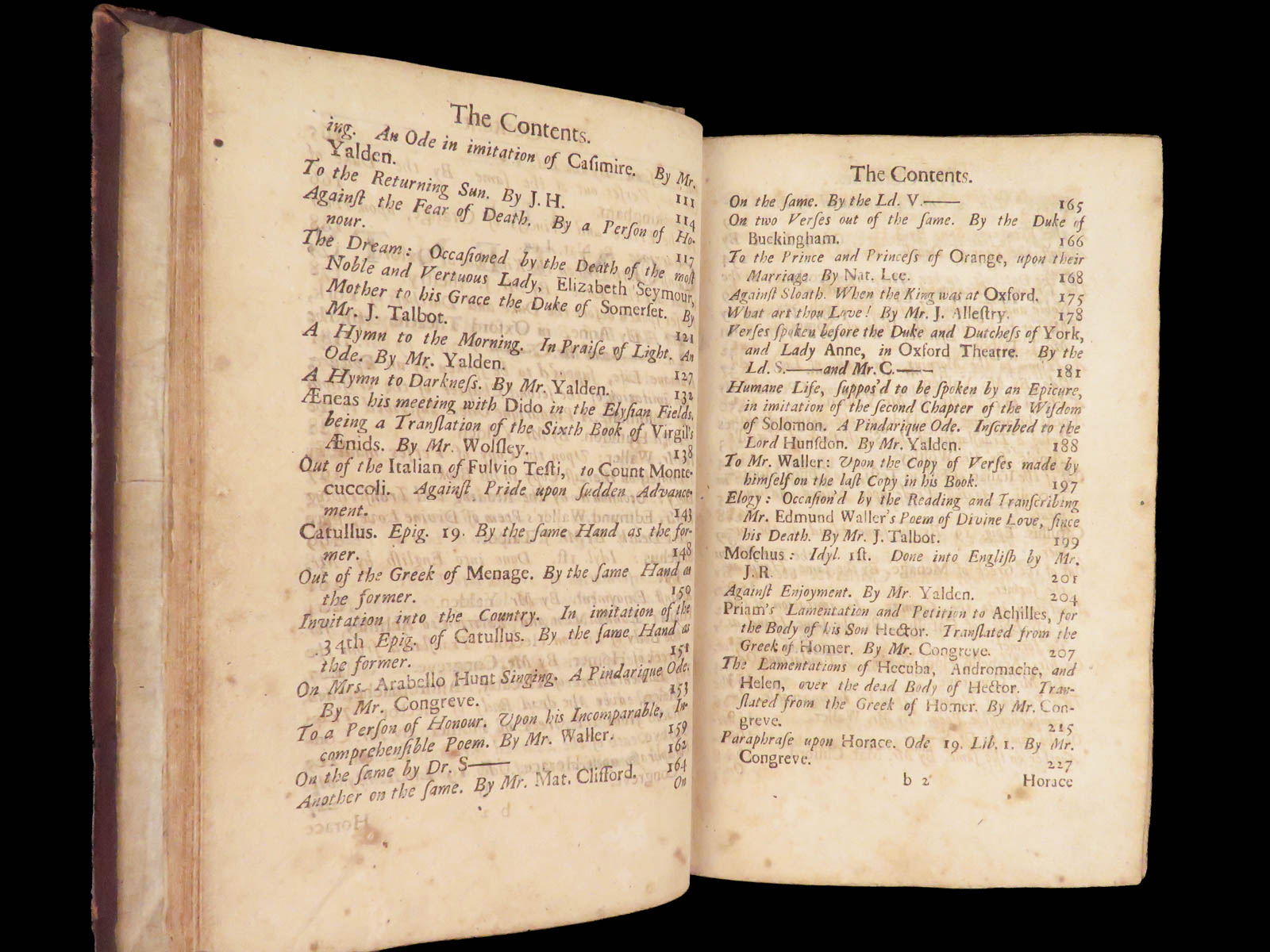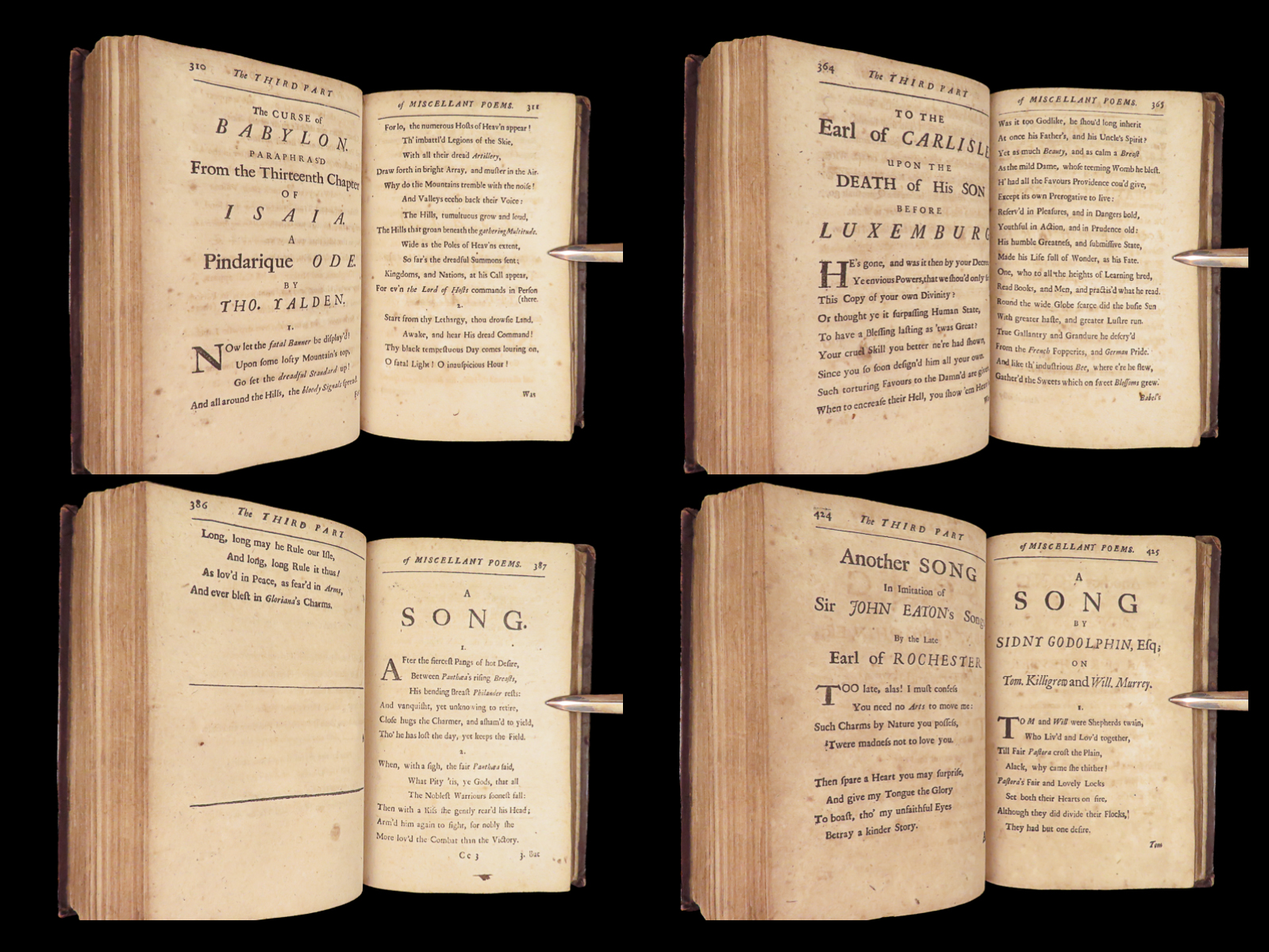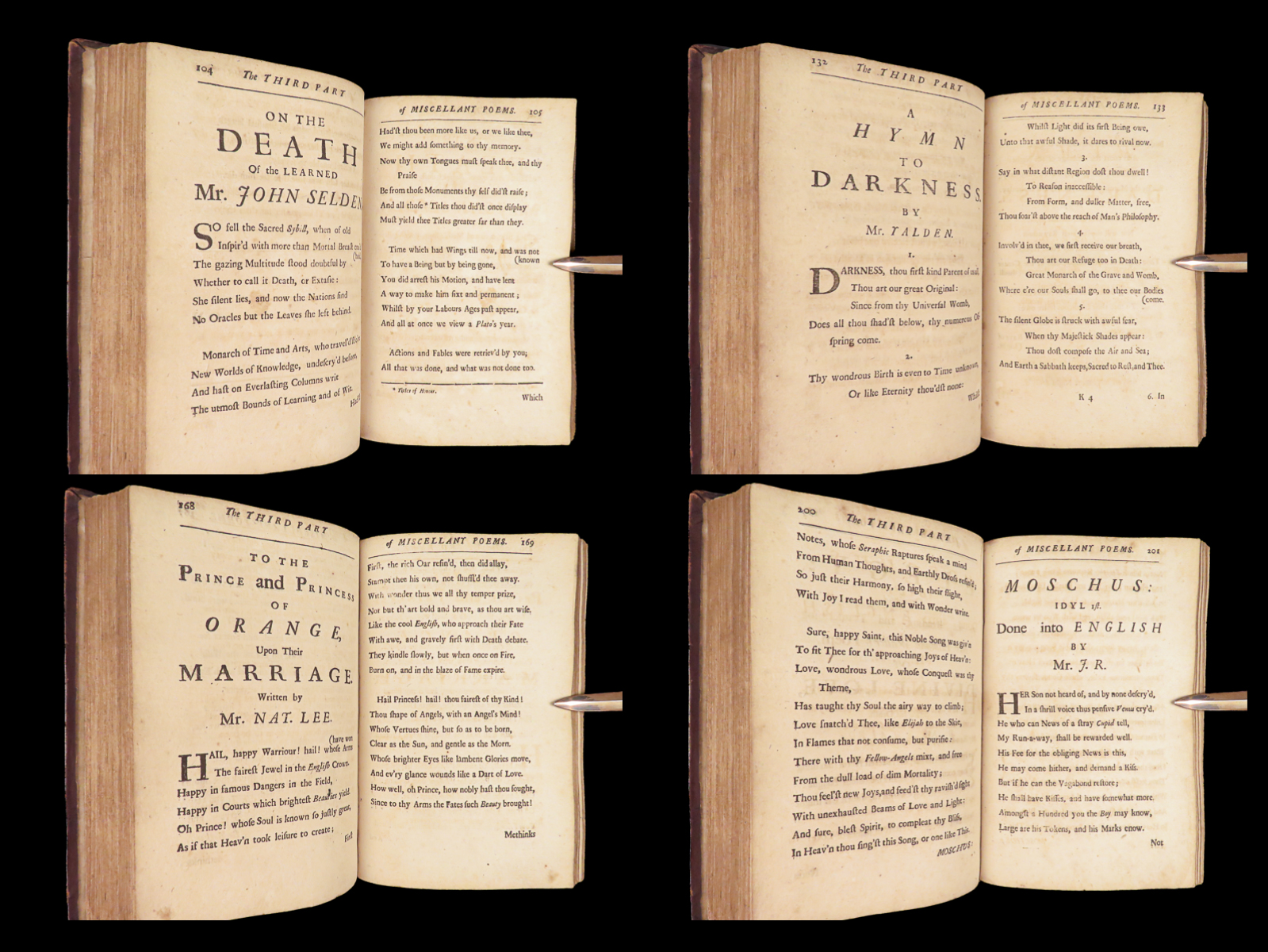 Examen Poeticum is a 1693 collection of miscellaneous poems often refered to as “Tonson’s Miscellanies”. This first edition of the third installment includes some of the most iconic works of classical literature. Notable works include translations of Ovid’s Love Elegies as well as portions of Metamorphoses translated by John Dryden. Other selections include those of Catullus, selections for Fulvio Testi, odes of Horace, and passages from Homer’s Iliad. This work, and the others from the set, offered readers an exposure to ancient, classical literary traditions.