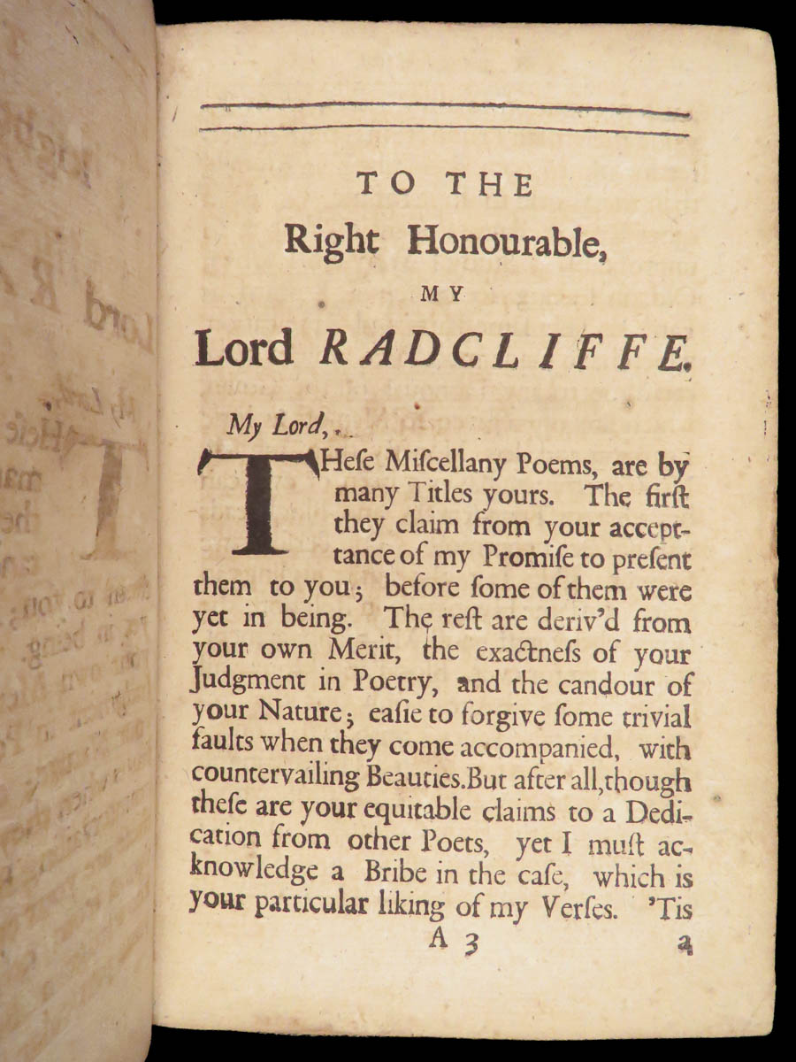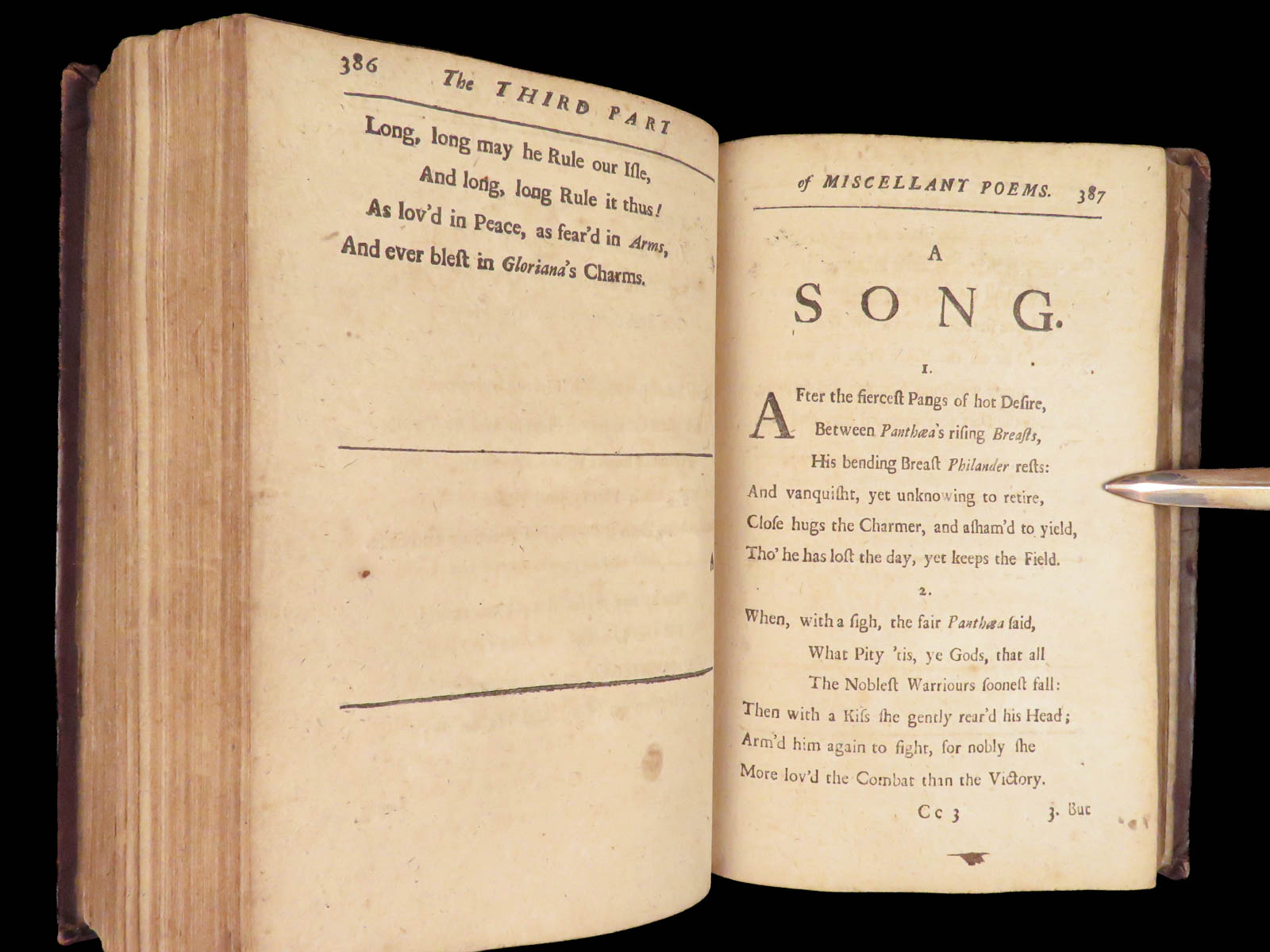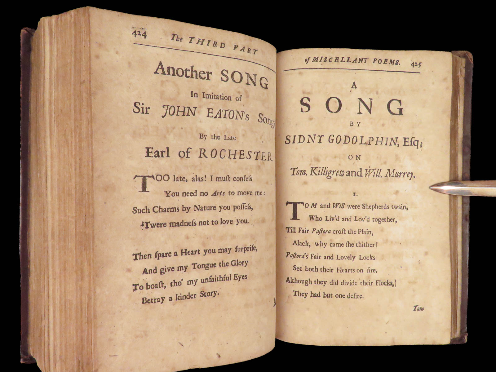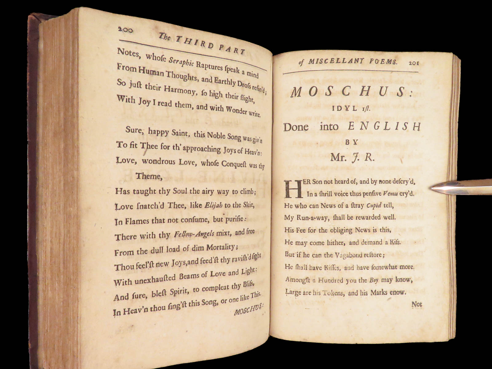Examen Poeticum is a 1693 collection of miscellaneous poems often refered to as “Tonson’s Miscellanies”. This first edition of the third installment includes some of the most iconic works of classical literature. Notable works include translations of Ovid’s Love Elegies as well as portions of Metamorphoses translated by John Dryden. Other selections include those of Catullus, selections for Fulvio Testi, odes of Horace, and passages from Homer’s Iliad. This work, and the others from the set, offered readers an exposure to ancient, classical literary traditions.