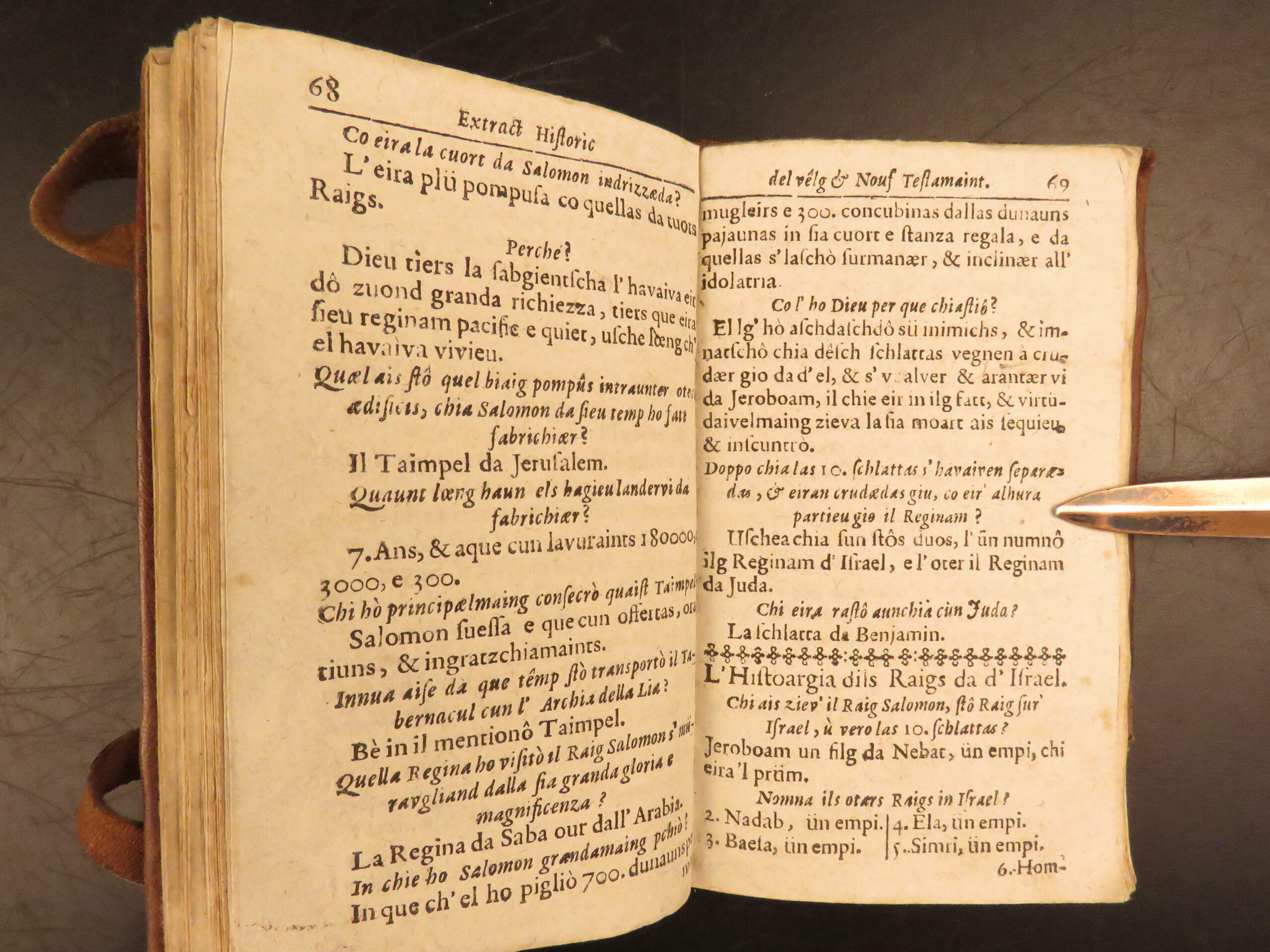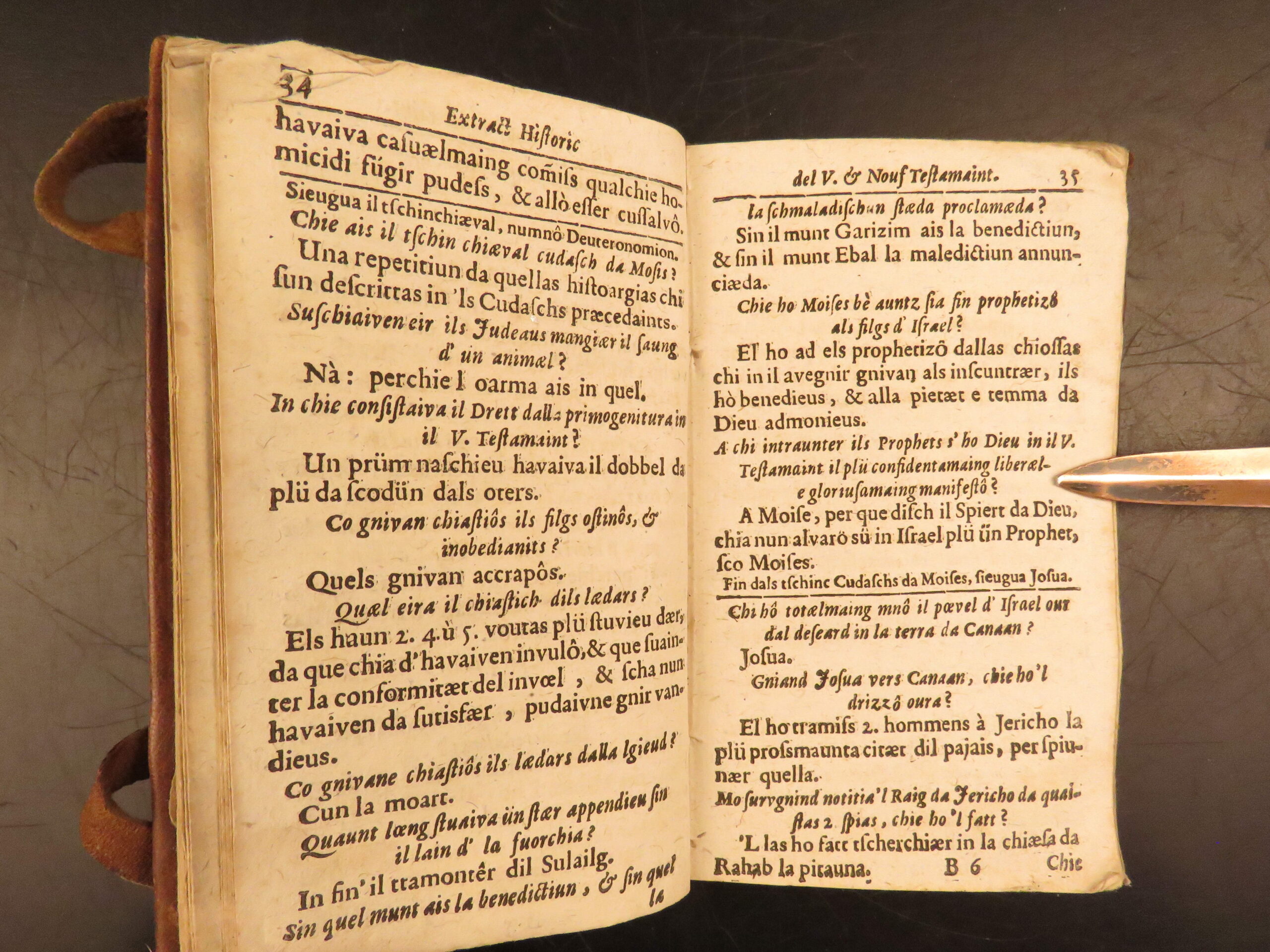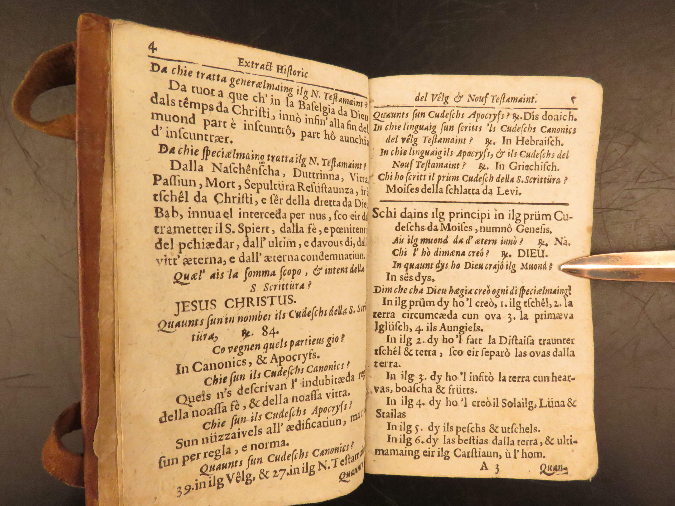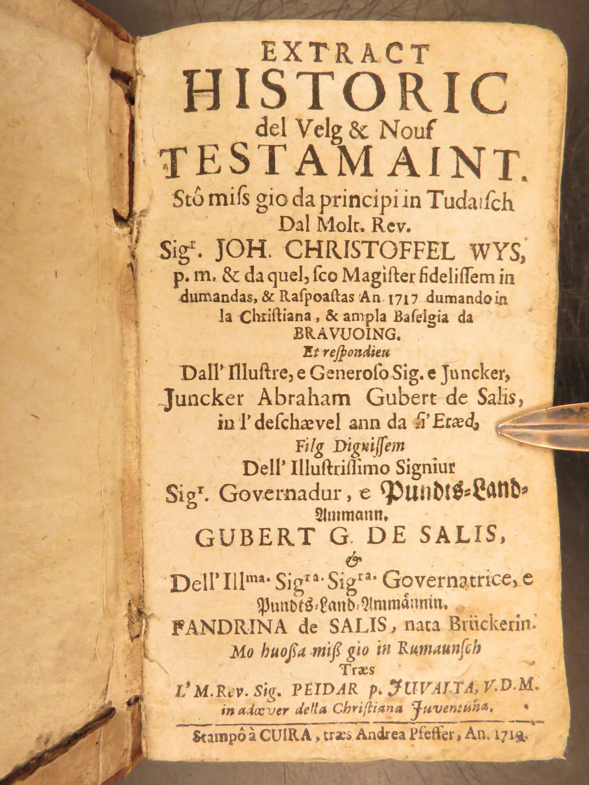 Printed in Cuira in 1719, Wyss’s Extract Historic del Velg e Nouf Testamaint is a structured theological dialogue in Romansh, translated by Juvalta and tied to the Reformed Church.
