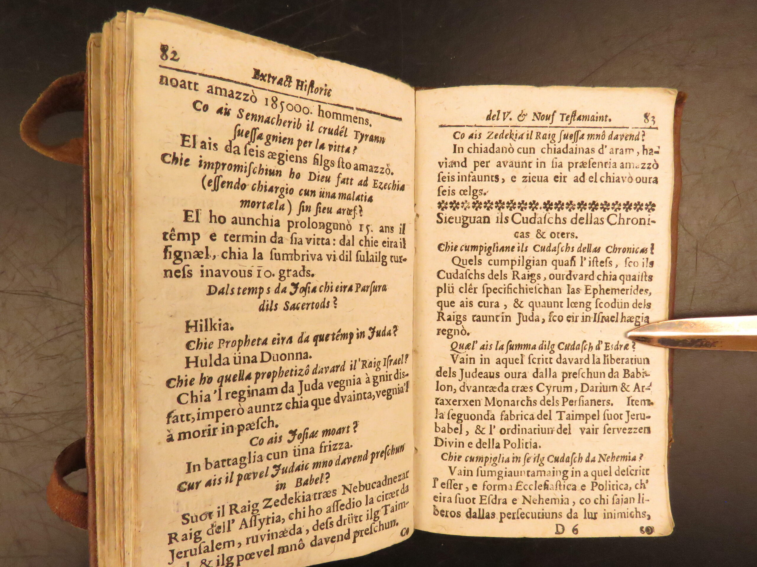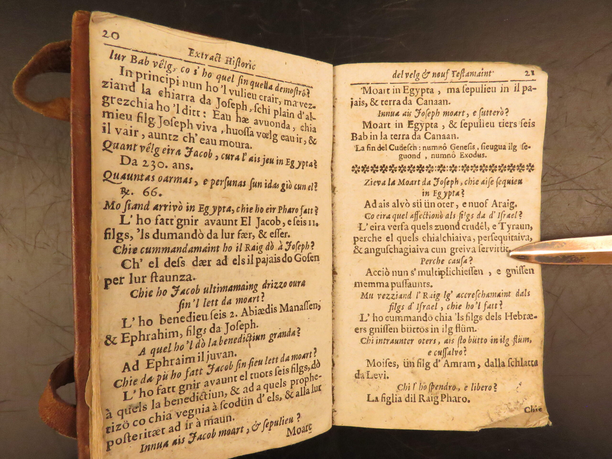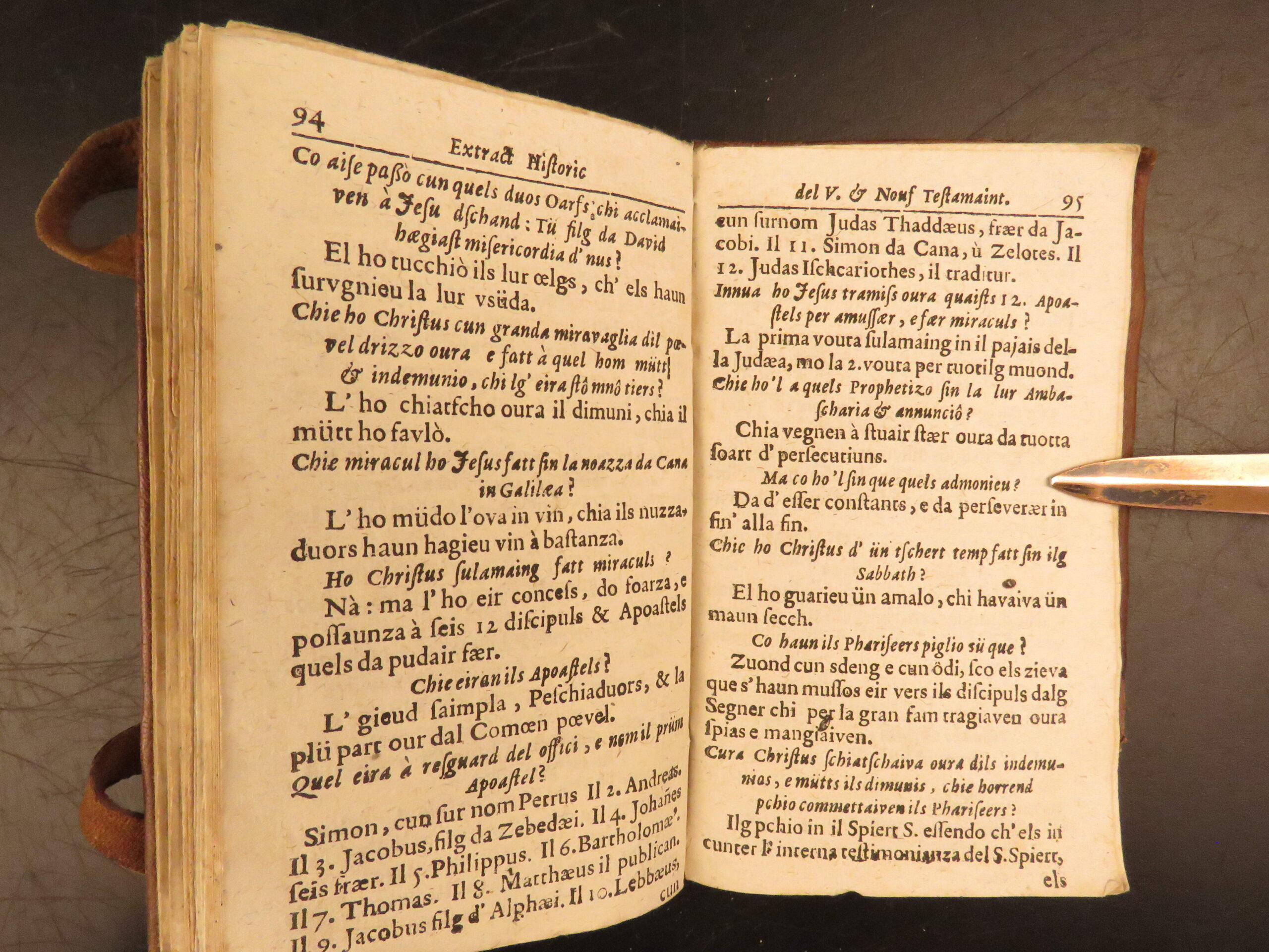 Printed in Cuira in 1719, Wyss’s Extract Historic del Velg e Nouf Testamaint is a structured theological dialogue in Romansh, translated by Juvalta and tied to the Reformed Church.