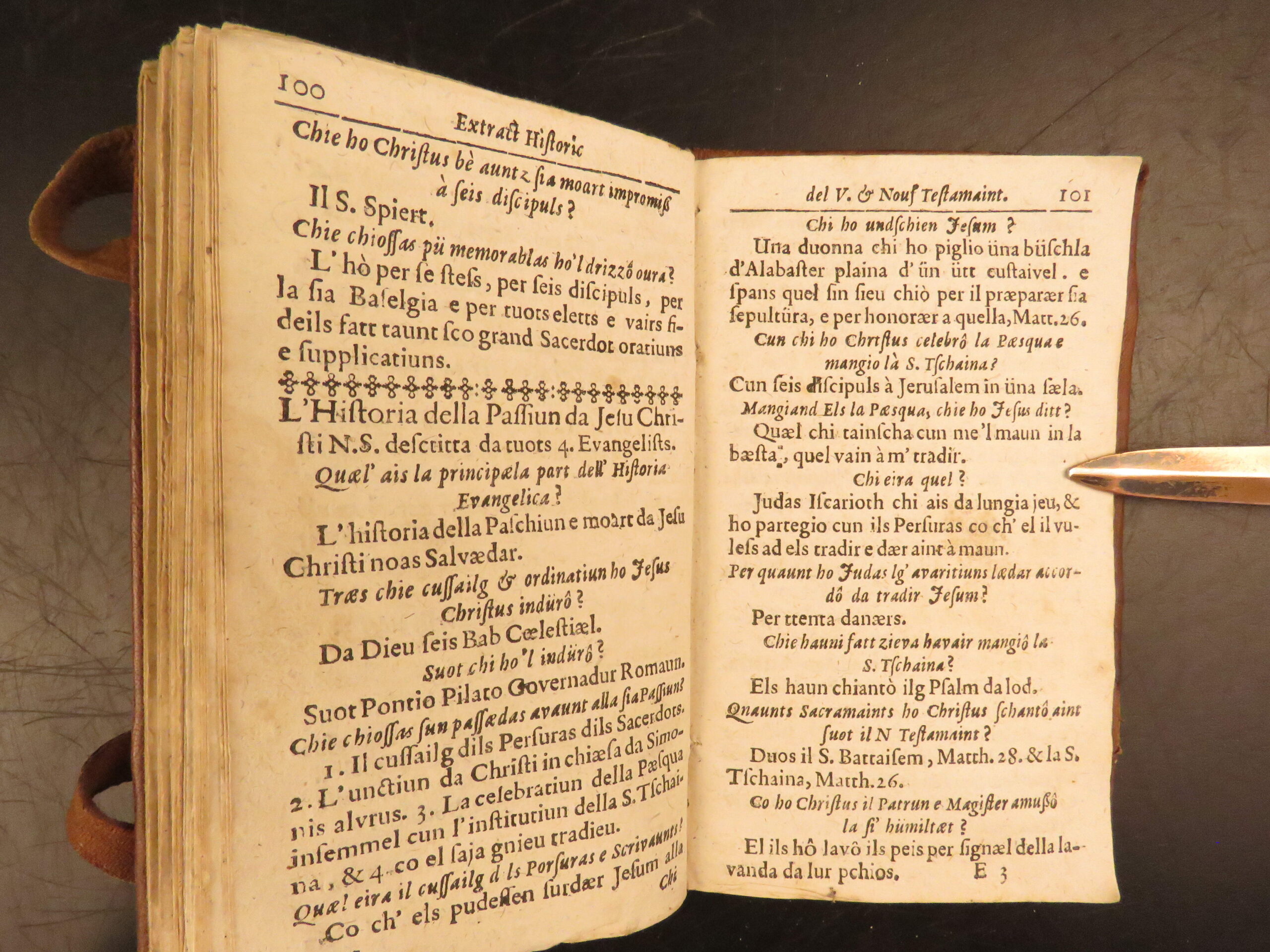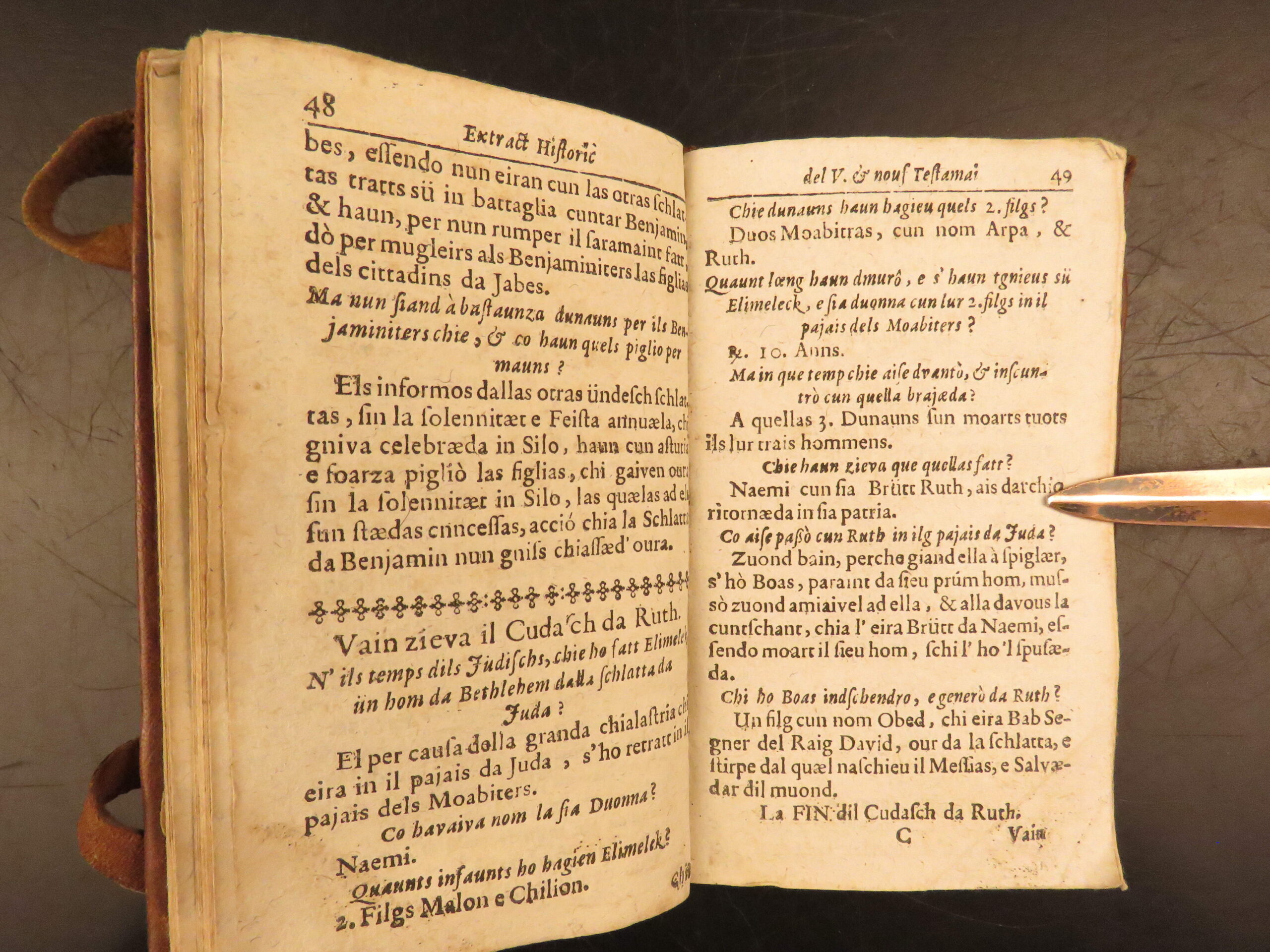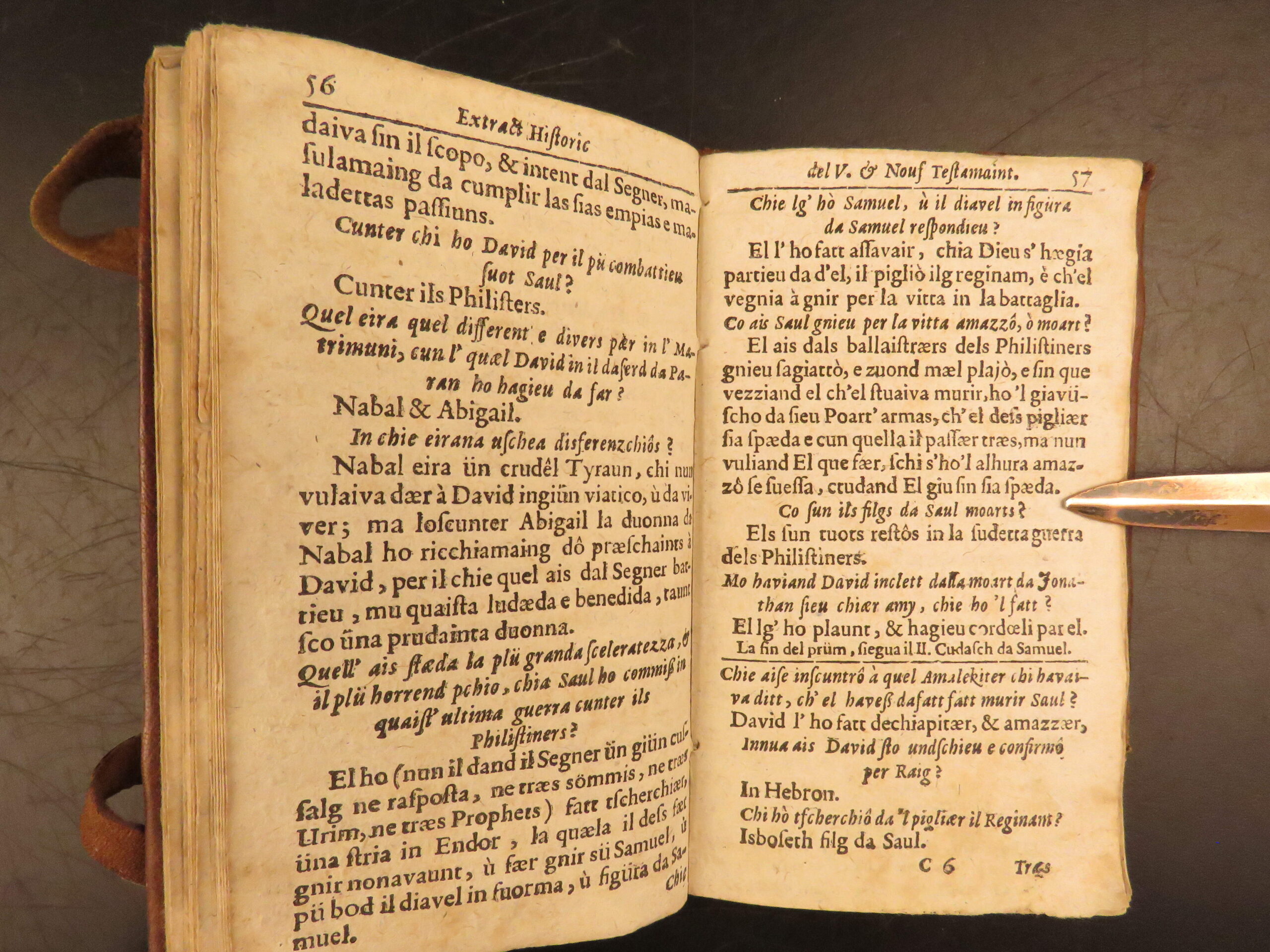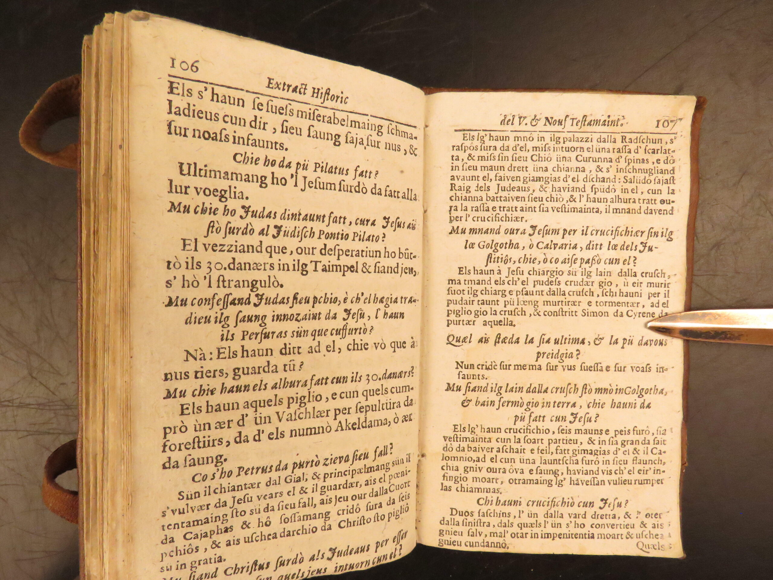 Printed in Cuira in 1719, Wyss’s Extract Historic del Velg e Nouf Testamaint is a structured theological dialogue in Romansh, translated by Juvalta and tied to the Reformed Church.