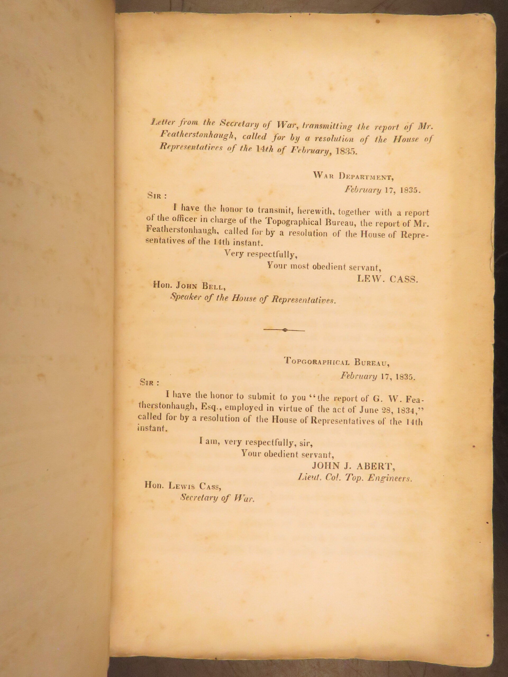 First edition of George William Featherstonhaugh’s 1835 geological report surveying Missouri, Arkansas, and Indian Territory with analysis of strata, fossils, coal, iron, and novaculite, including one large folding map.