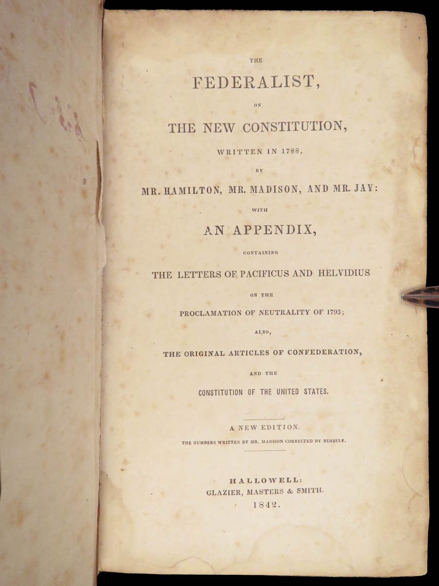 The Federalist by Hamilton, Madison, and Jay, 1842 Maine edition with Pacificus and Helvidius letters, a key text in American constitutional thought.