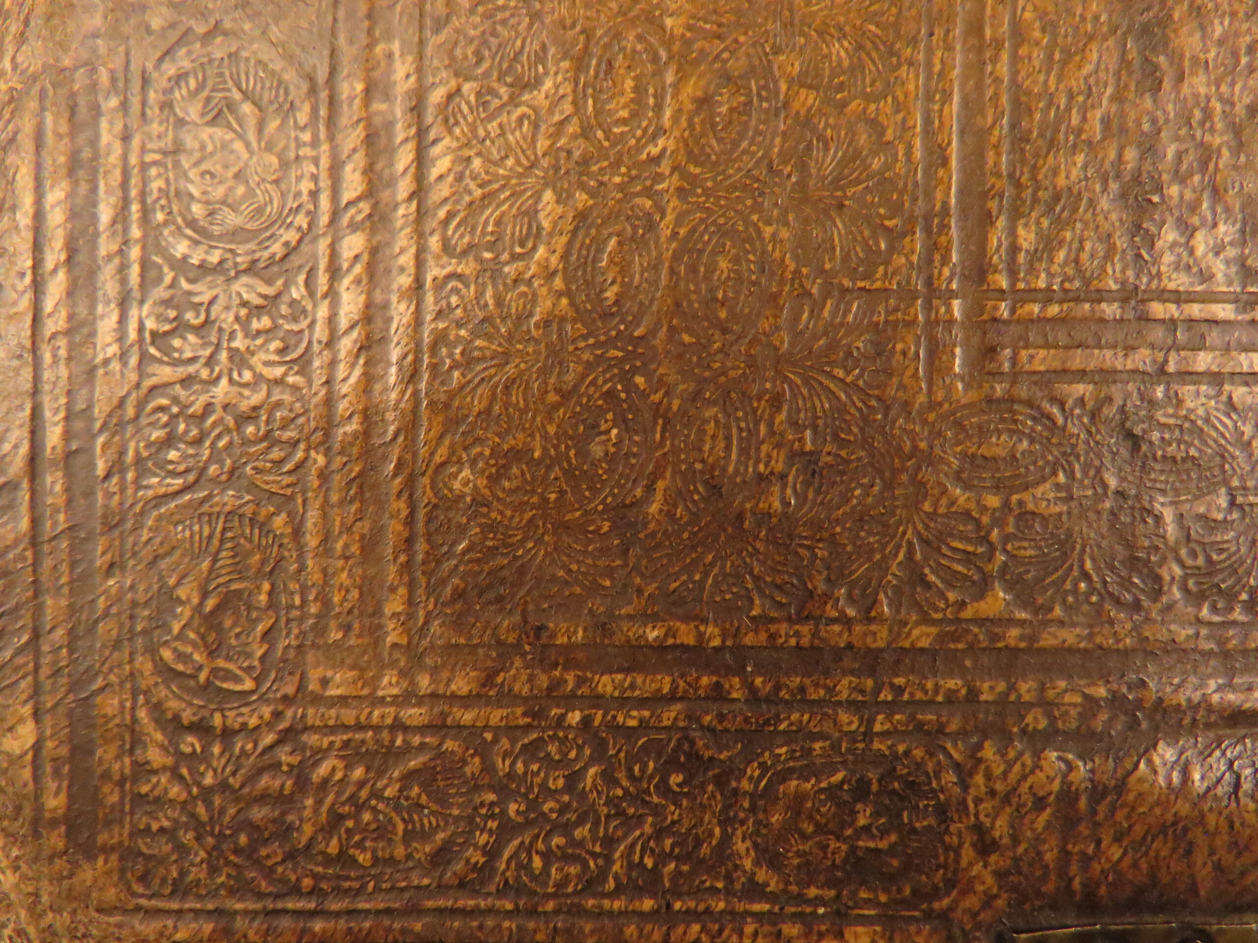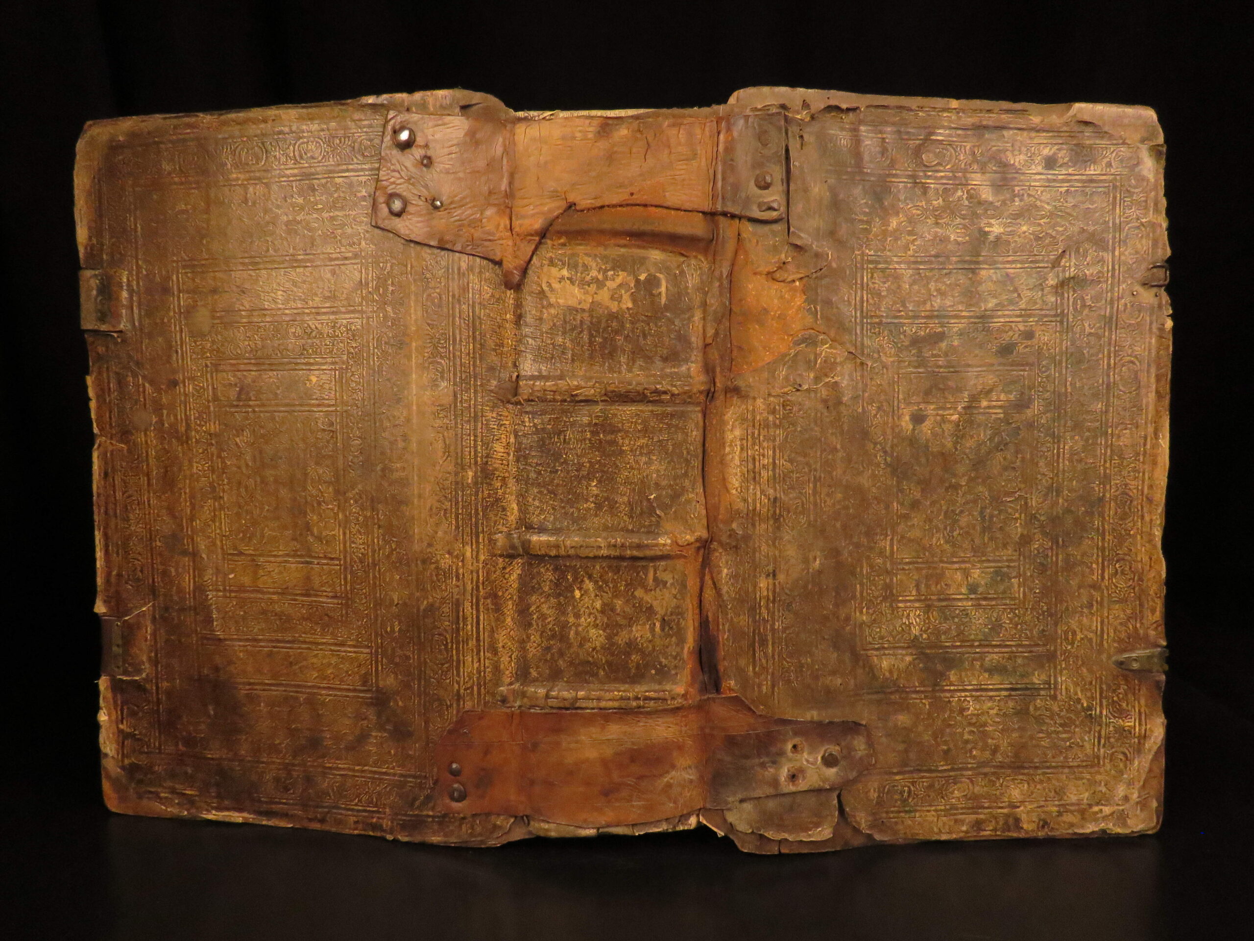 Fair condition. The vellum binding shows edge wear and losses at corners with exposed boards. Leather straps are present. The text block remains intact. The woodcuts and text are well-defined with visible signs of age but remain legible.
