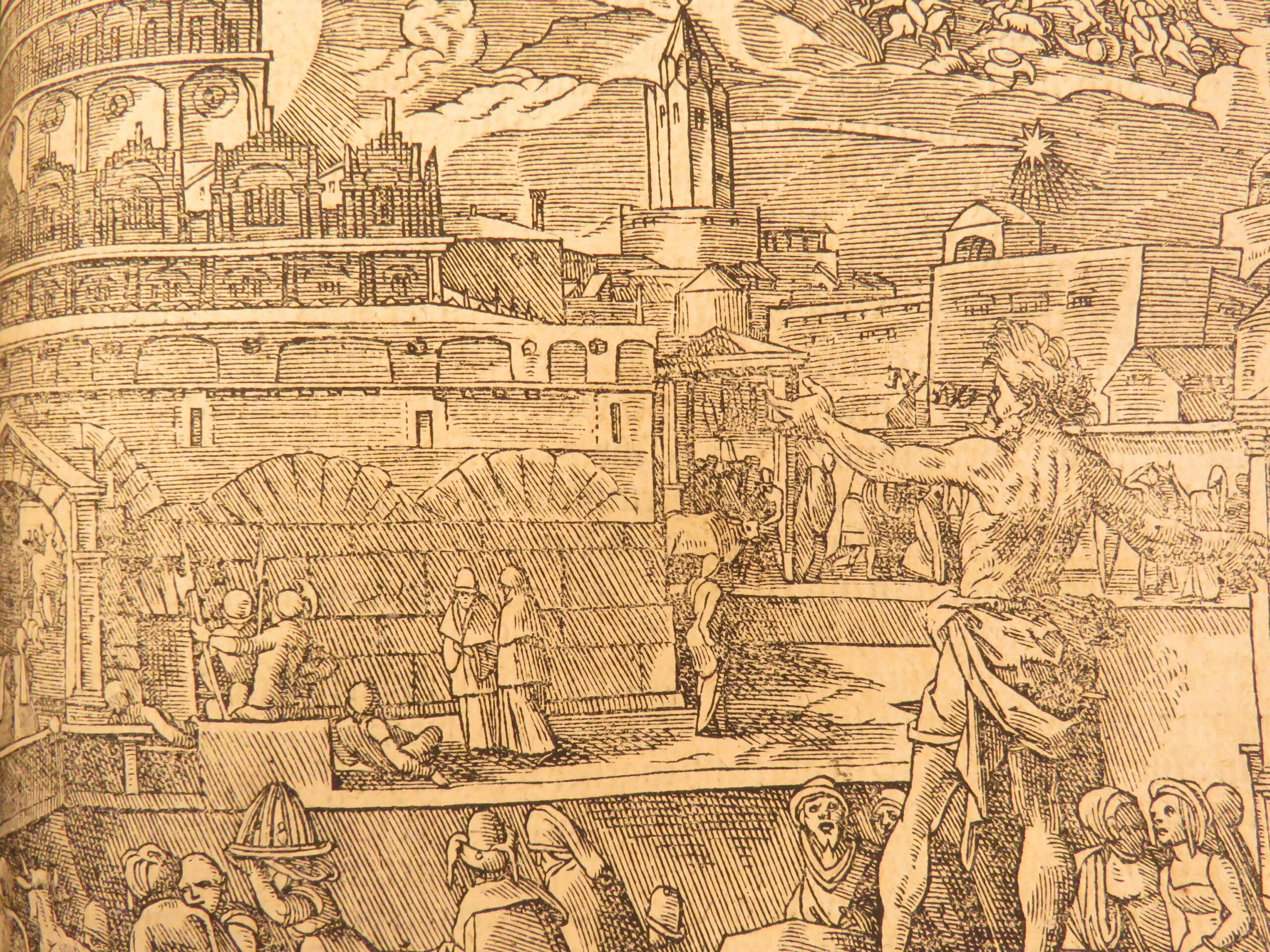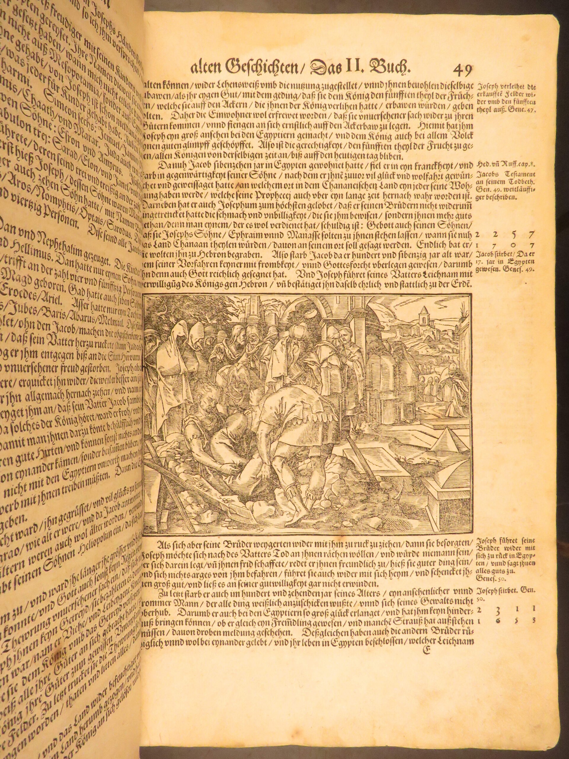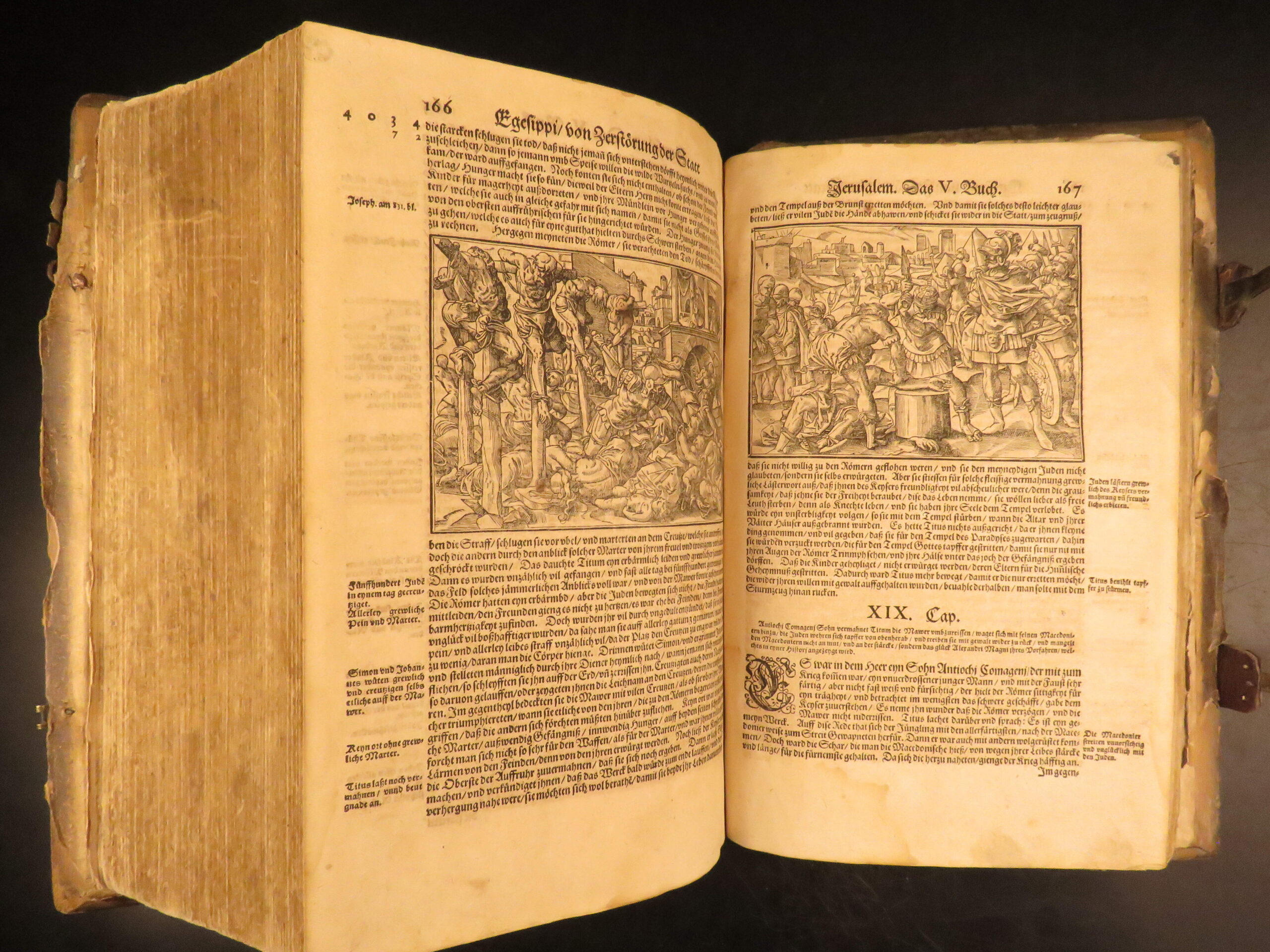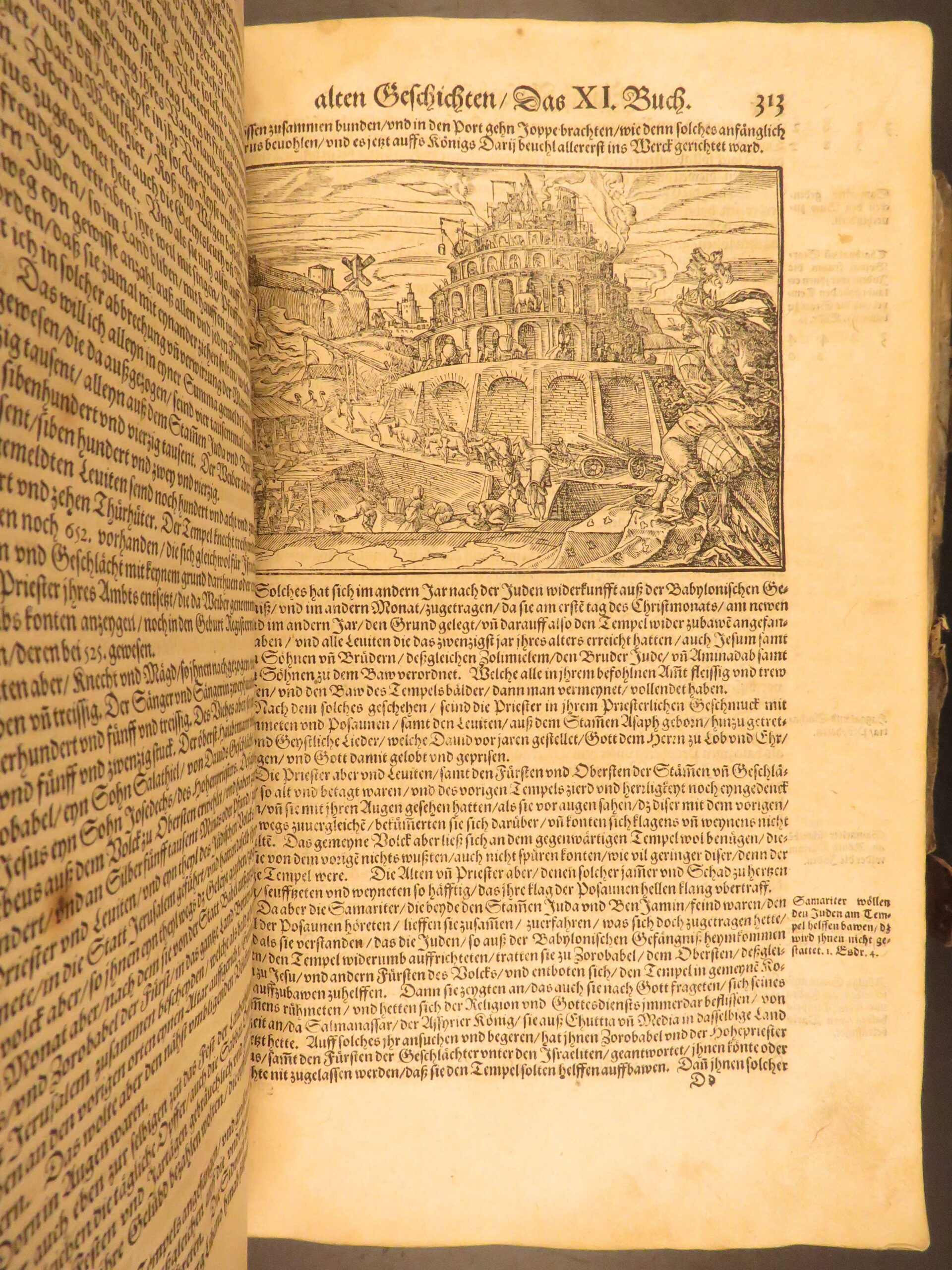This enormous 16th-century folio features a German translation of Josephus from Conrad Lautenbach. It is notable, not only for its size, but also for the woodcut illustrations throughout. Worth noting, the engraving of the Tower of Babel is quite desirable in this edition.