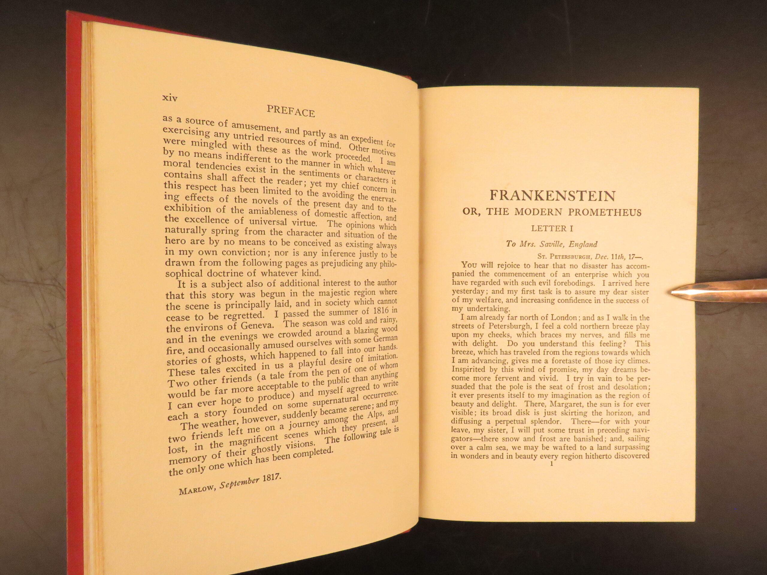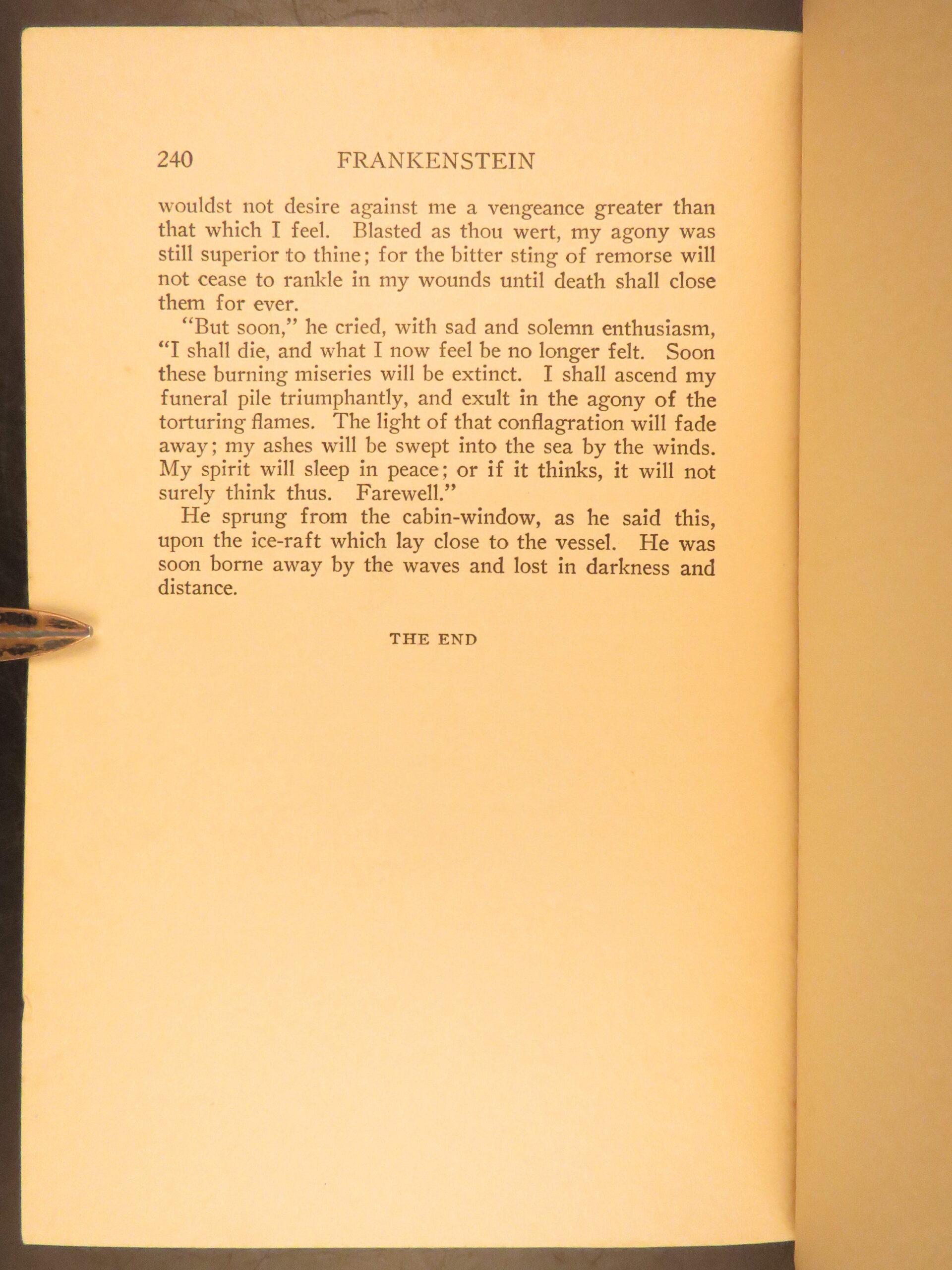 Mary Shelley’s Frankenstein has long been considered a cornerstone of classic Gothic horror and lauded as the first true science fiction novel. Since its extremely limited publication in 1818, the grotesque and tragic tale of a mad scientist’s efforts to “play God” and create the ideal man has horrified and intrigued readers in equal measures. The story questions the true nature of man, warns against the dangers of hubris, and highlights the responsibilities that are inherent in the act of creation. The novel has inspired numerous adaptations, including the 1931 Universal Pictures film, which was released prior to the enforcement of the Hayes Code censorship guidelines for motion pictures. This highly-collectable first photoplay edition features full-page stills from the movie famously starring Boris Karloff as Frankenstein’s Monster.