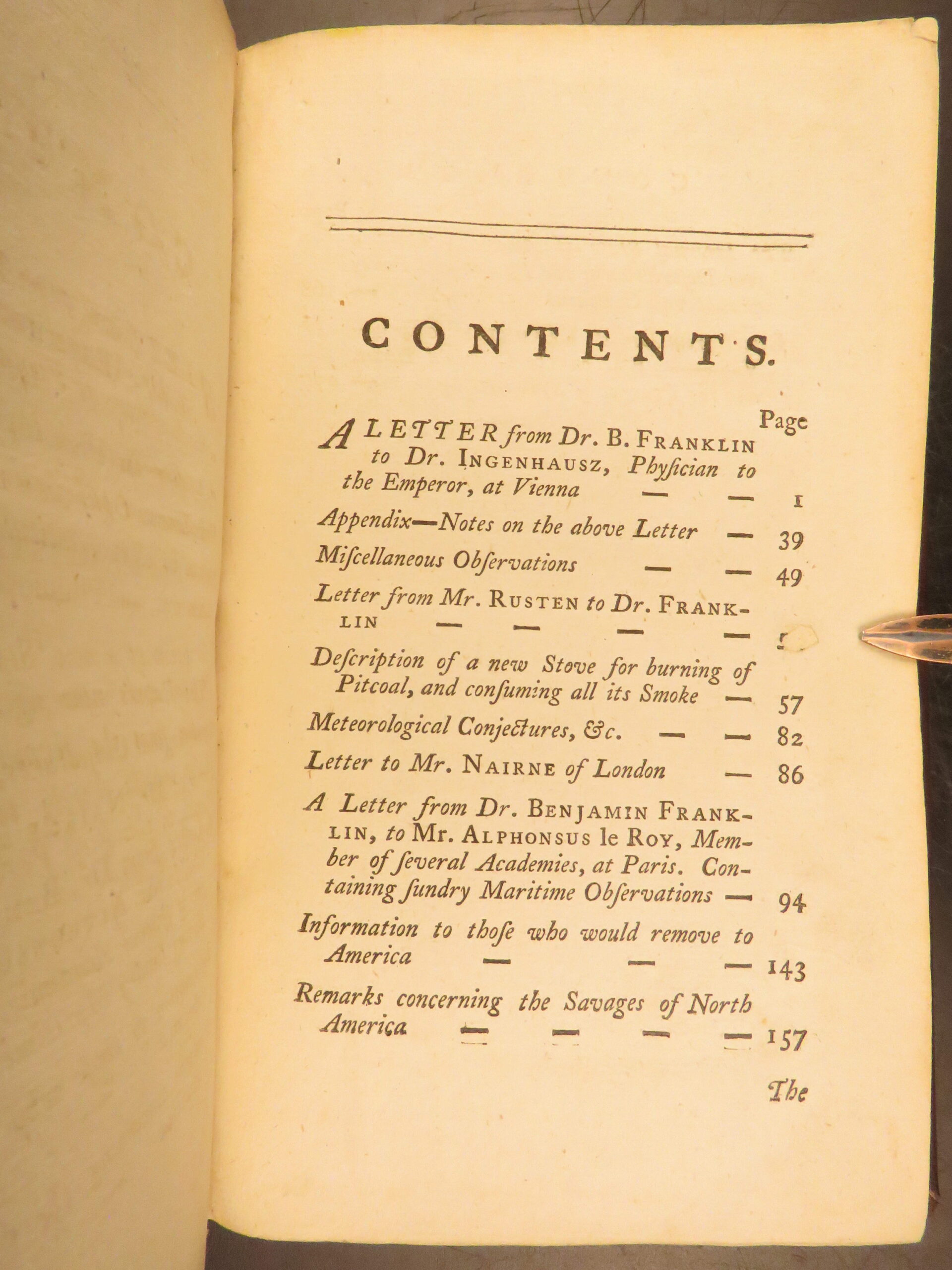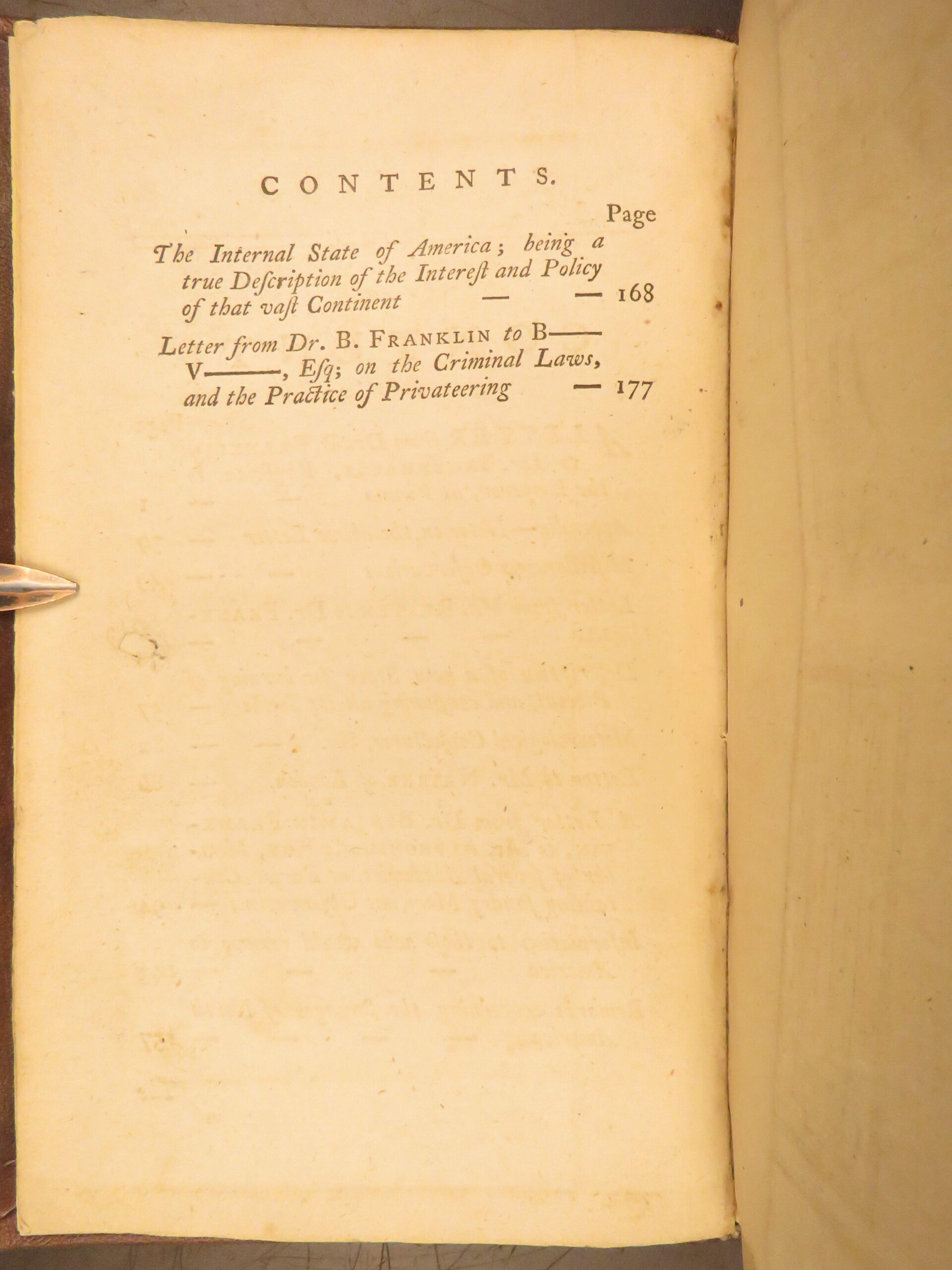 It is, however, the inclusion of Remarks Concerning the Savages of North America that sets this edition apart from other collections of Franklin’s work. In this essay, Franklin counters stereotypes of Native tribes with examples from the Susquehanna, Onondaga, and Six Nations on their agreeableness and willingness to have civil debate.