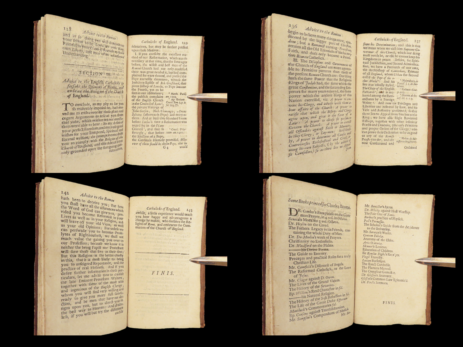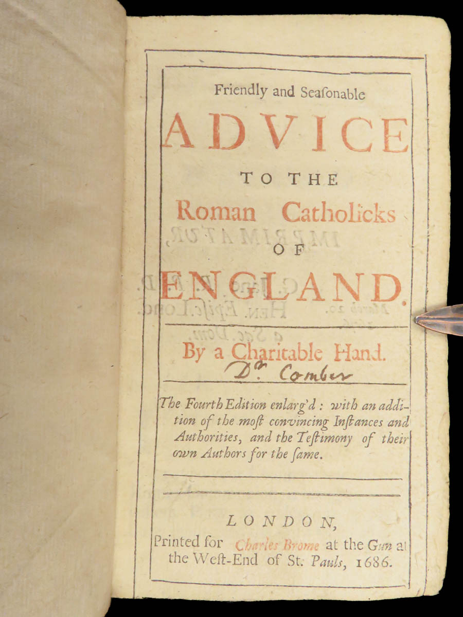 Thomas Comber’s Friendly and Seasonable Advice to the Roman Catholicks of England (London, 1686), challenges Catholic authority through scriptural and patristic arguments within Anglican tradition.