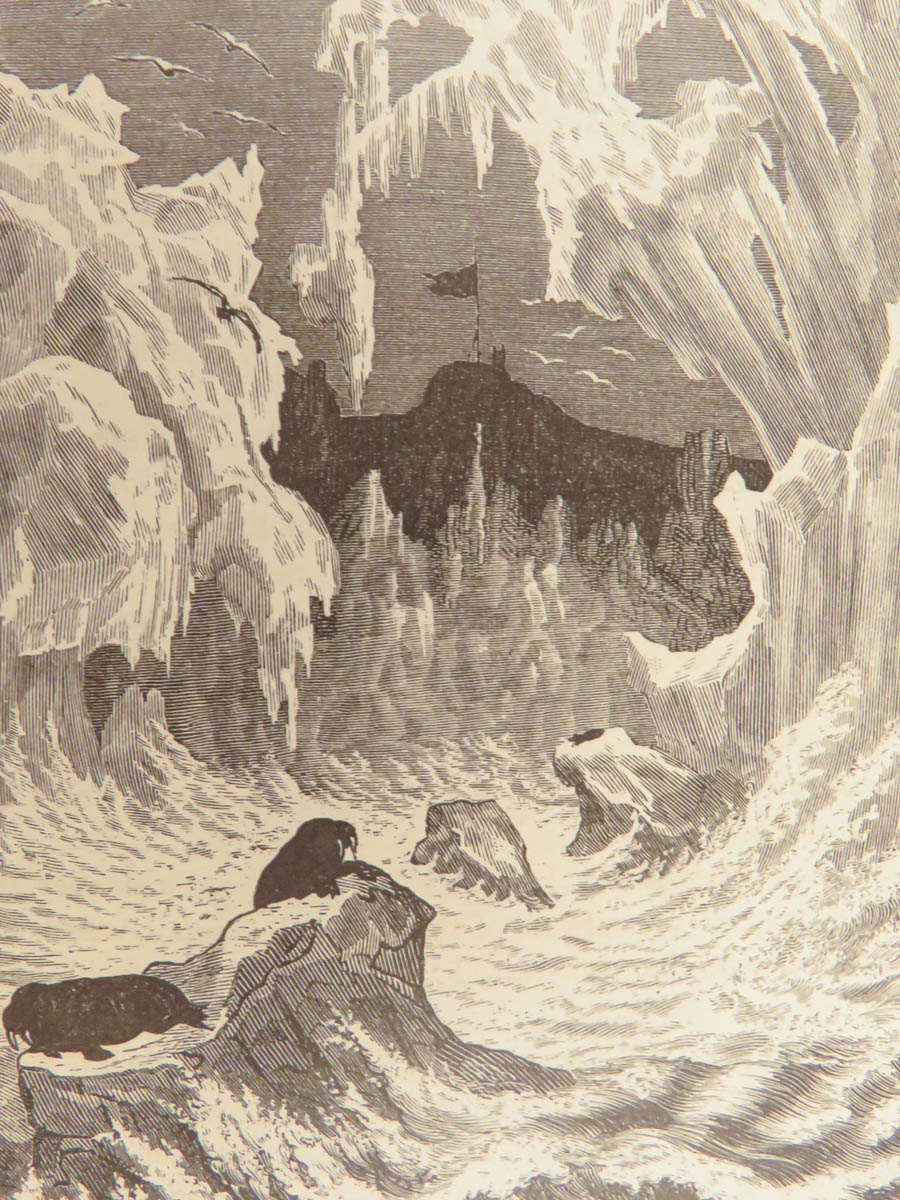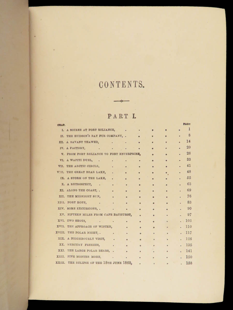This first American edition of The Fur Country; Or, Seventy Degrees North Latitude by Jules Verne is a prime example of the speculative fiction and scientific adventure for which the author became famous. The narrative follows an expedition by the Hudson’s Bay Company to establish a fort north of the Arctic Circle, when an earthquake leaves them adrift on an iceberg where all laws of physics seem to be altered. The novel explores themes of the illusory permanence of land in the polar regions and colonial geopolitics, and while the tale is one of Verne’s lesser-known works, the story’s environmental undertones have gained renewed relevance amid contemporary climate discourse. Issued just one year after the French original, the text was translated to English by Nancy Bell under the pseudonym N. D’Anvers. Bell’s work, which was occasionally known for taking liberties in interpretation, contributed heavily to the popularity of Verne’s early readership.