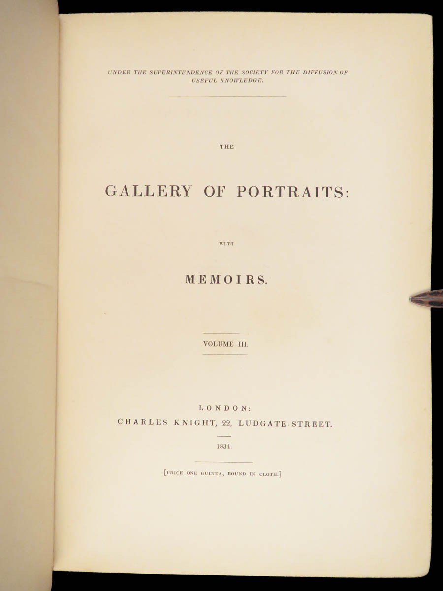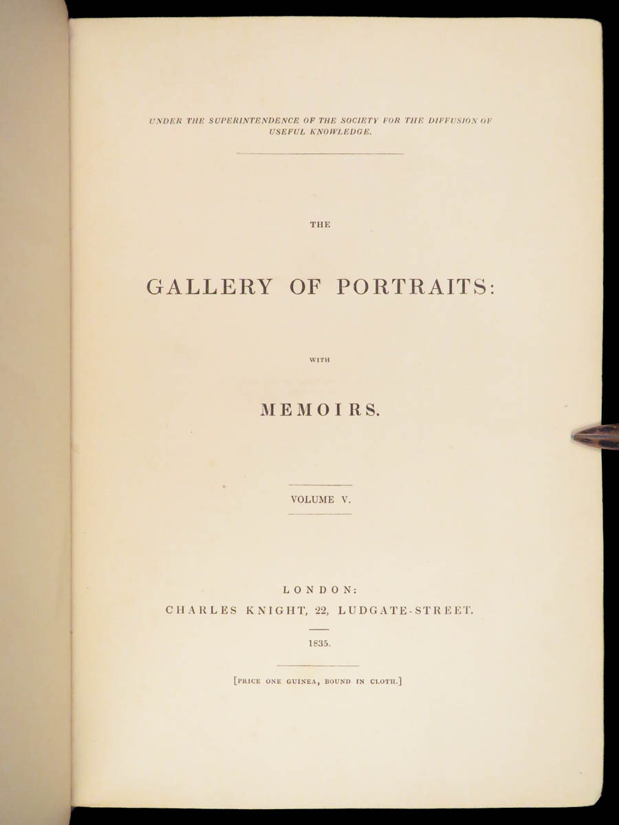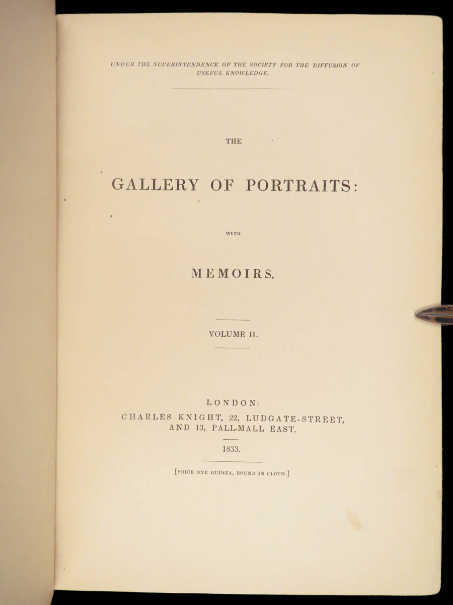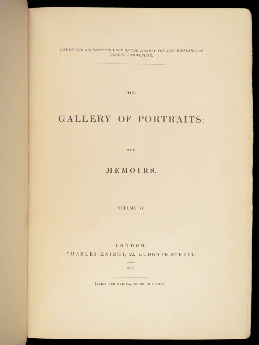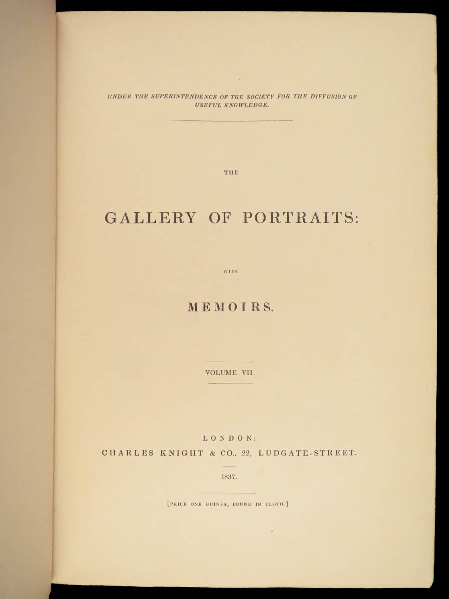 The Gallery of Portraits with Memoirs by Arthur Thomas Malkin was published in London in 1833 under the supervision of the Society for the Diffusion of Useful Knowledge. This first edition by Charles Knight is presented in seven volumes. Founded in 1826 at the instigation of Lord Brougham, the Society aimed to expand access to learning for readers outside traditional institutions.