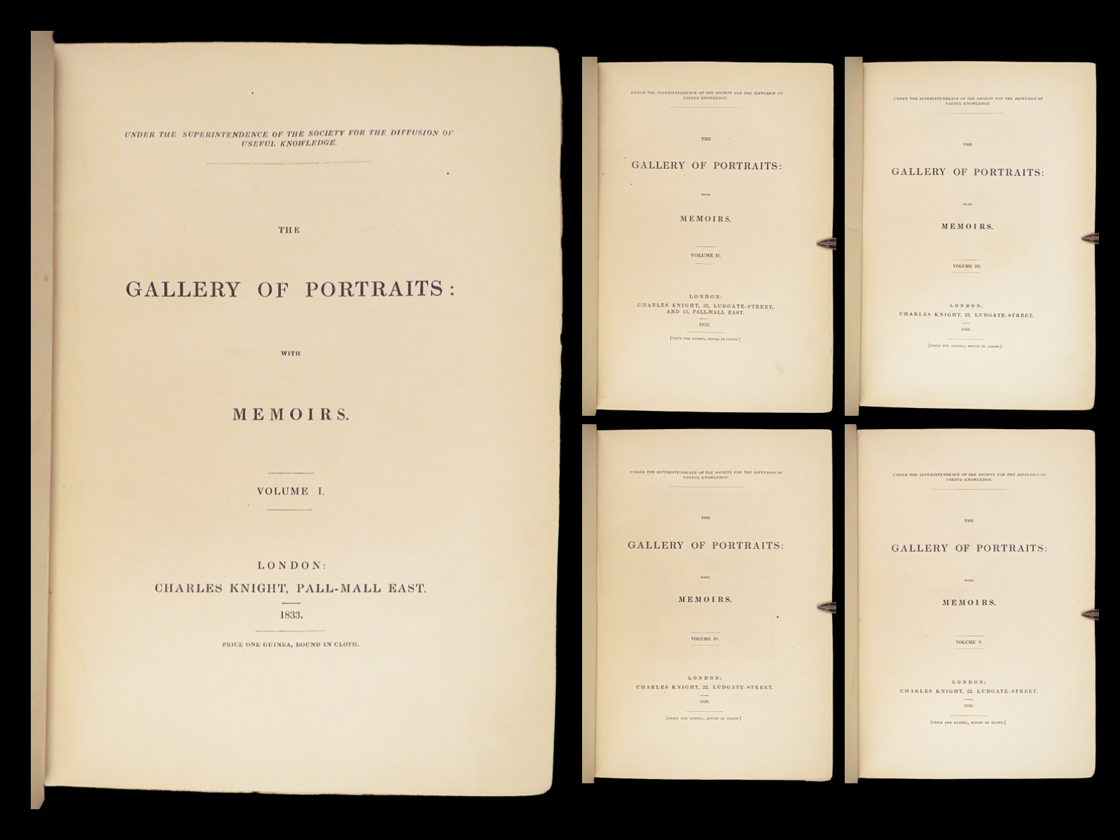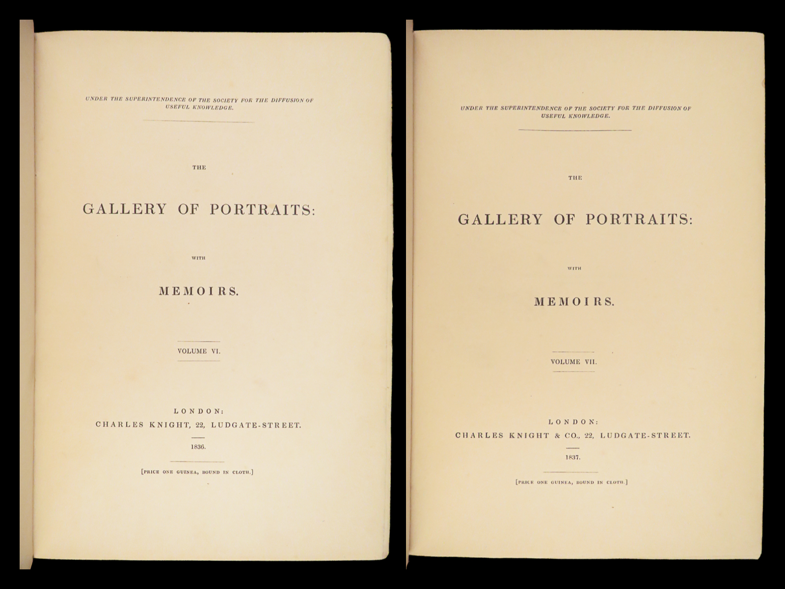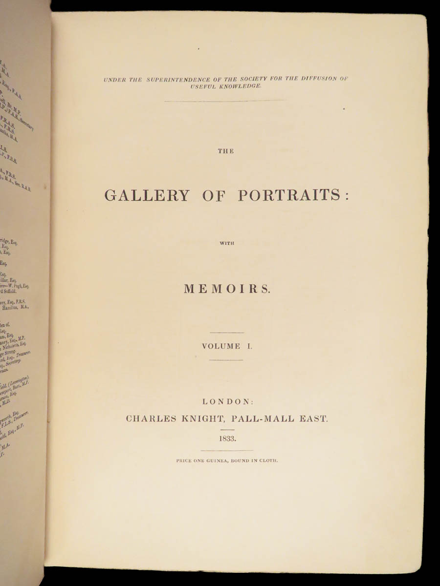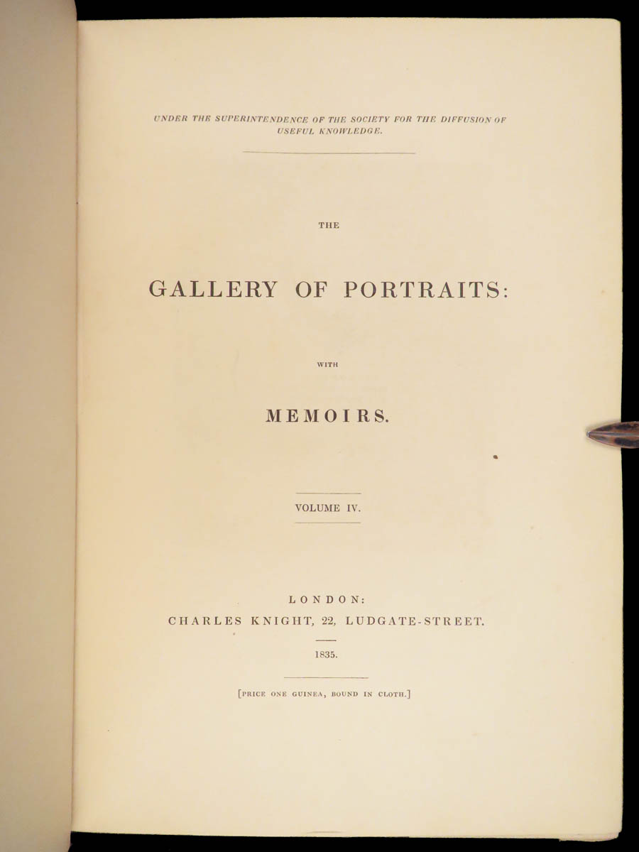 The Gallery of Portraits with Memoirs by Arthur Thomas Malkin was published in London in 1833 under the supervision of the Society for the Diffusion of Useful Knowledge. This first edition by Charles Knight is presented in seven volumes. Founded in 1826 at the instigation of Lord Brougham, the Society aimed to expand access to learning for readers outside traditional institutions.