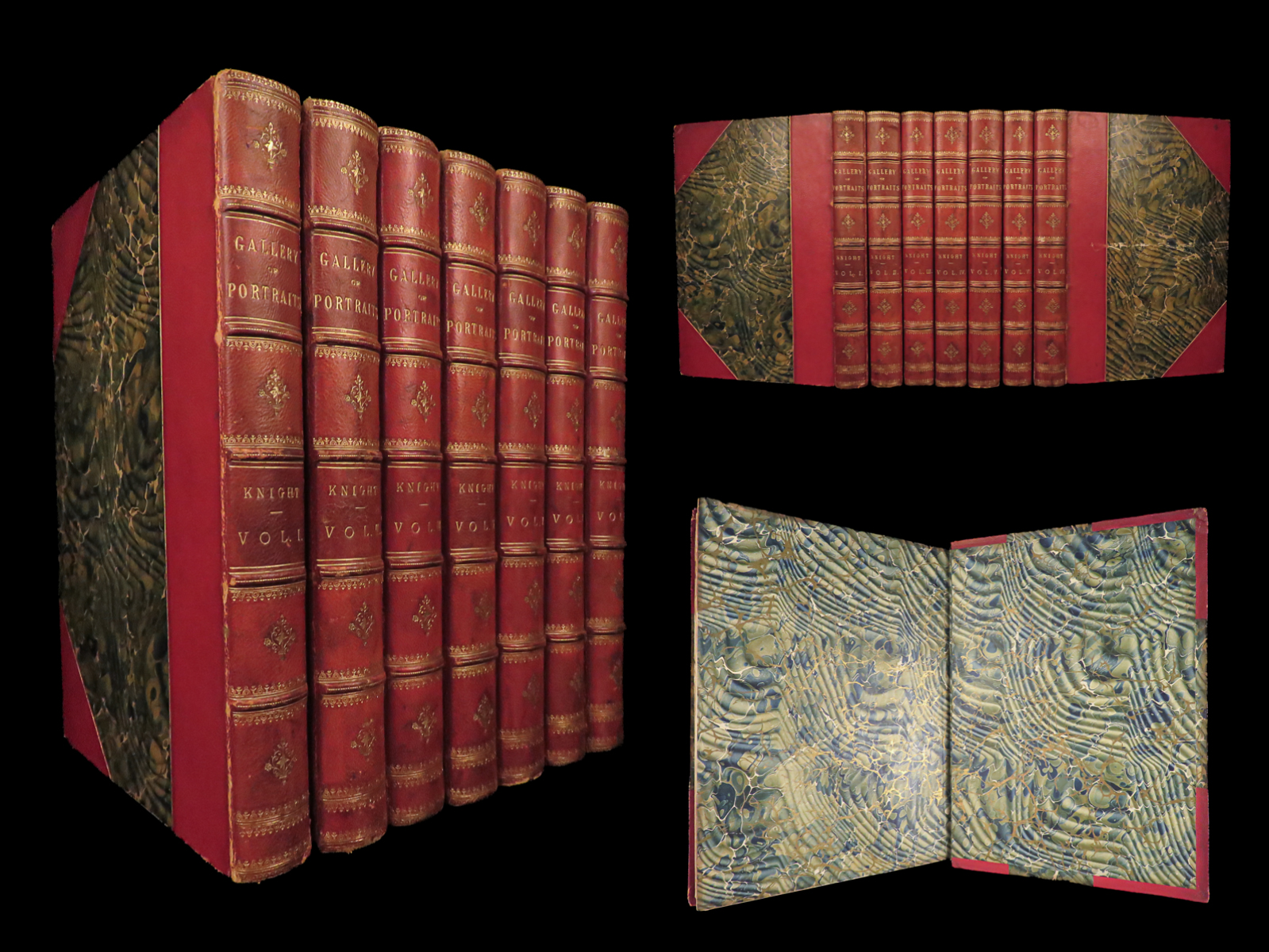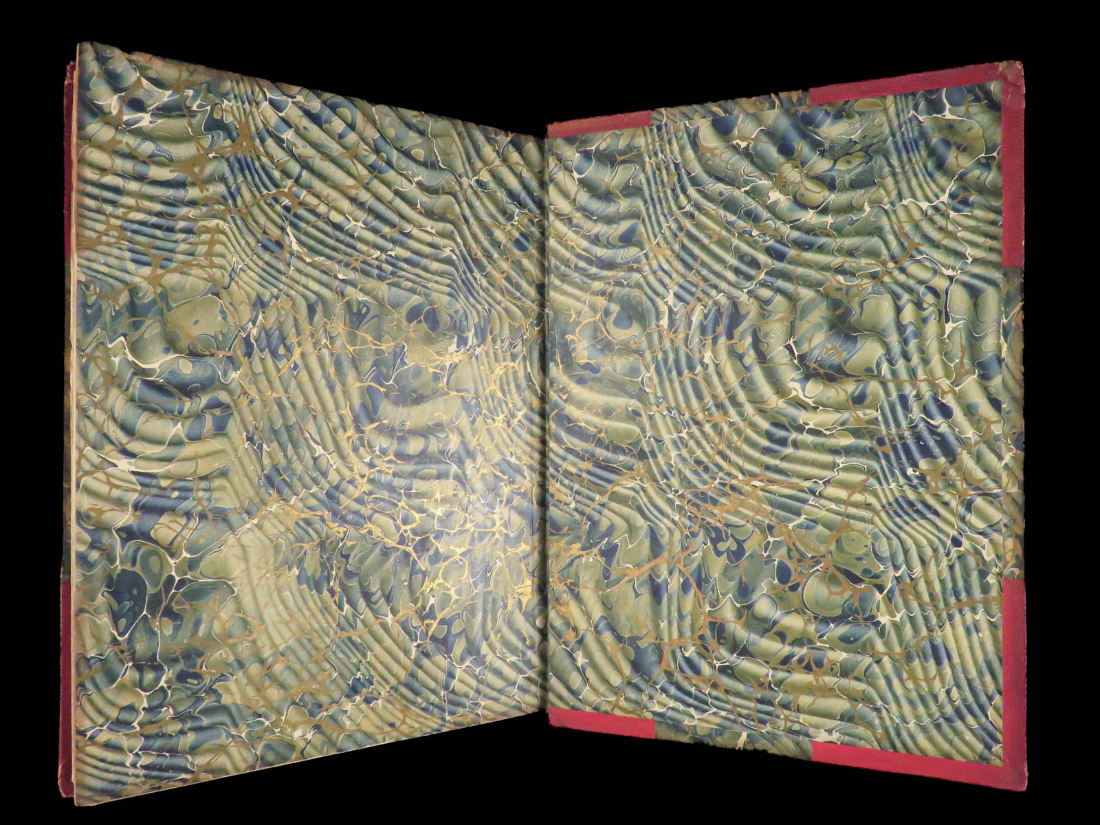 - Binding: Red leather, green-marbled boards