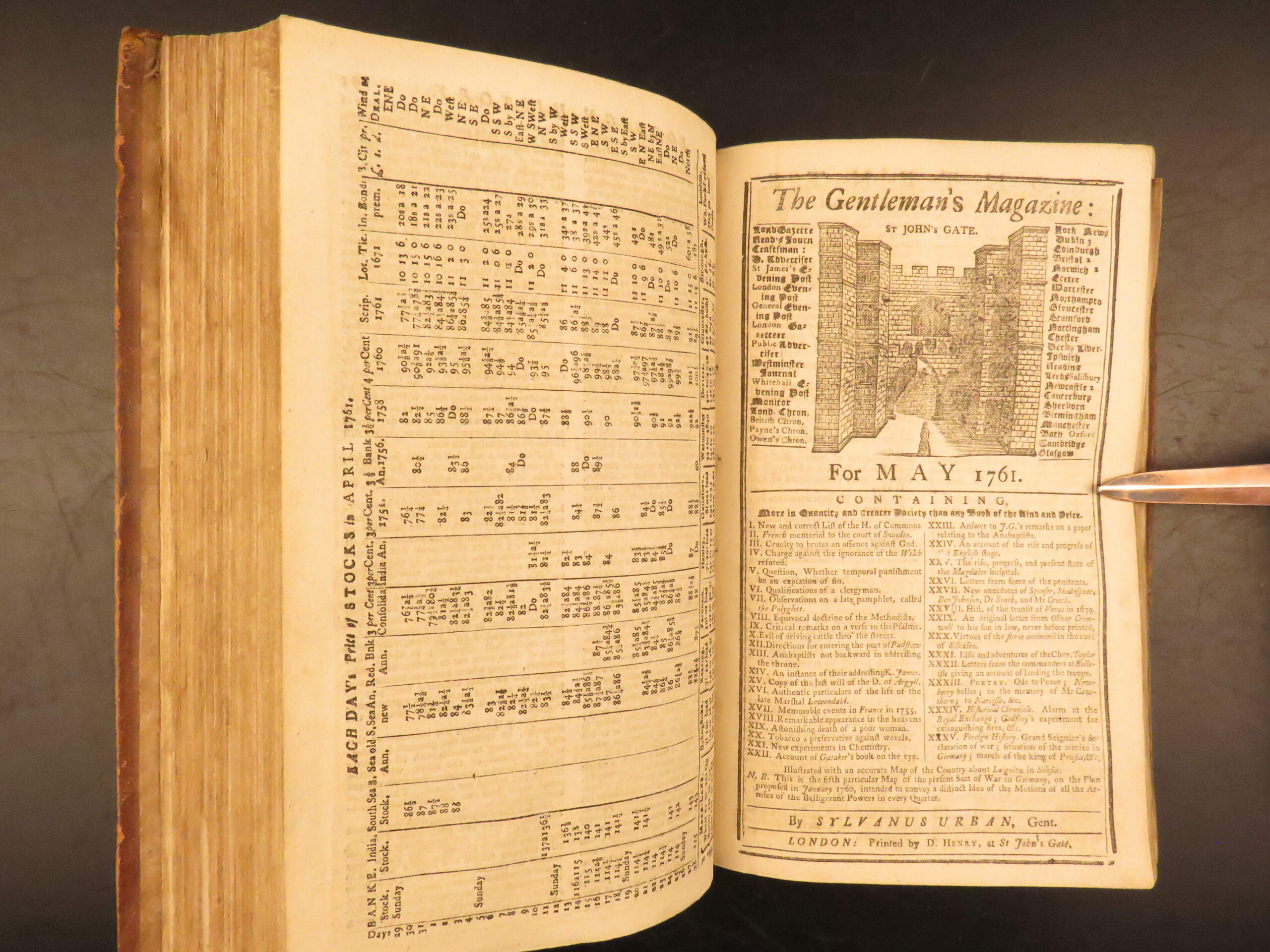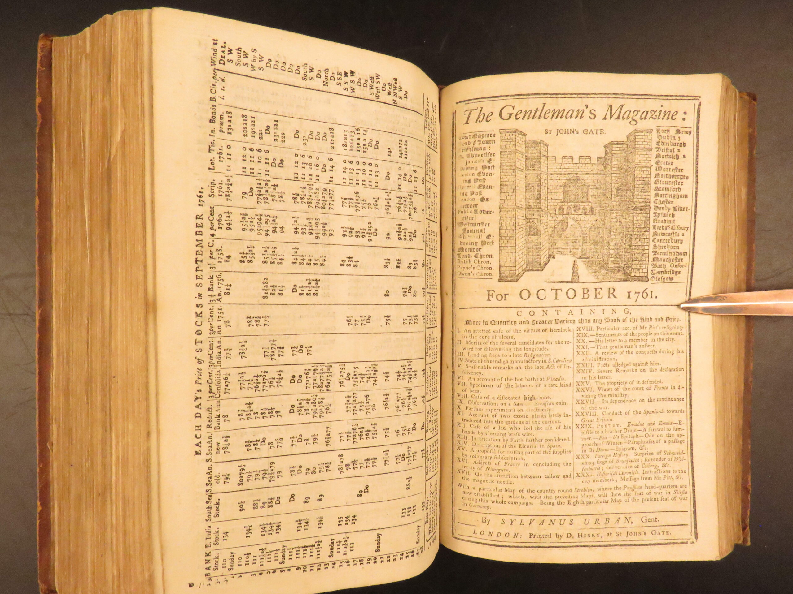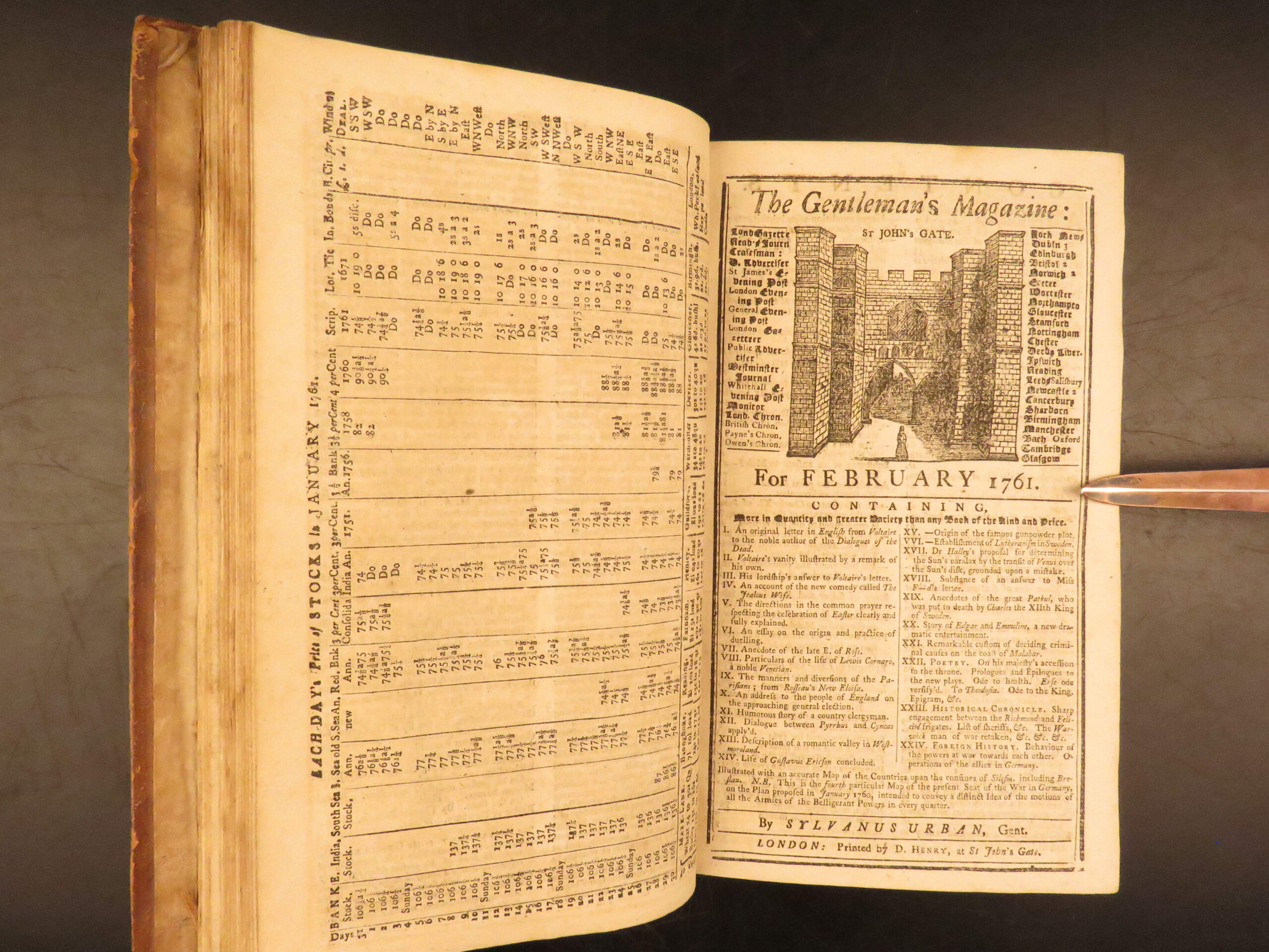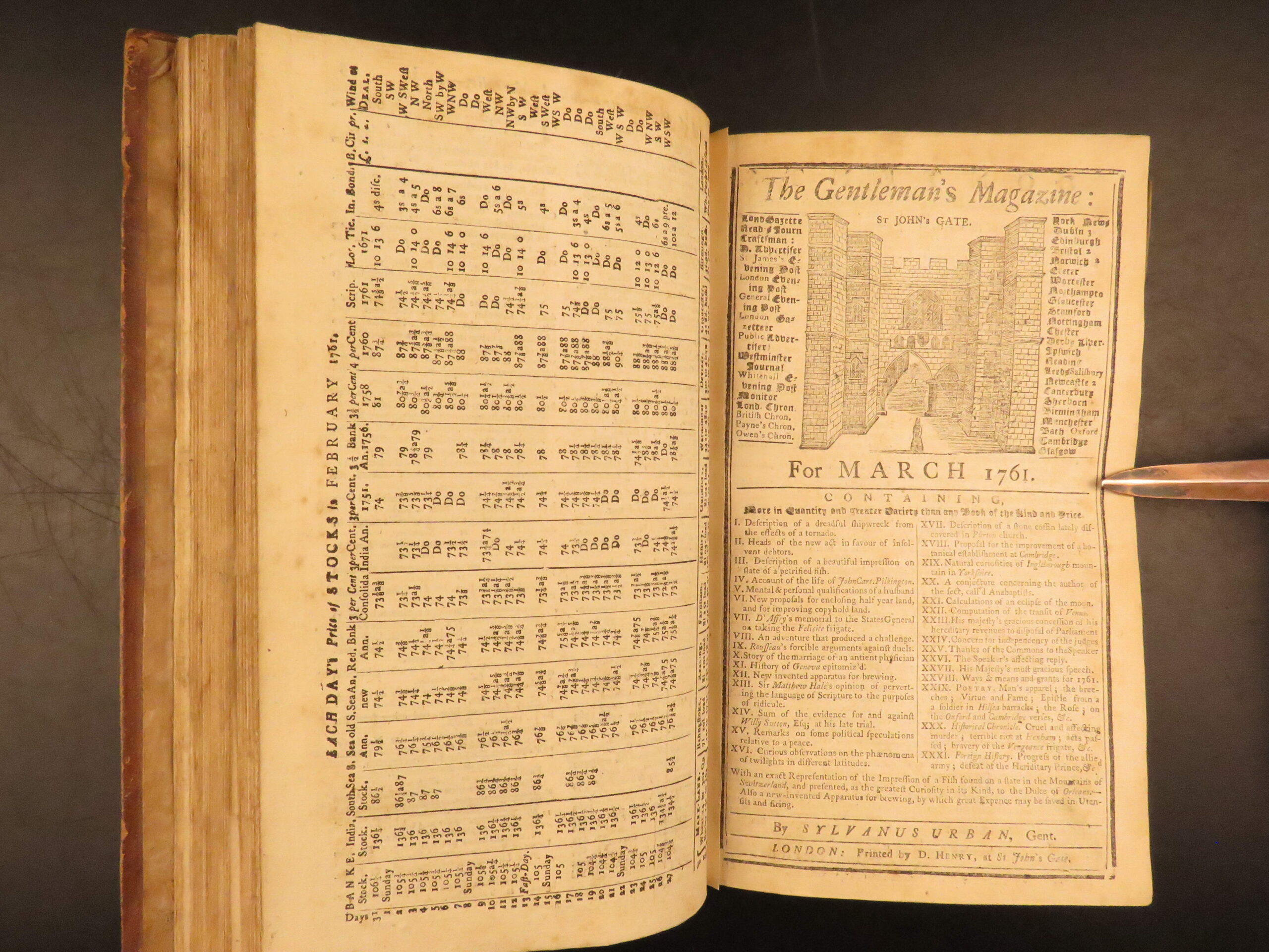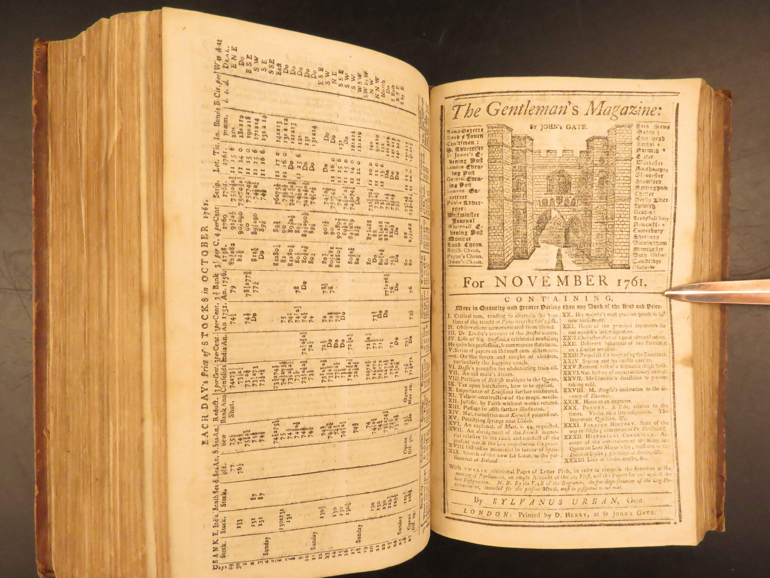 First edition of Sylvanus Urban’s Gentleman’s Magazine (1761), with engraved plates and maps covering naval, colonial, and scientific subjects; original leather binding with signs of wear.