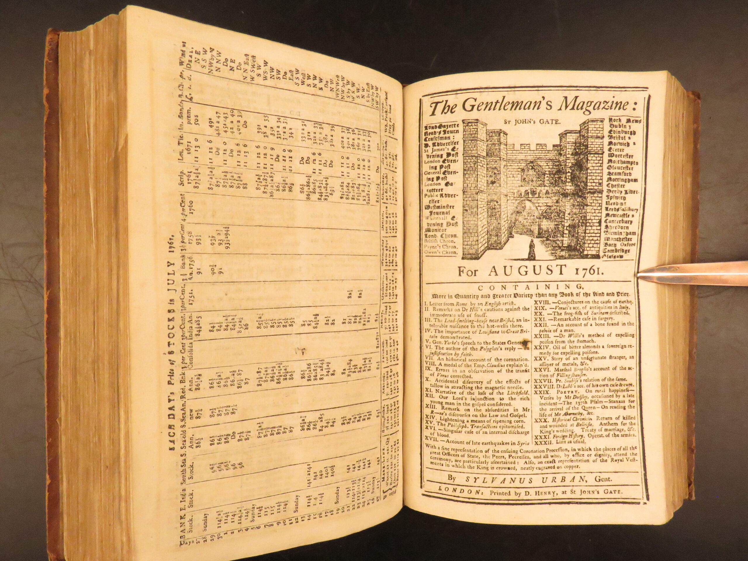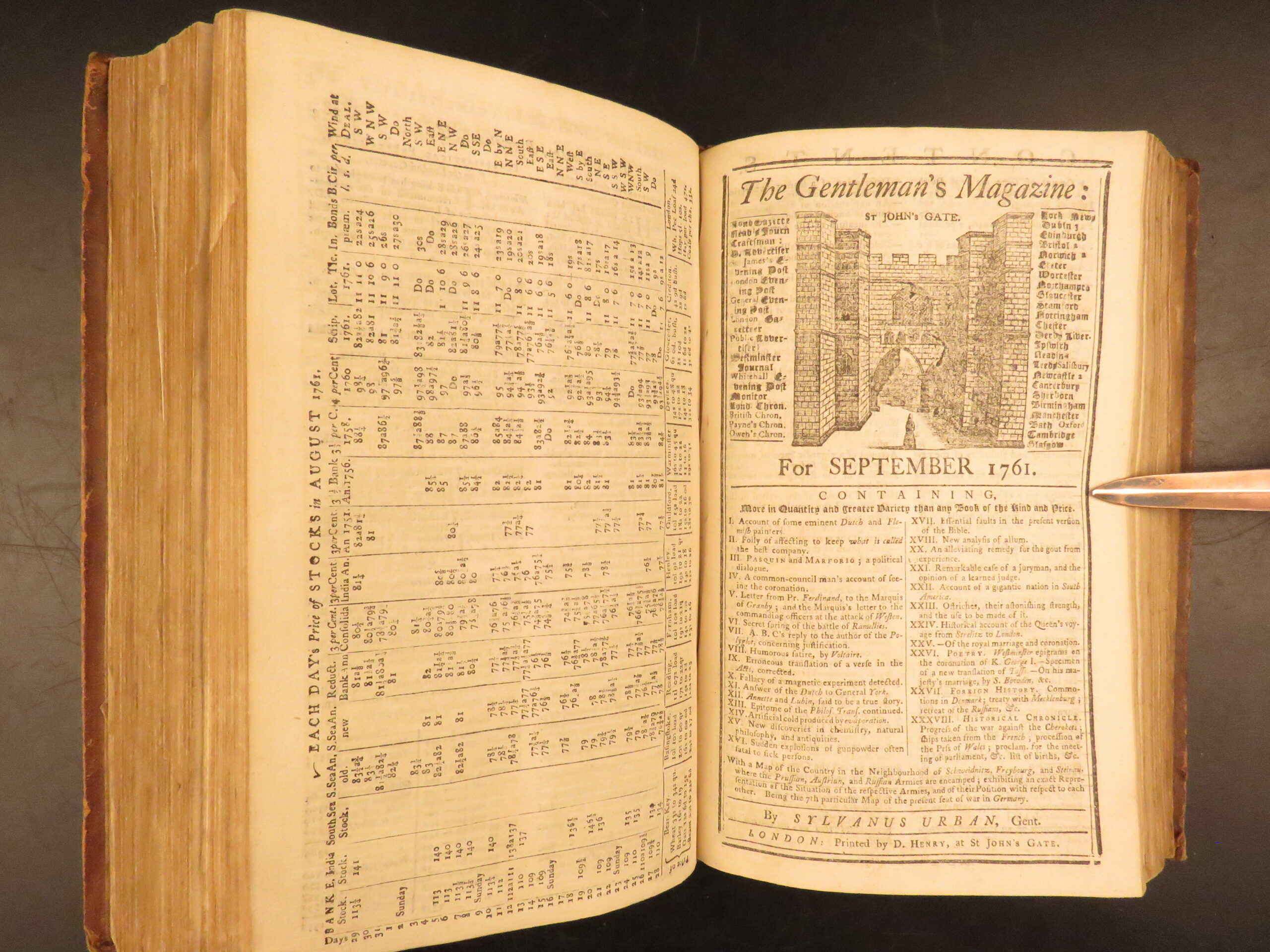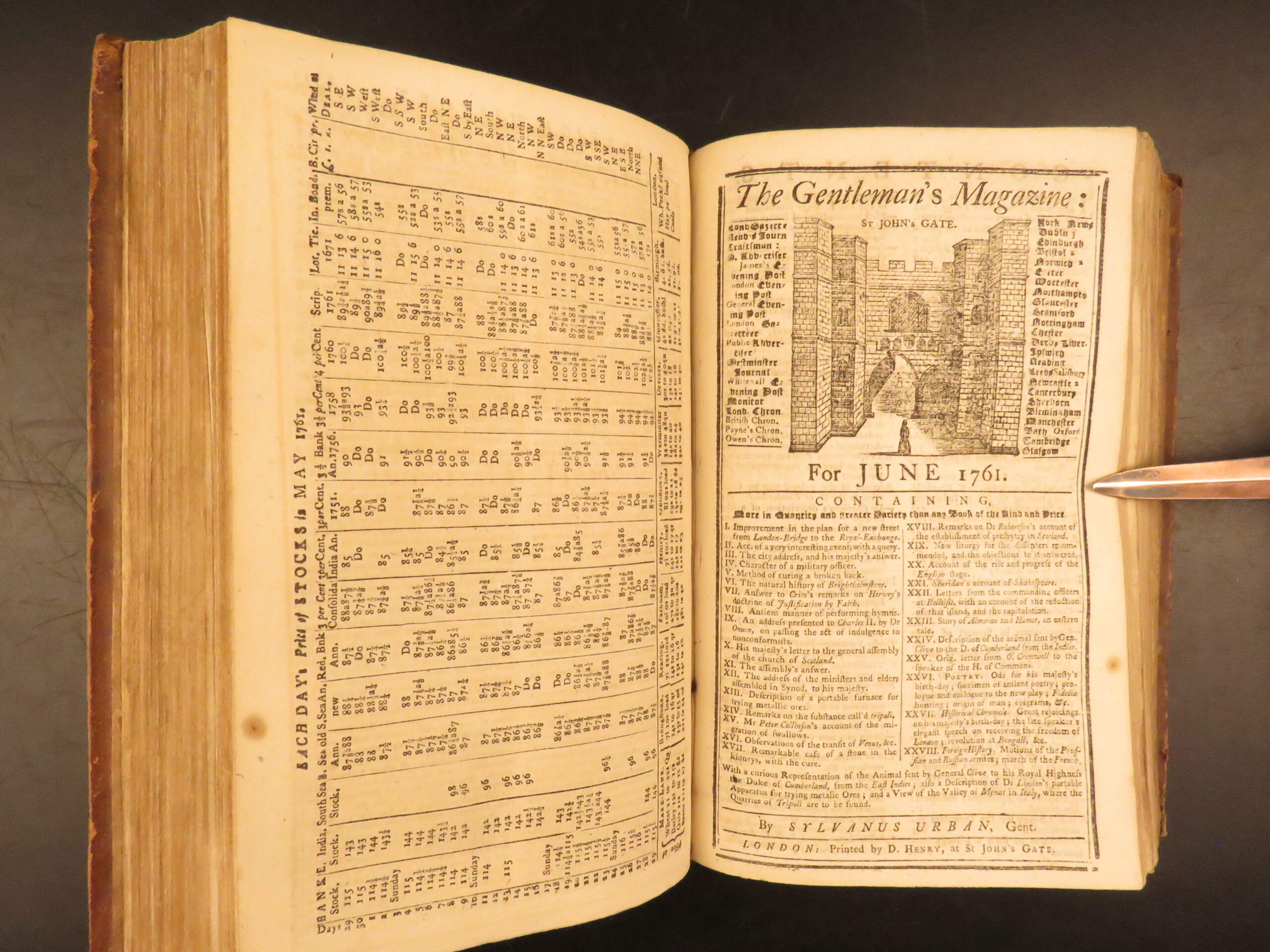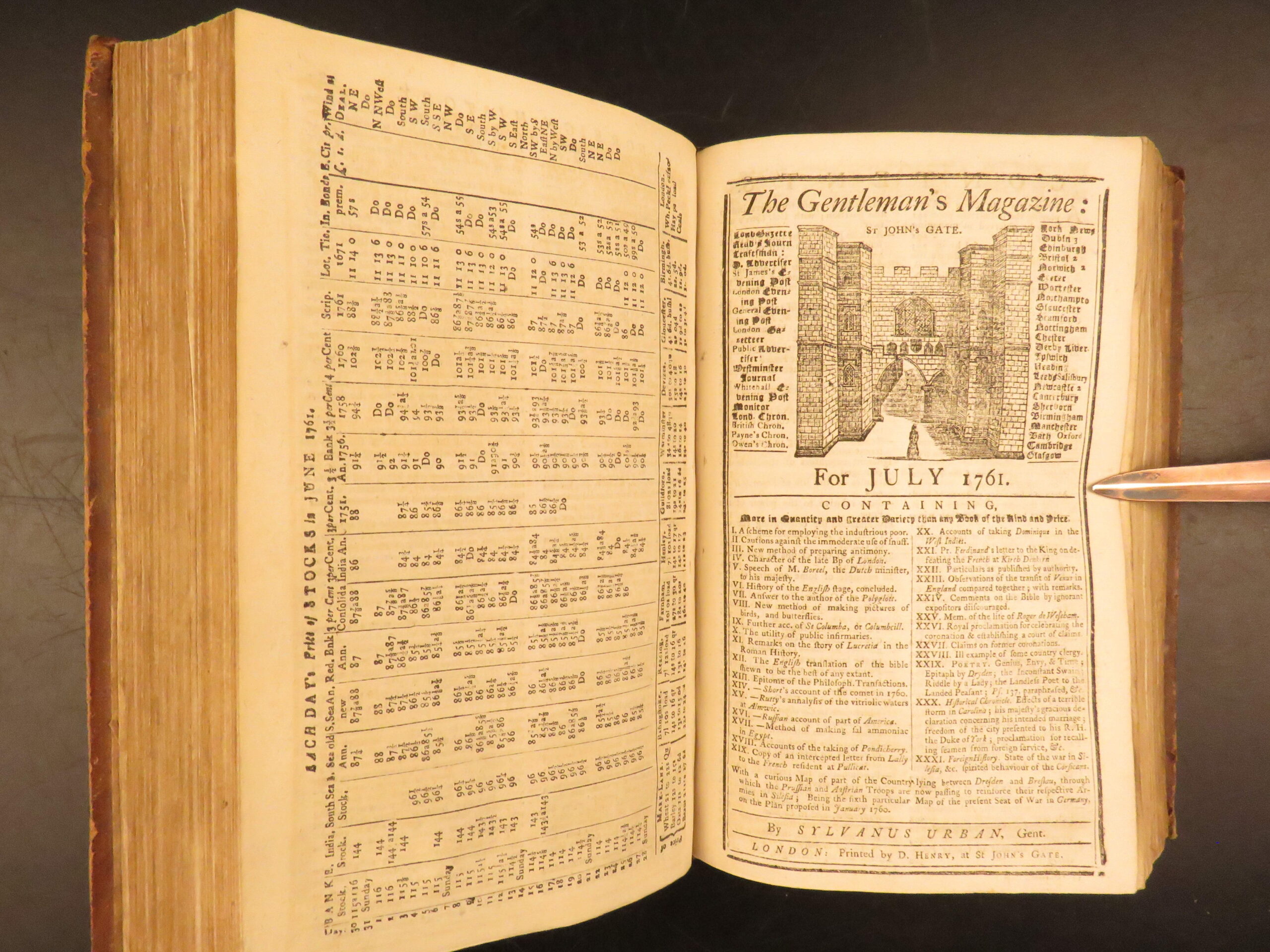 First edition of Sylvanus Urban’s Gentleman’s Magazine (1761), with engraved plates and maps covering naval, colonial, and scientific subjects; original leather binding with signs of wear.