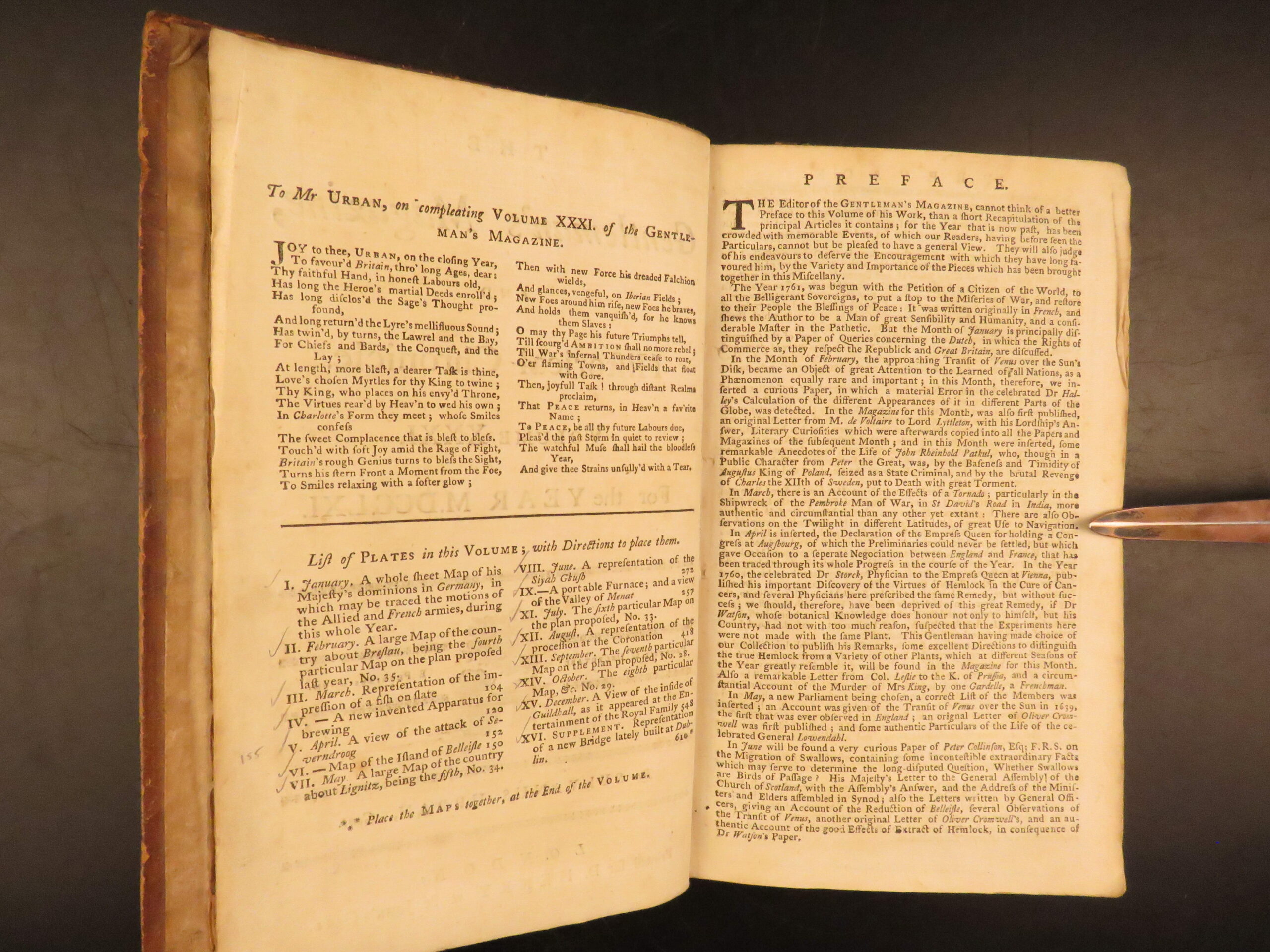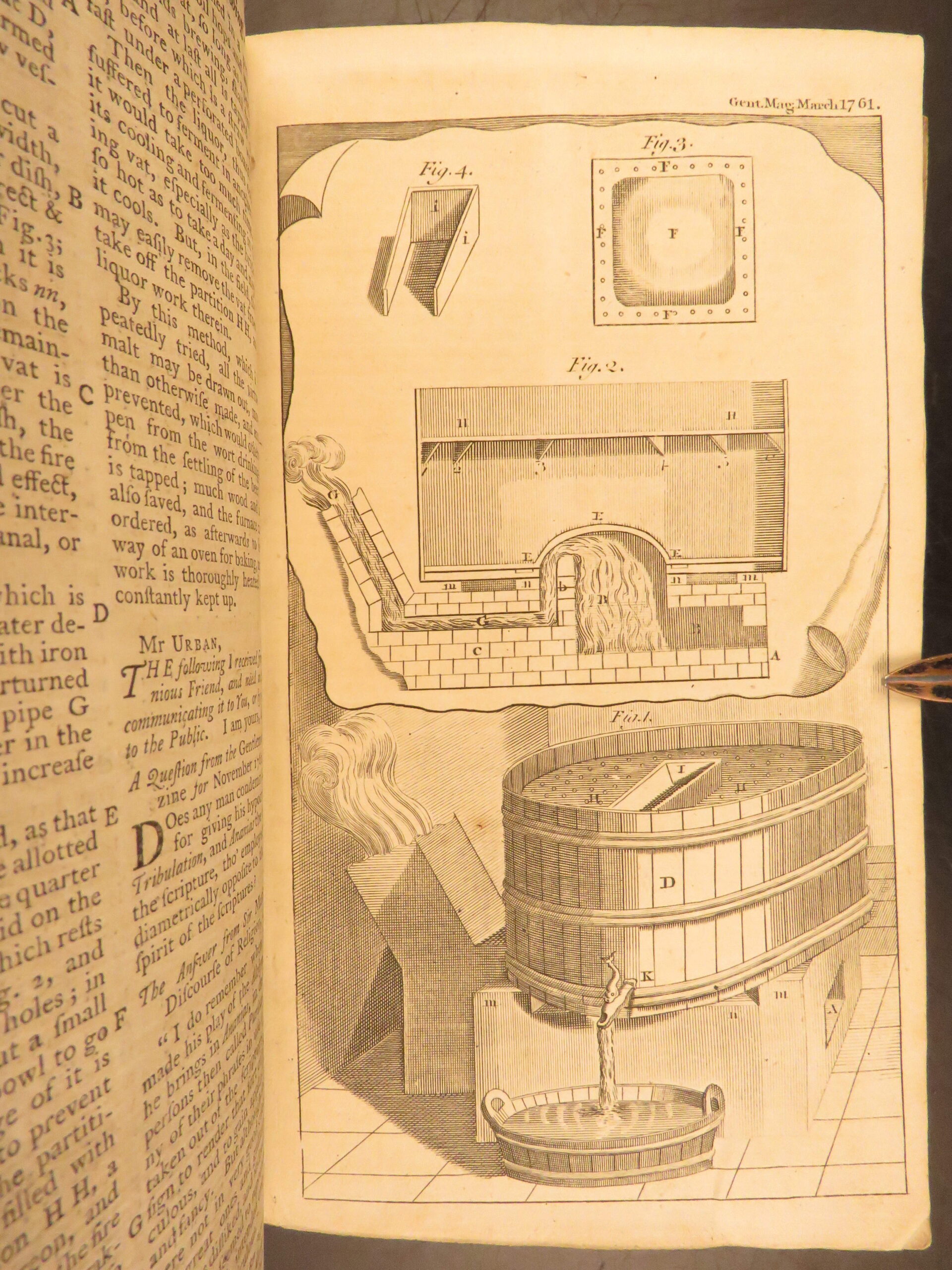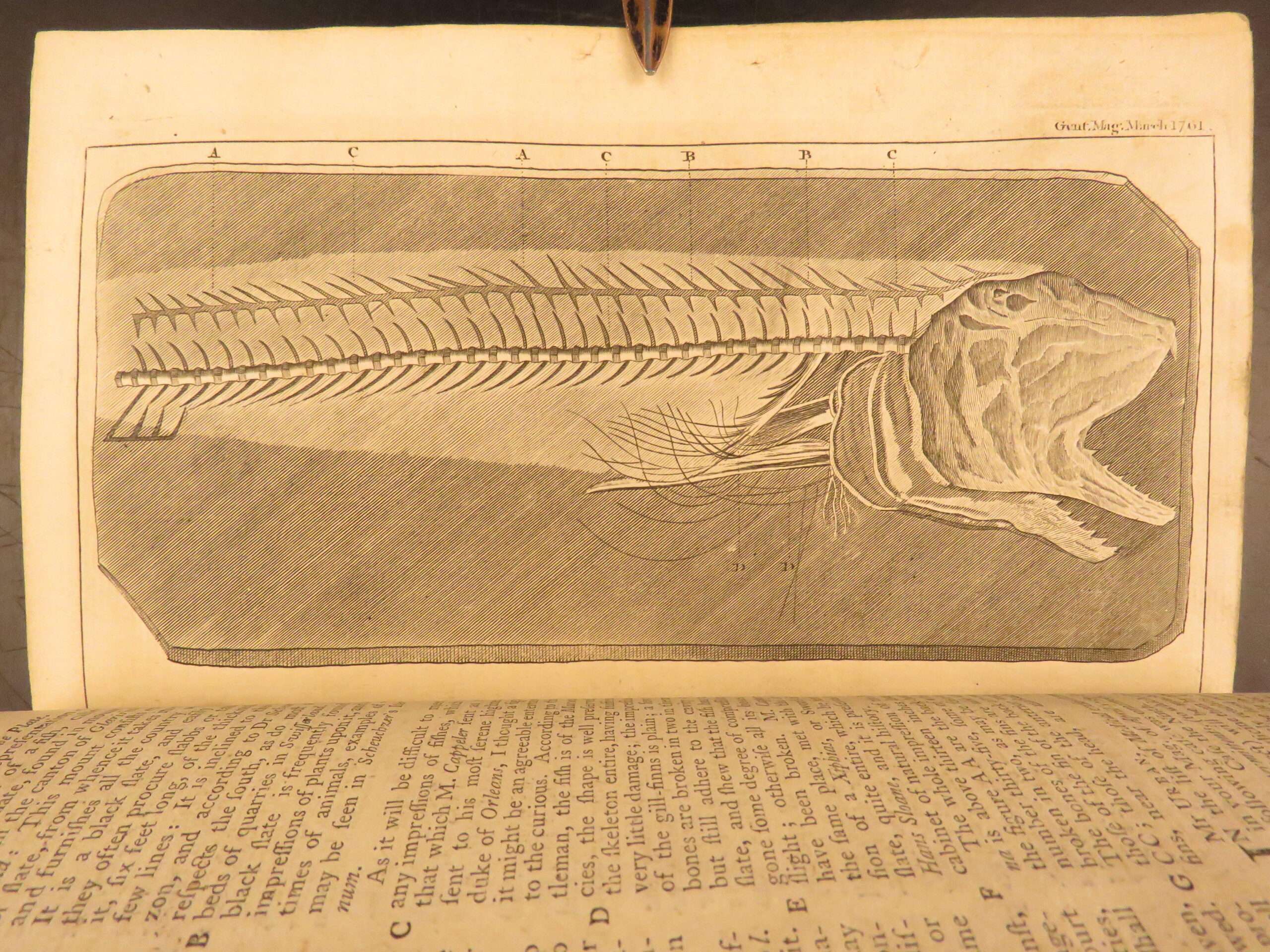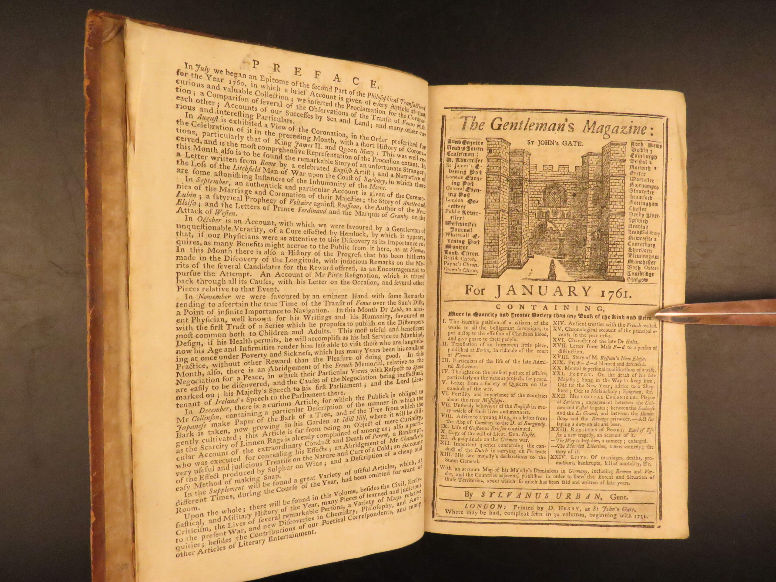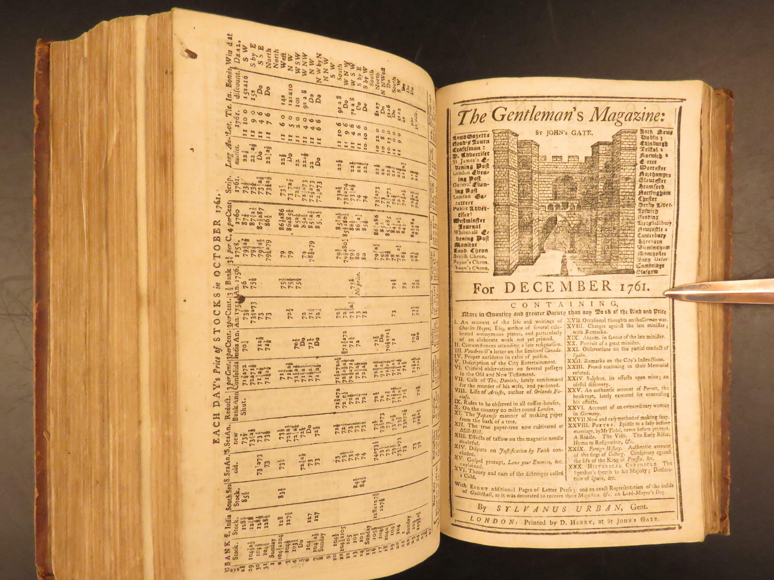 First edition of Sylvanus Urban’s Gentleman’s Magazine (1761), with engraved plates and maps covering naval, colonial, and scientific subjects; original leather binding with signs of wear.