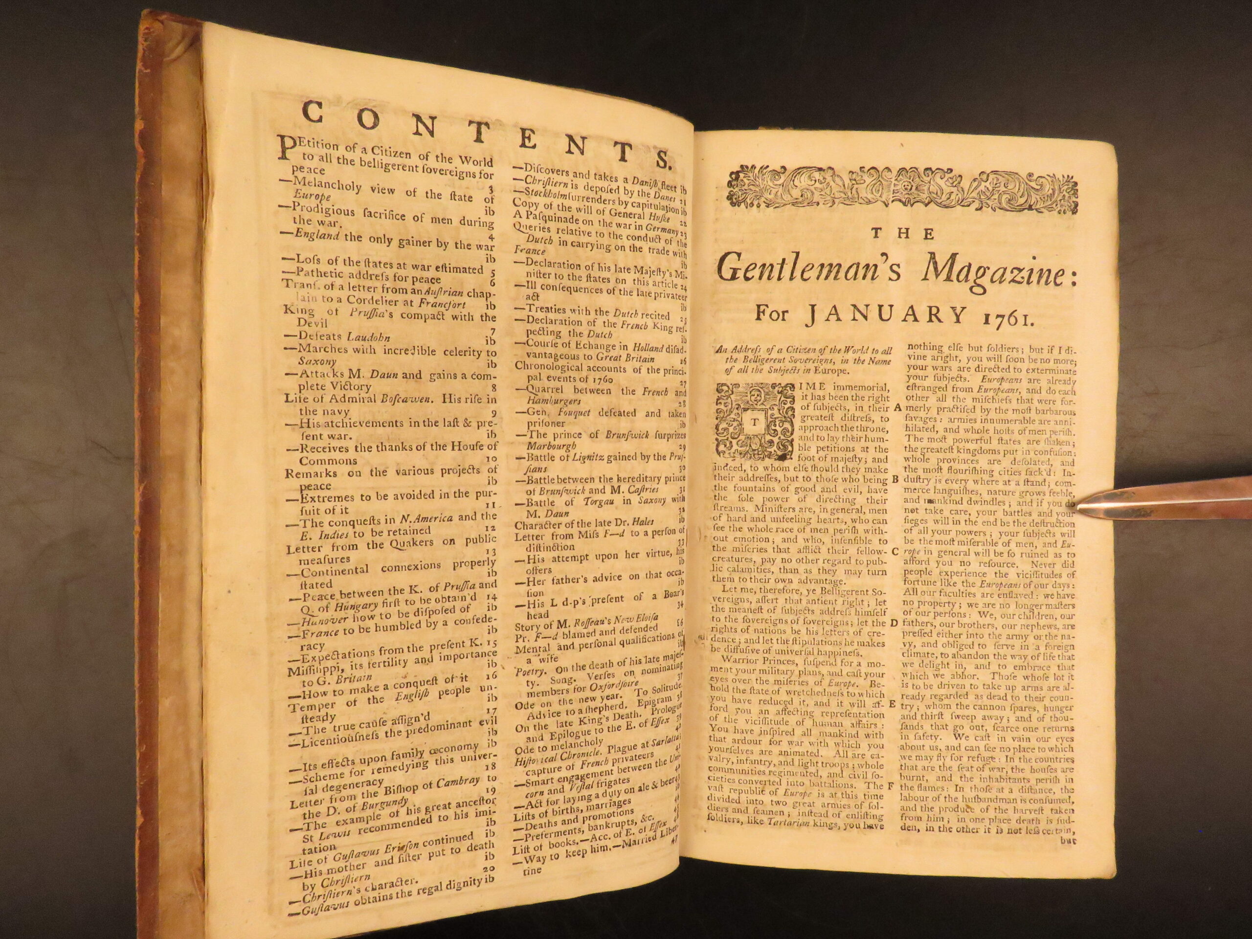 1761 – gentleman’s magazine | first edition with maps, egyptian mummies & voyages | first edition of sylvanus urban’s gentleman’s magazine (1761), with engraved plates and maps covering naval, colonial, and scientific subjects; original leather binding with signs of wear.