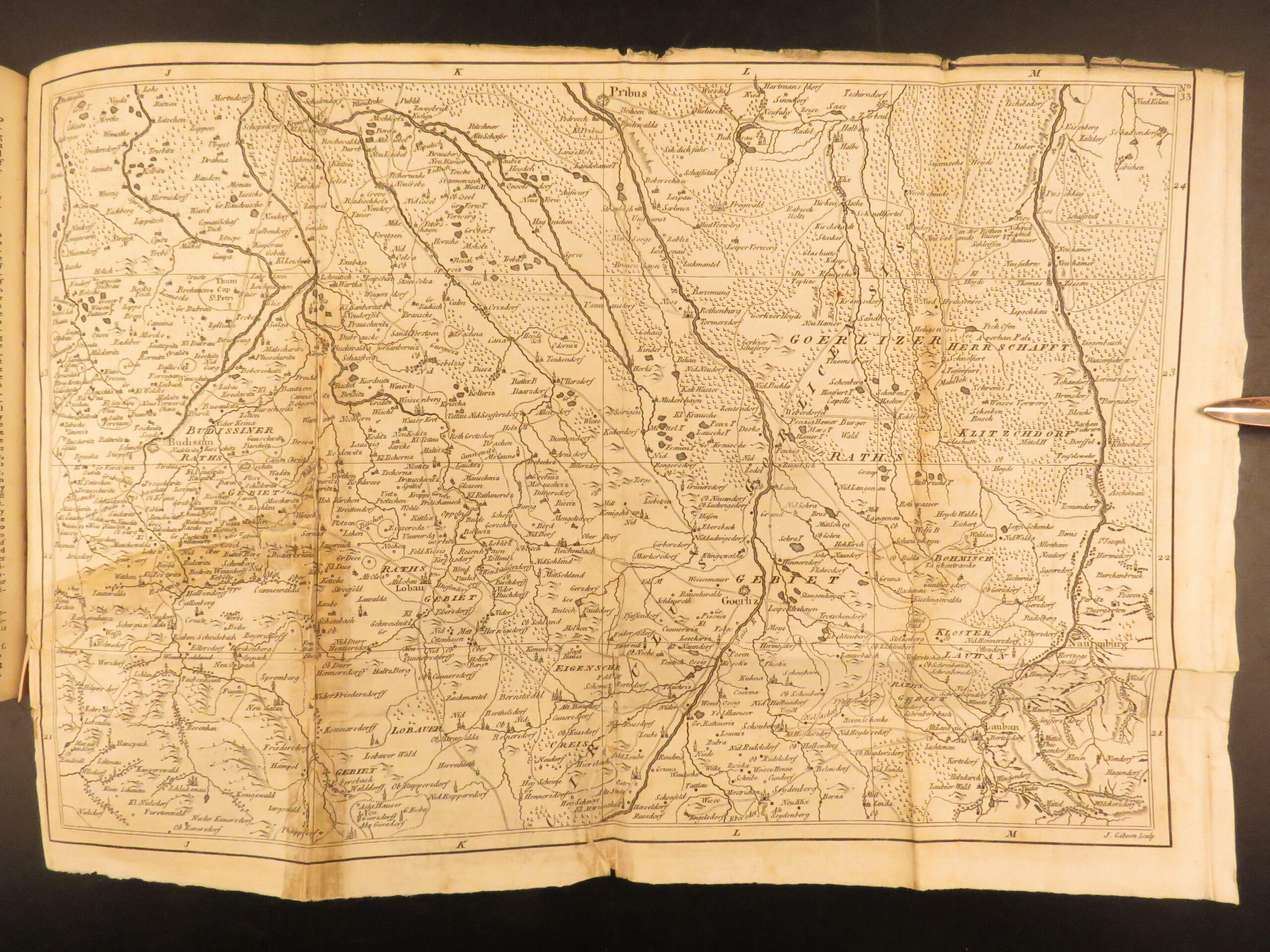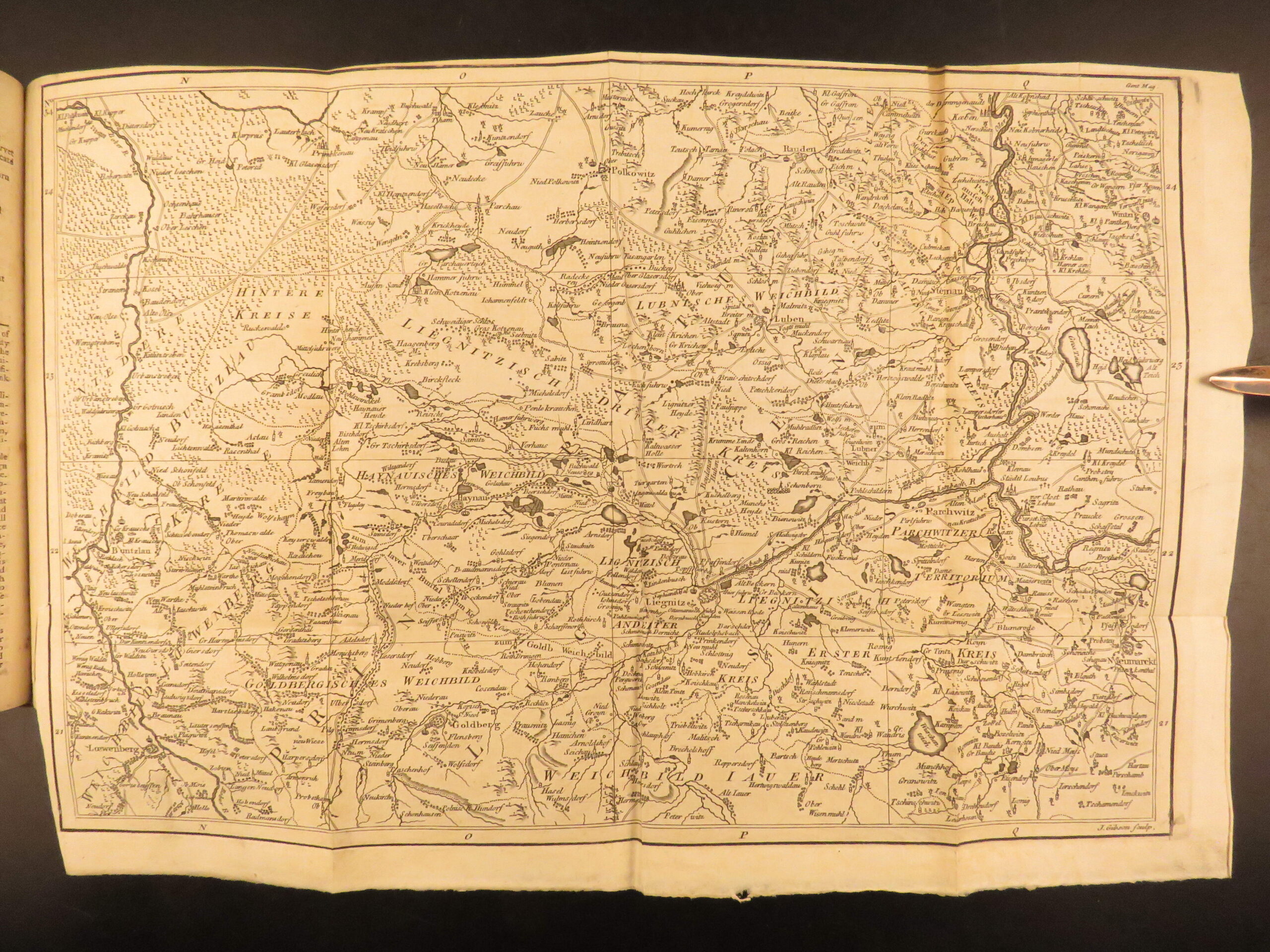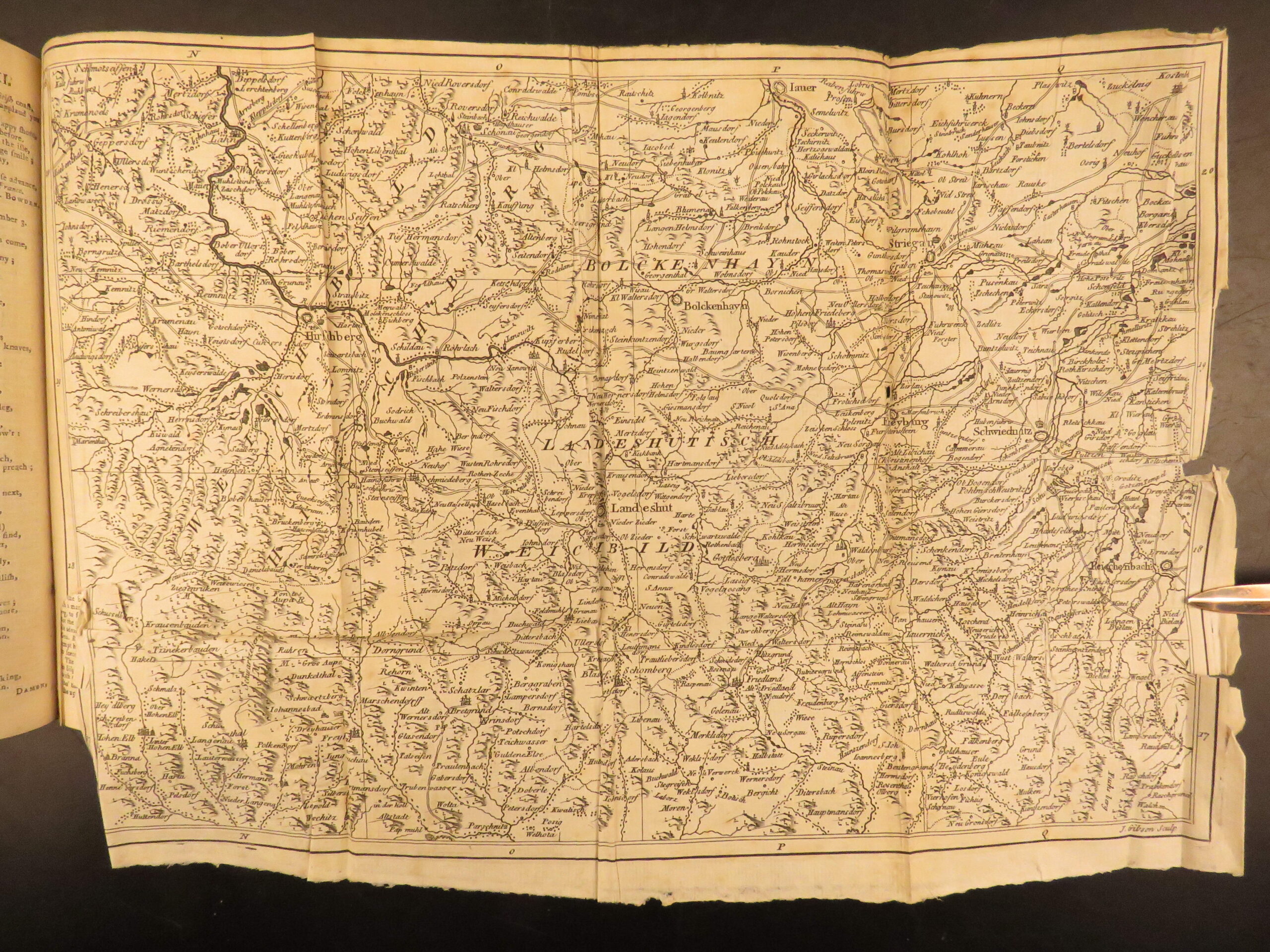 Bound in full leather with visible wear to hinges and corners. Leather surface shows staining. Internally, the text block is secure and pages show mild toning. One map is absent, all plates are present and intact.