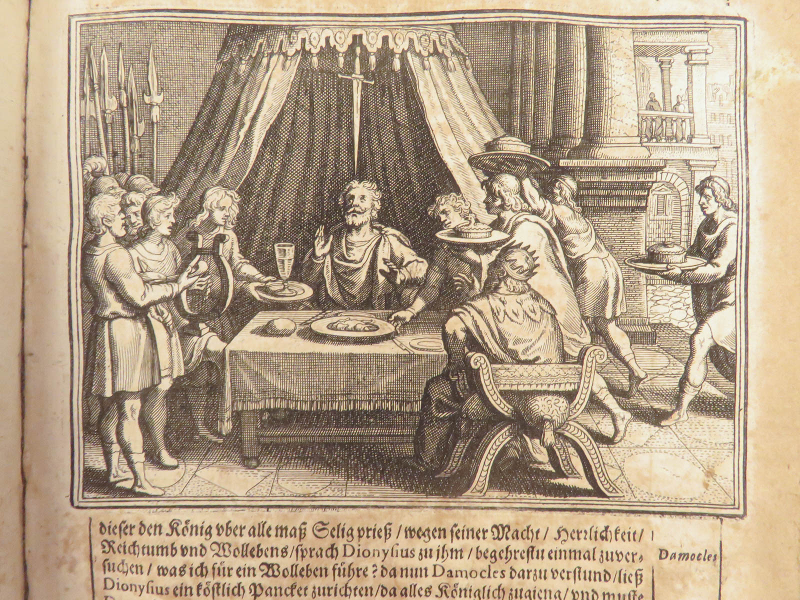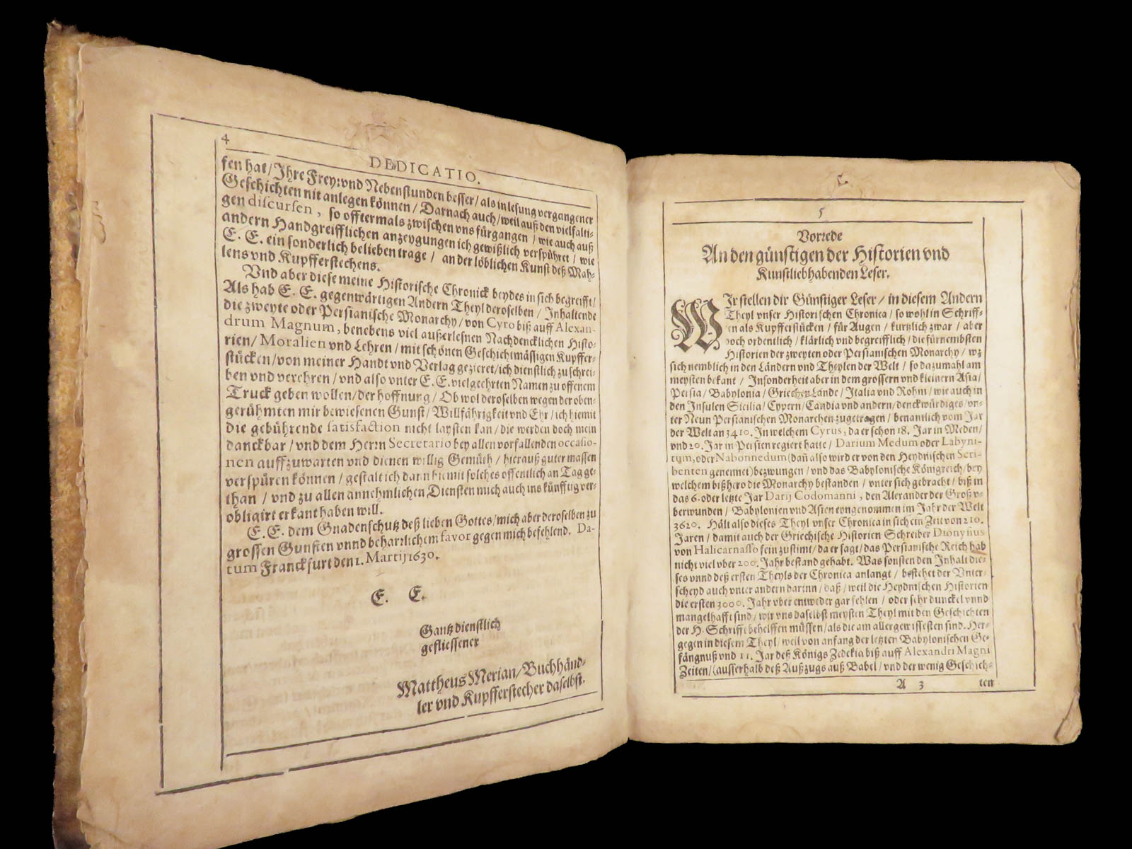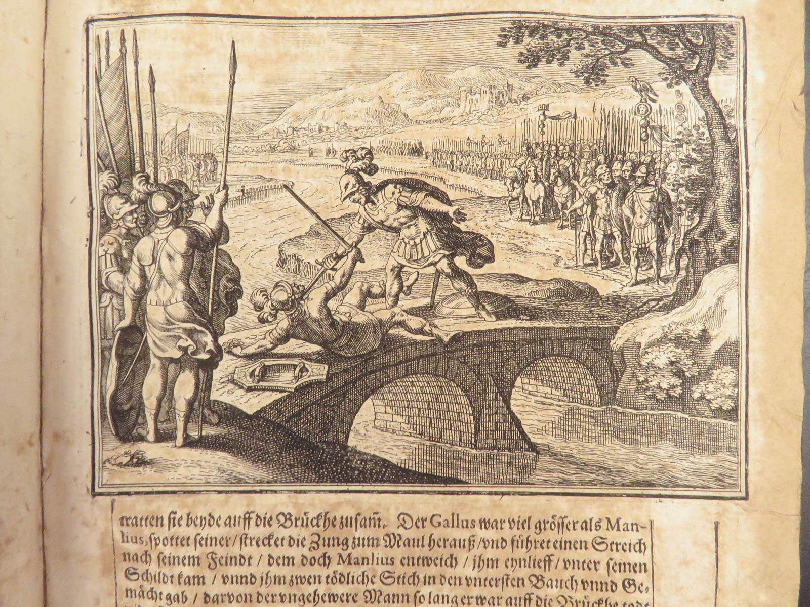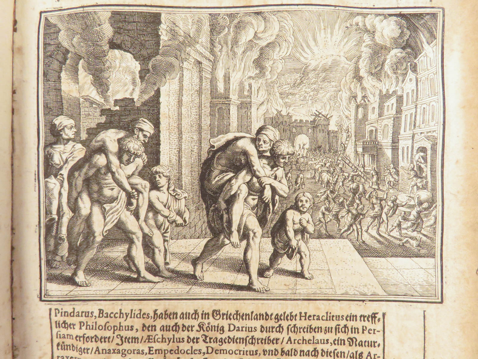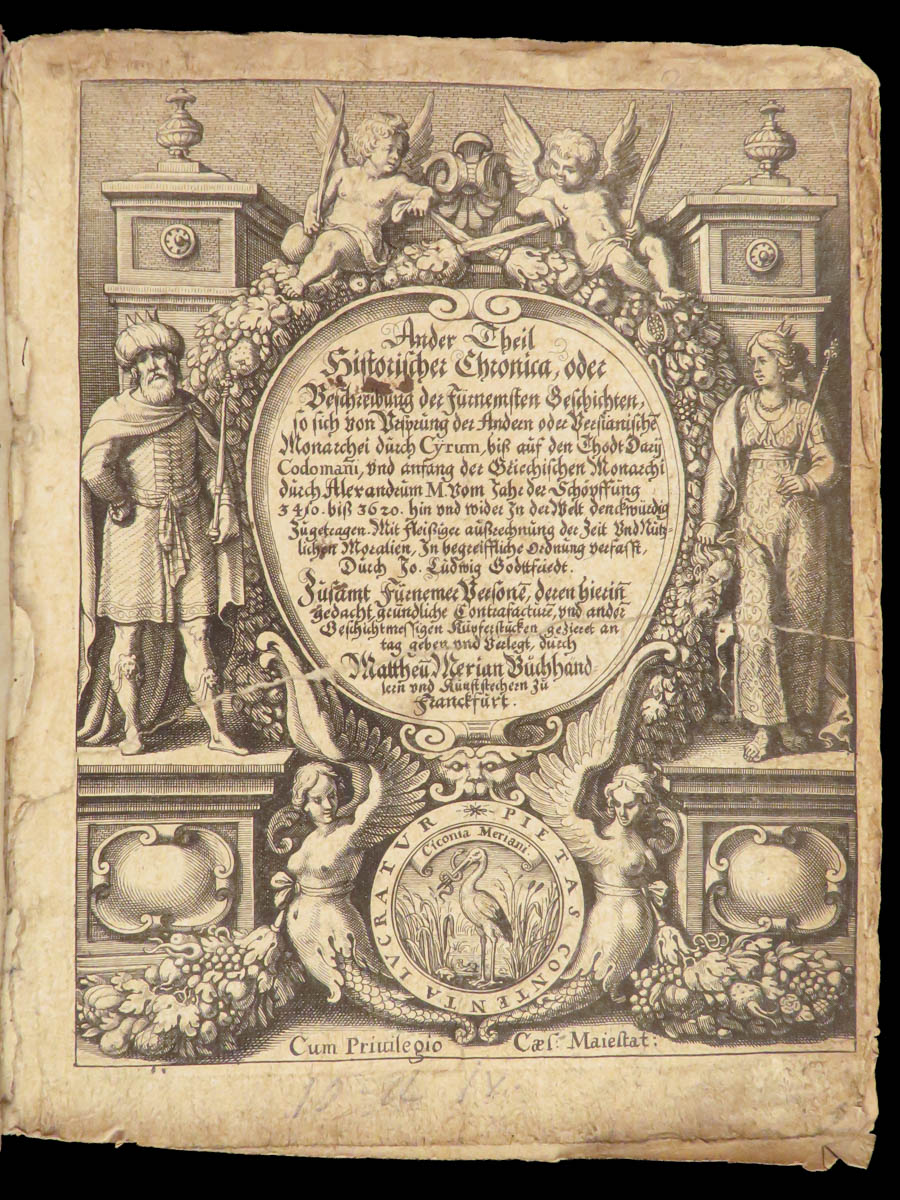 Johann Ludwig Gottfried’s 1631 Historische Chronica, printed in Frankfurt by Merian, presents sacred and classical world events with 47 engravings; this incomplete copy lacks several leaves.