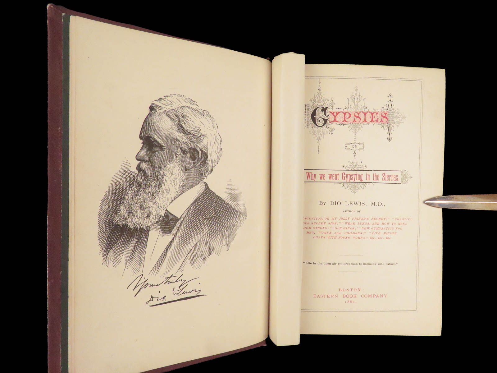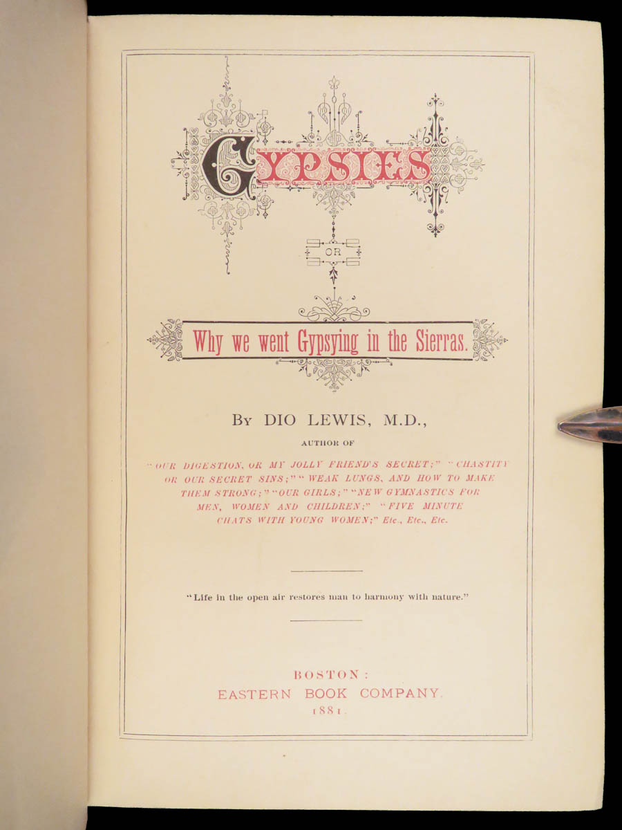 Gypsies; or, Why We Went Gypsying in the Sierras by Dio Lewis was published in 1881, detailing the travels and experiences of the homeopathic doctor during his 3-year ramble around California and the surrounding regions. After spending 30 years as a physician, temperance crusader, and exercise advocate, Lewis claimed that there was nothing so restorative as the nomadic camp life that he pursued around Yosemite Valley.  Lewis’s approach is informal and direct, often weaving personal observations with remarks on the environment and company he kept during the trip. He tells of encountering Mormons, Indians, and redwood loggers, hunting grizzlies, and experiencing earthquakes, among numerous other anecdotes. This first edition was published in Boston by the Eastern Book Company.