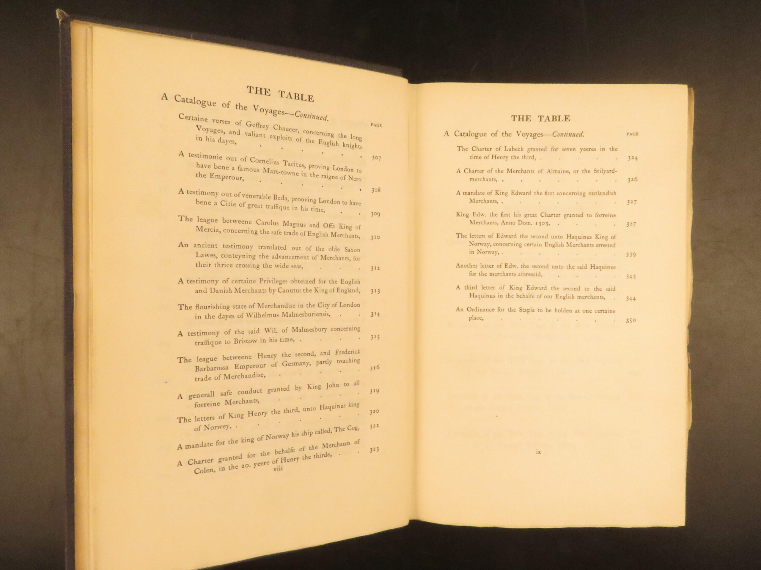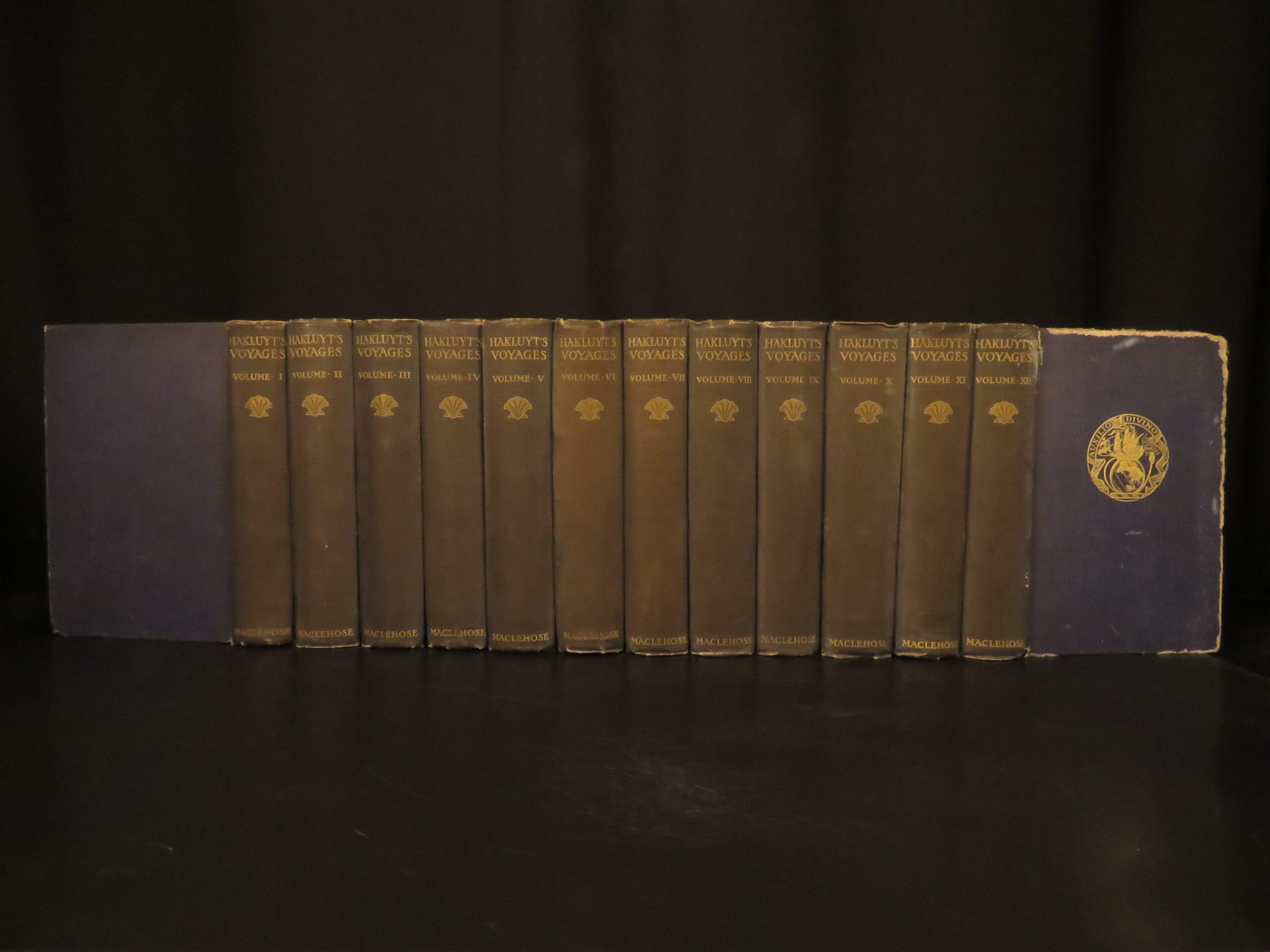 This 1903 12-volume set of The Principal Navigations, Voyages, Traffiques & Discoveries of the English Nation by Richard Hakluyt details the voyages and explorations of famous English navigators such as John Cabot and Sir Francis Drake, accompanied by large folding maps.