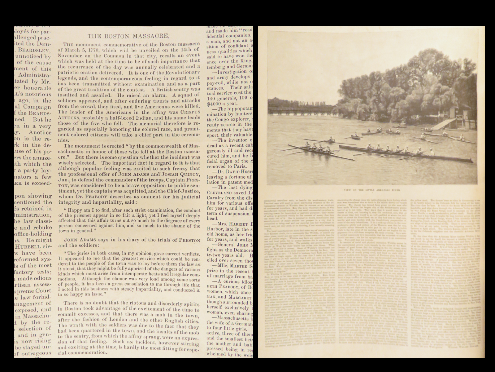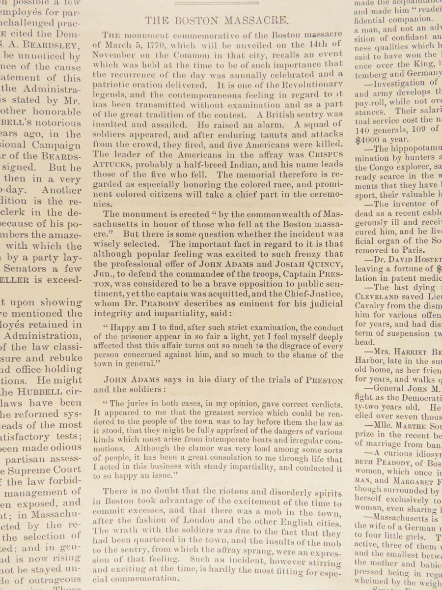 This 1888 issue contains military training at West Point, coverage of William II of Prussia, and attention to the Grand Army of the Republic. American naval testing at Willett’s Point is reported alongside accounts of hunting in California. The dedication of the Crispus Attucks Monument to mark the Boston Massacre is included. Regional history appears in the treatment of Leadville, Colorado.
