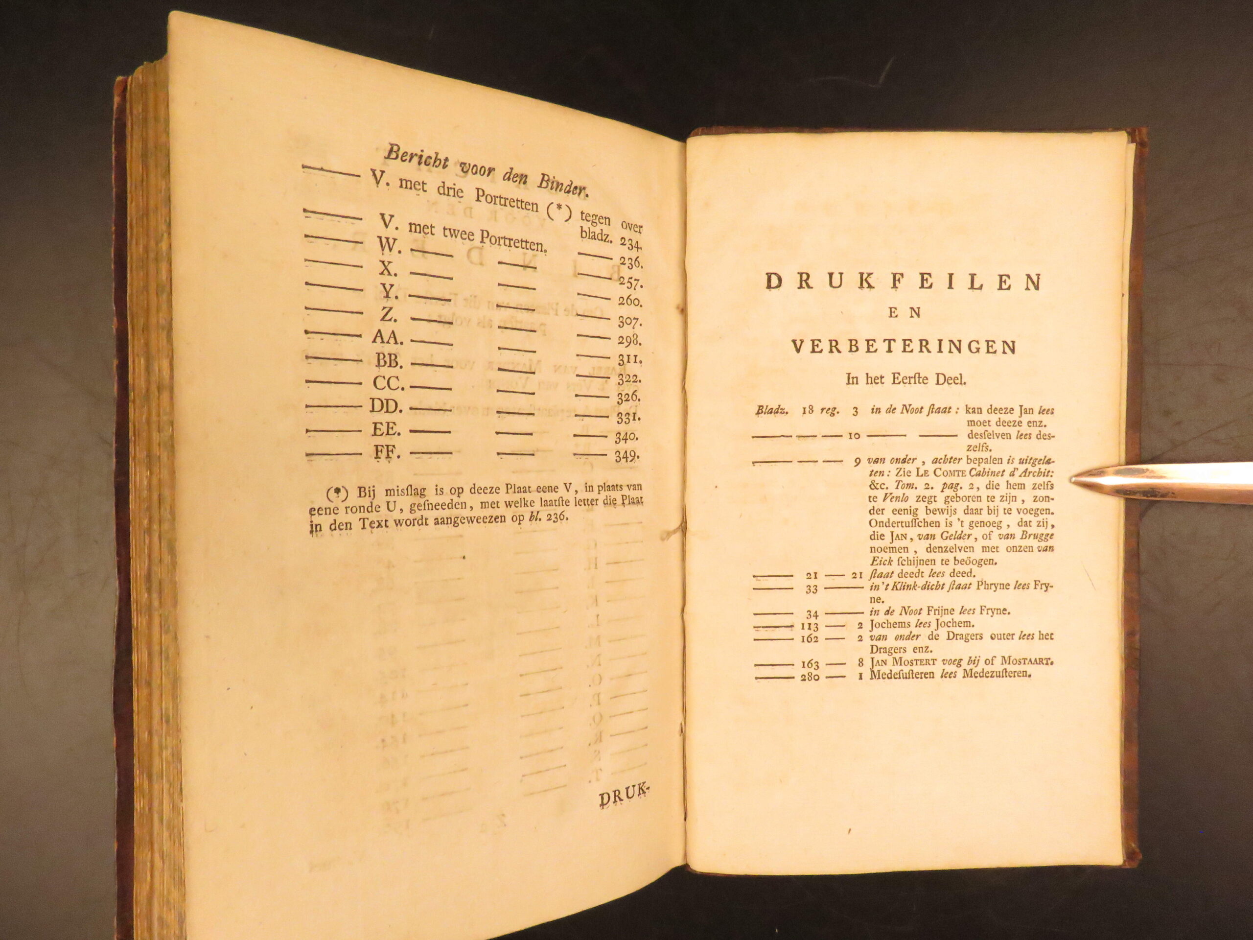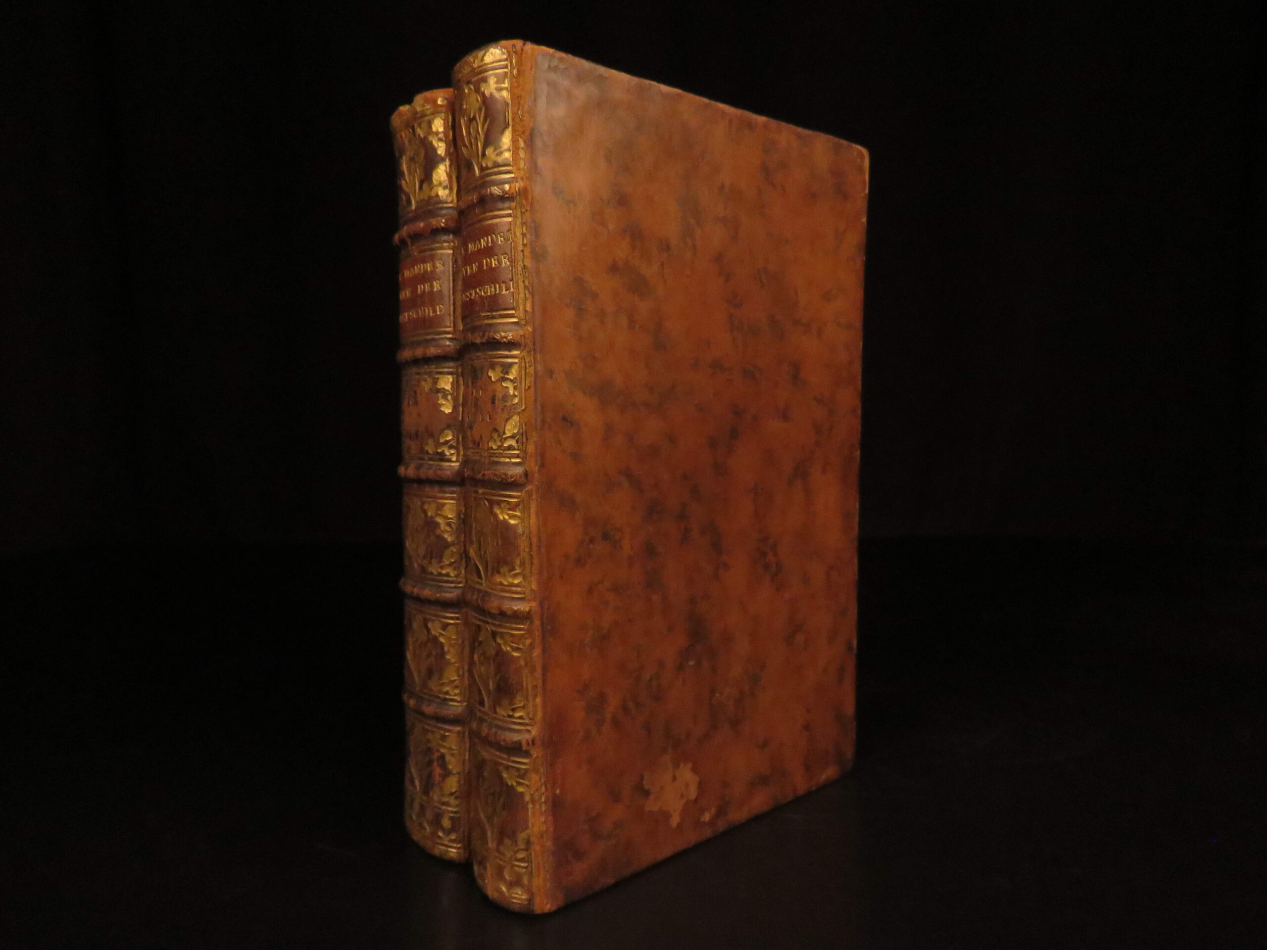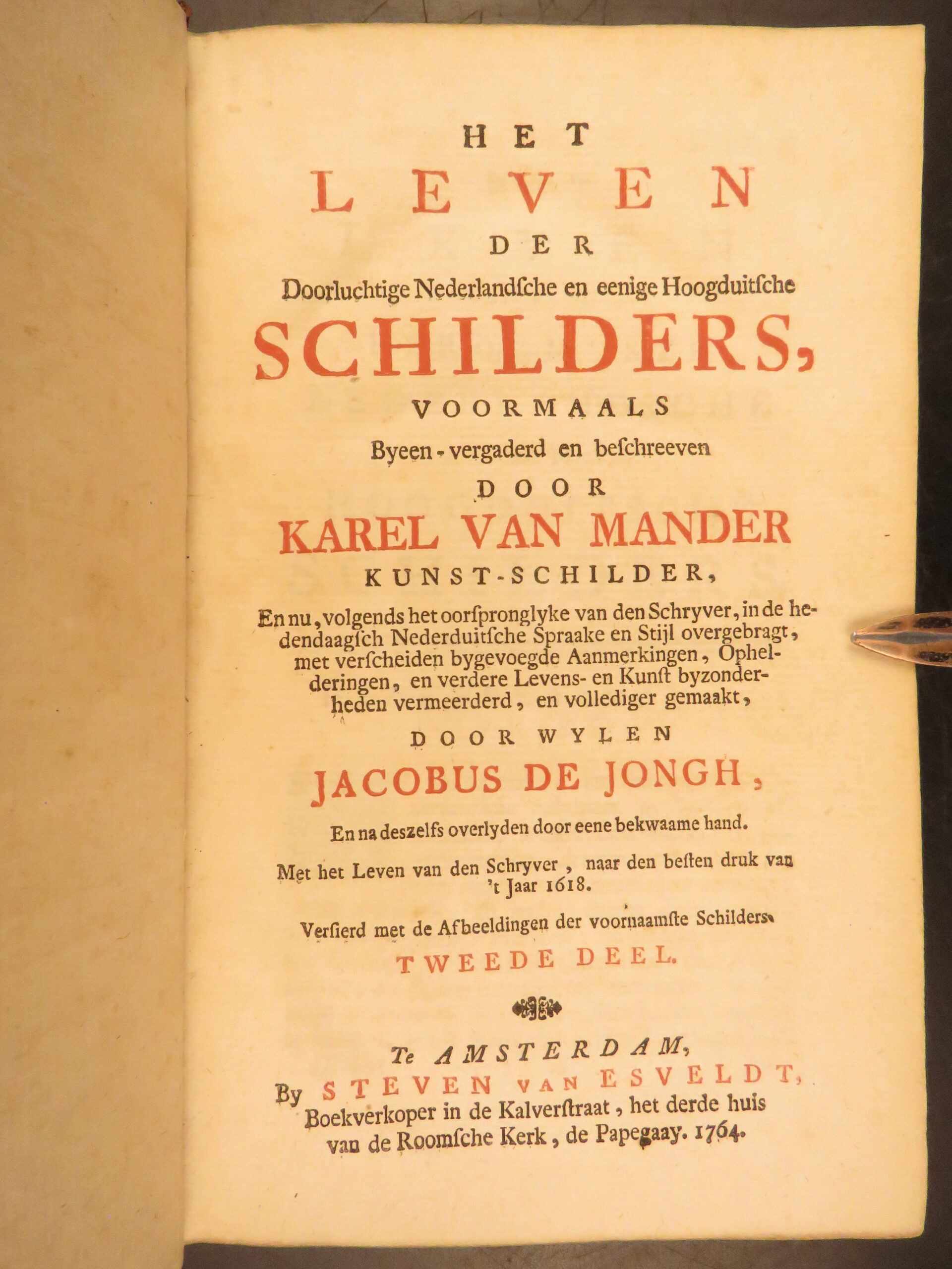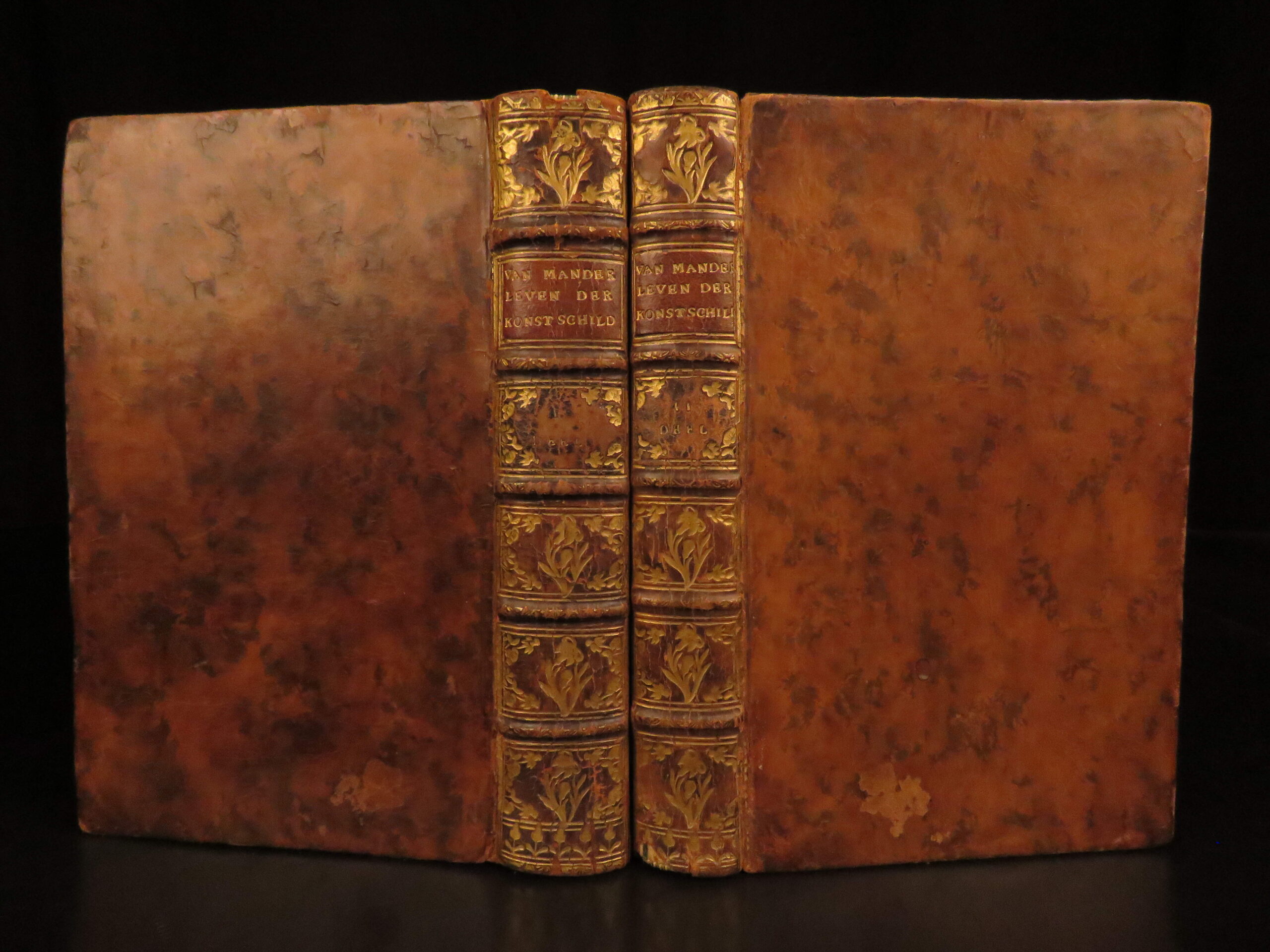 1764 Amsterdam two volume leather edition of Karel van Mander’s Het Leven der Doorluchtige Nederlandsche en eenige Hoogduitsche Schilders, an early source on Dutch and Flemish Renaissance painters with engraved plates.