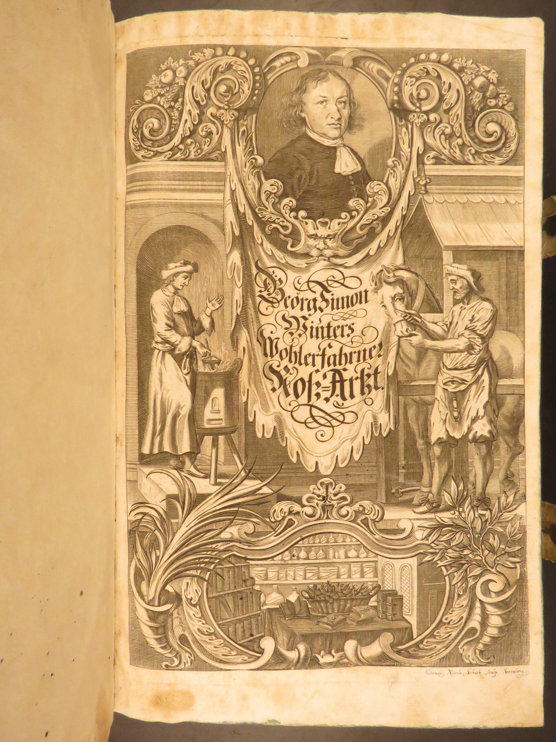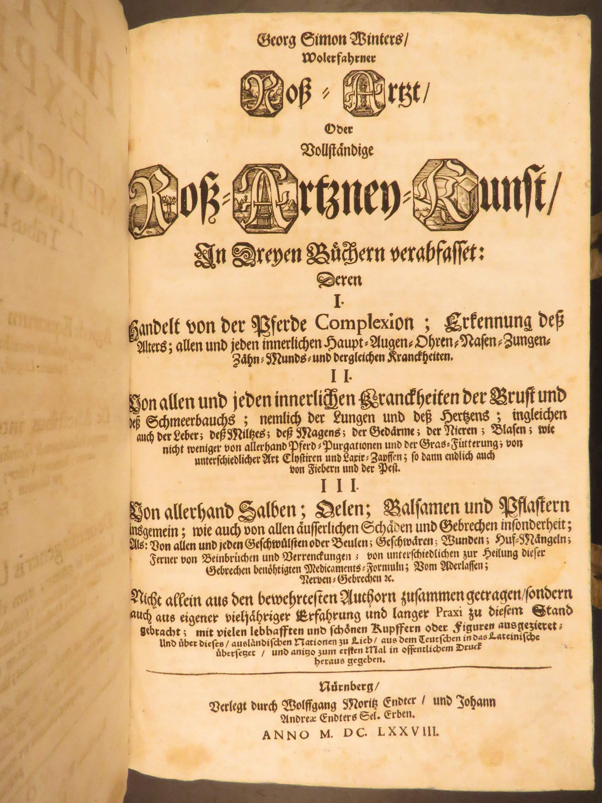 1678 – horse manual – georg winter | first edition – illustrated veterinary medicine | winter’s 1678 <em>hippiater expertus</em> is a latin veterinary folio on equine disorders, treatments, and anatomical theory with 43 in-text woodcuts and original vellum binding.