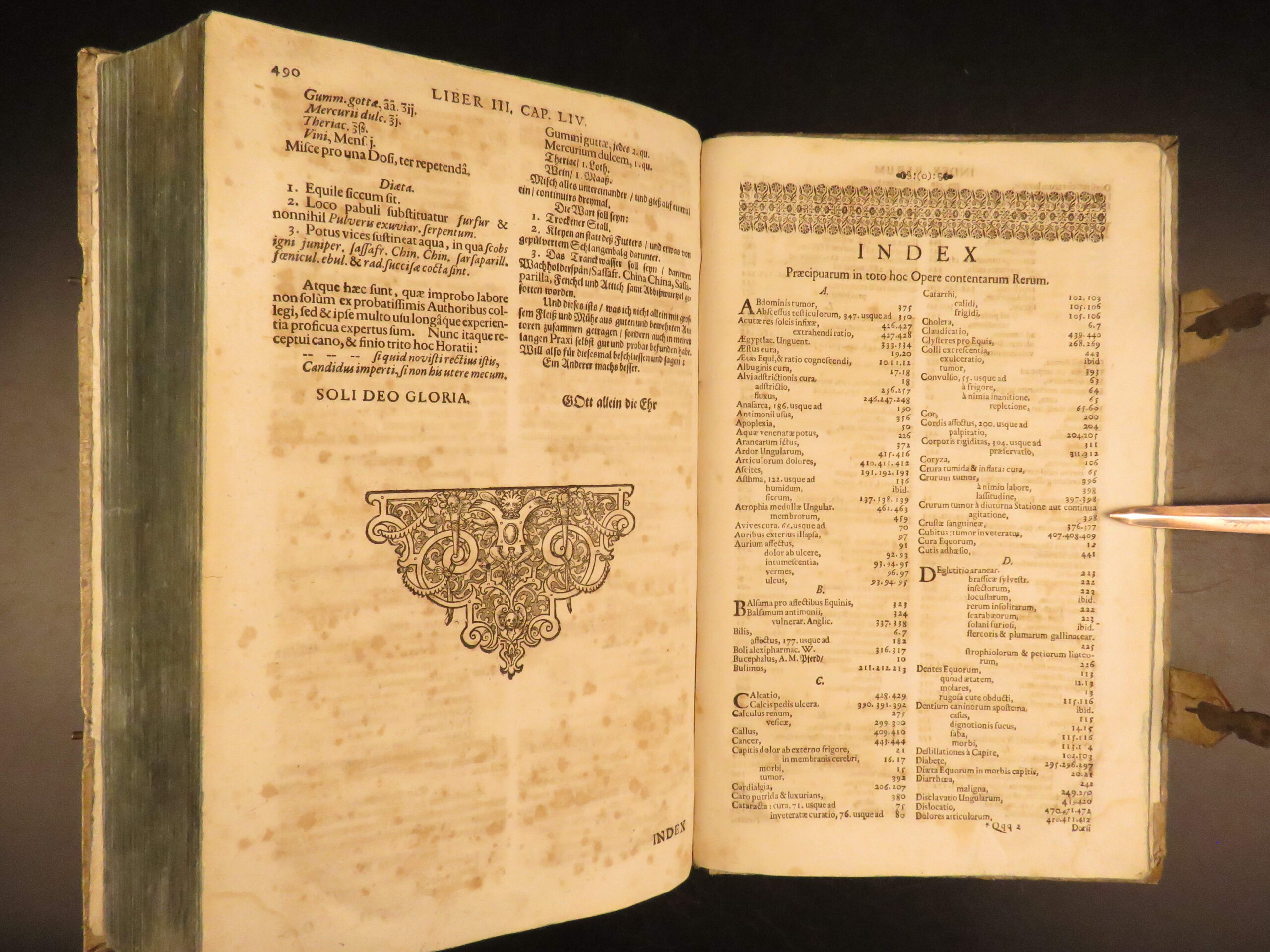Hippiater expertus by Georg Simon Winter is the continuation of his much more famous Bellerophon, sive Eques Peritus. This work is one of the best and most comprehensive early-modern veterinary guides for horses, first published in 1678. Published in Nuremberg, this work includes both German and Latin translations in one tome and is notable for the dozens of in-text woodcuts depicting horses. The folio volume explores equine medicine through the lens of Galenic theory, and covers diseases affecting the horse’s nervous system, eyes, teeth, and joints, along with digestive and urinary issues. Practical topics include diet, dislocation correction, and fracture stabilization.