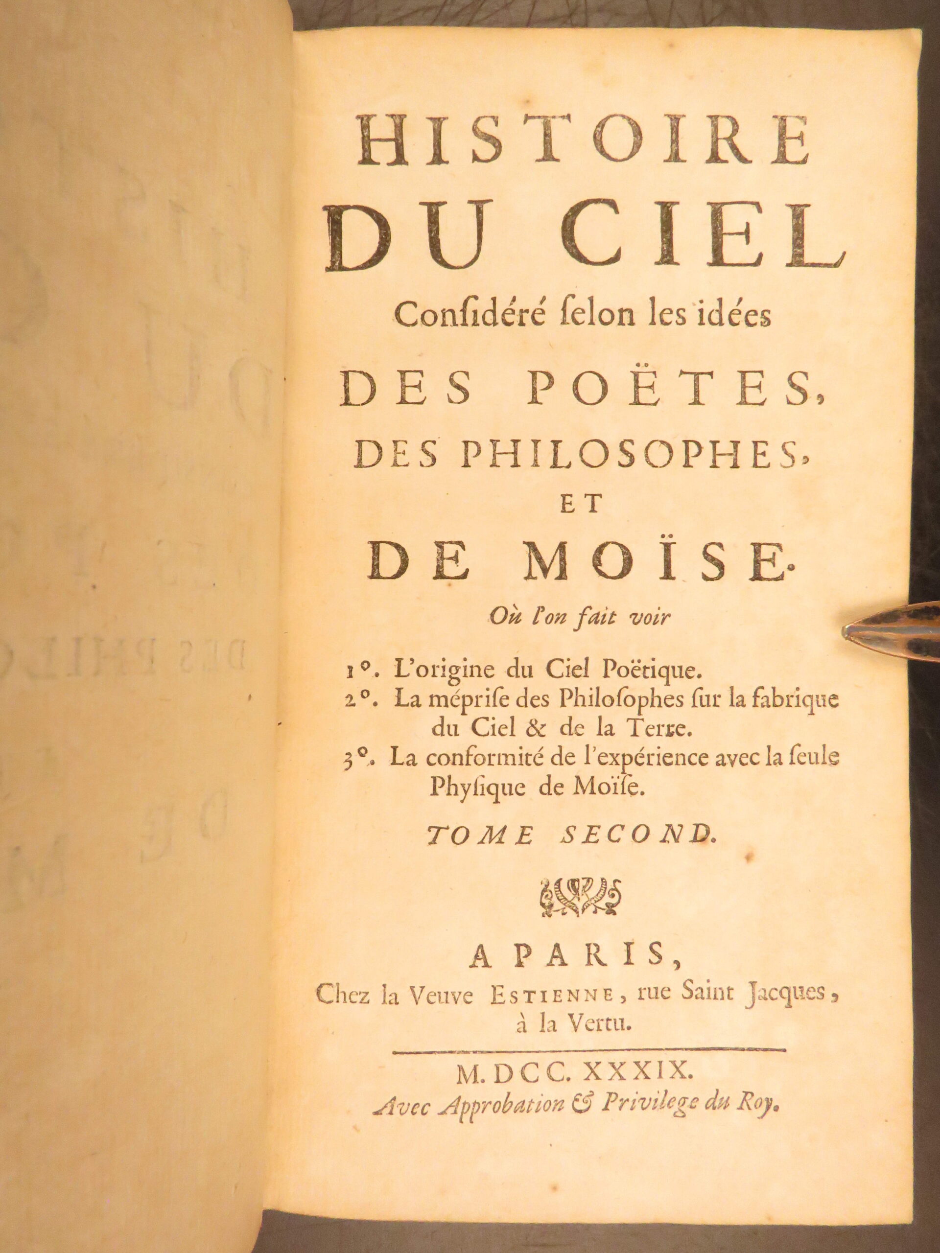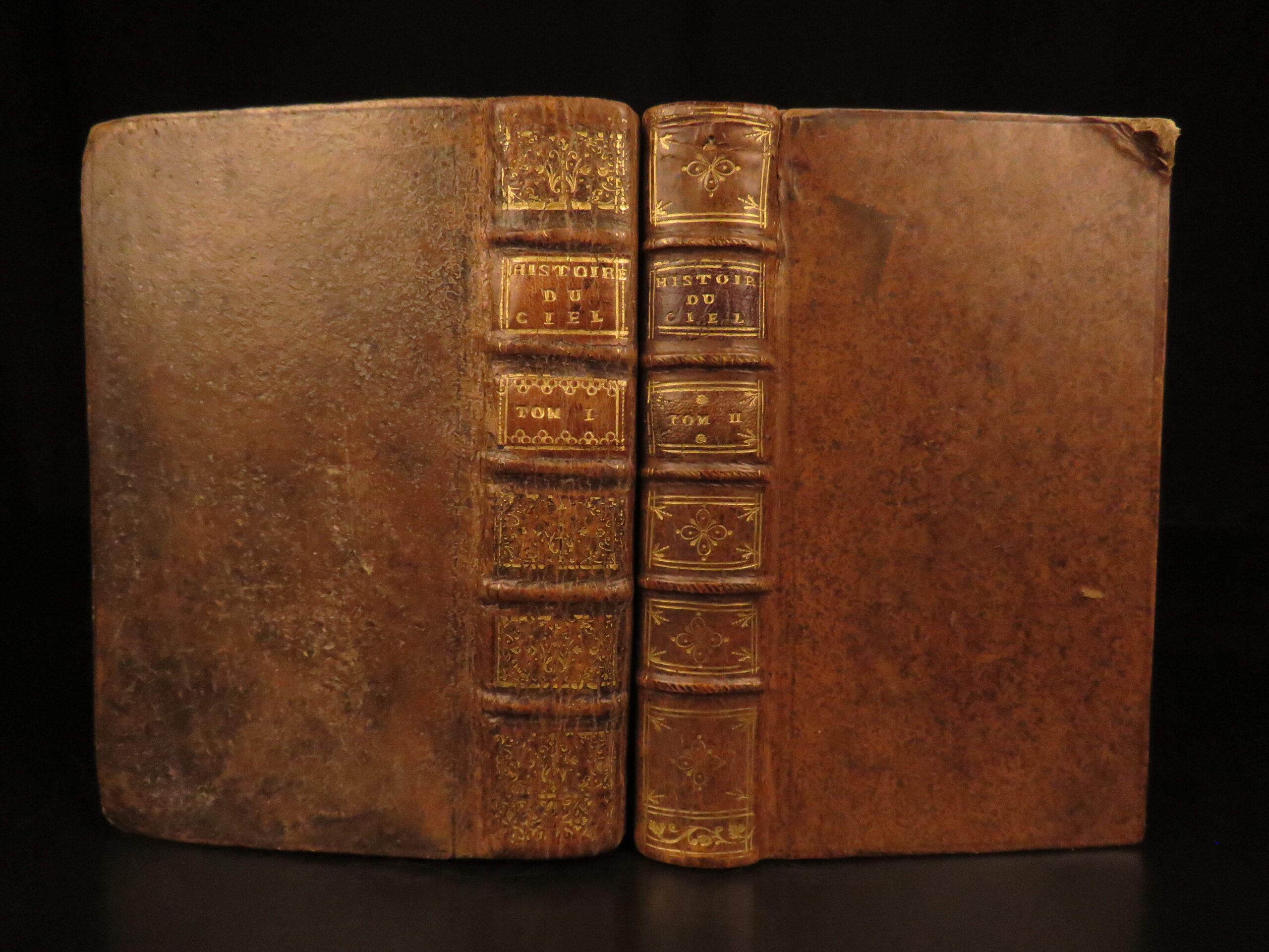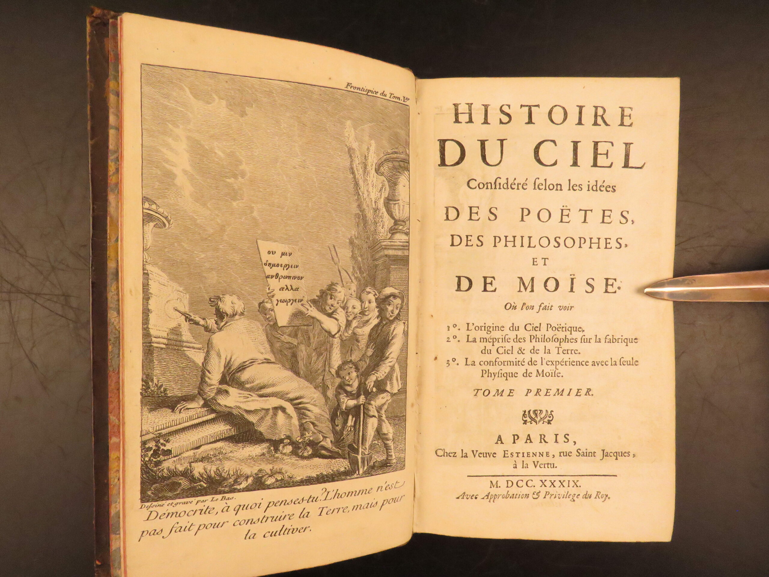 First edition of Noel Antoine Pluche’s Histoire du ciel (1739), a two-volume theological and cosmological study illustrated with twenty-four engravings by J. P. le Bas exploring poetic, philosophical, and biblical conceptions of the heavens.