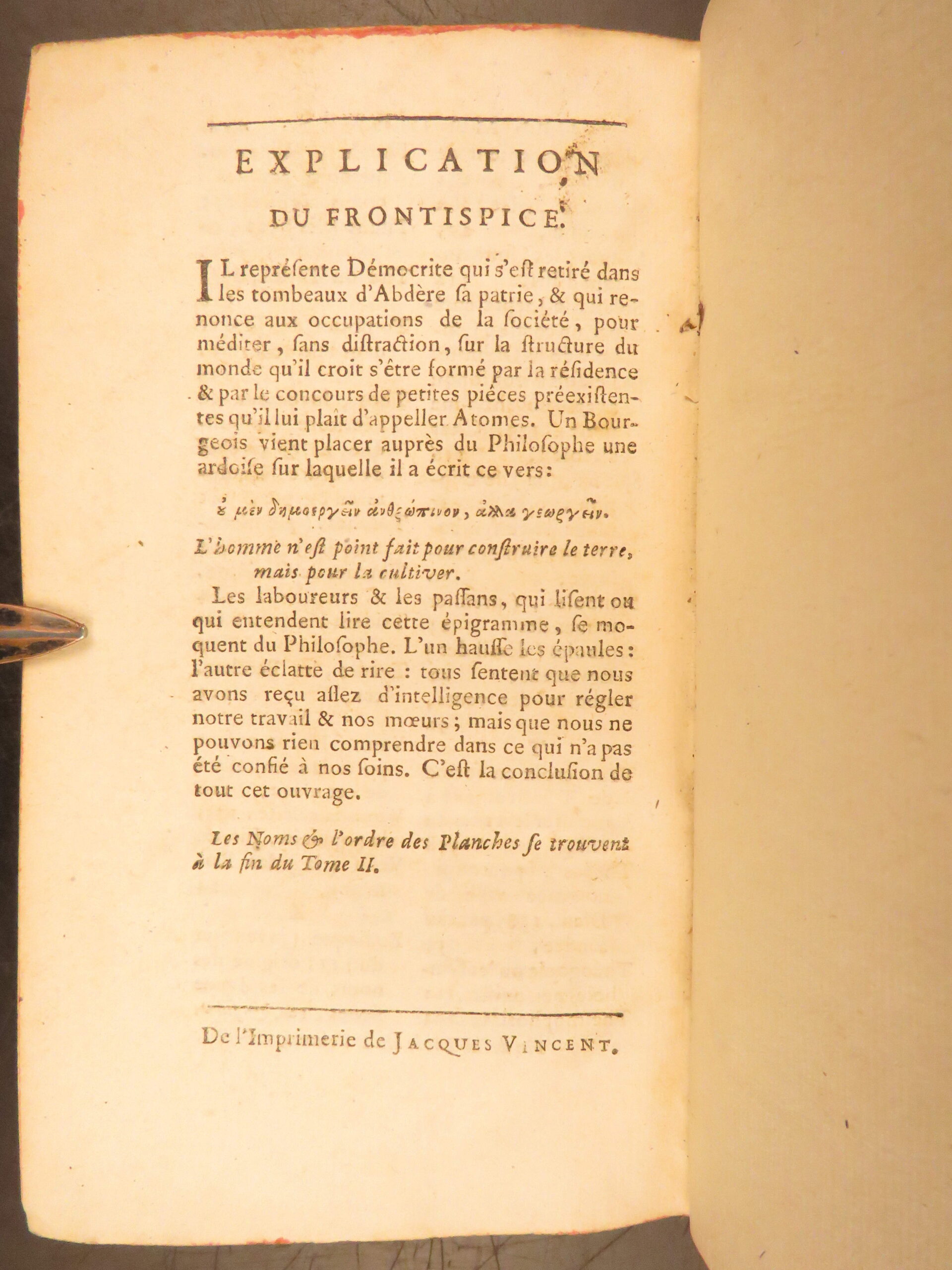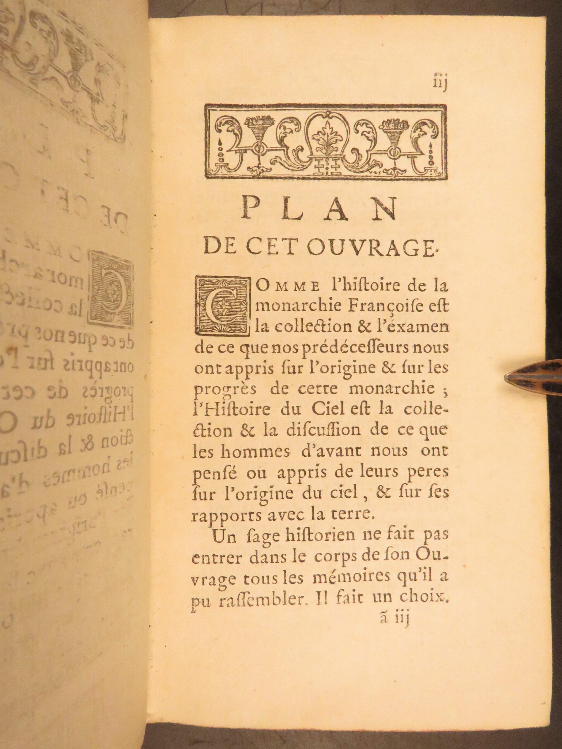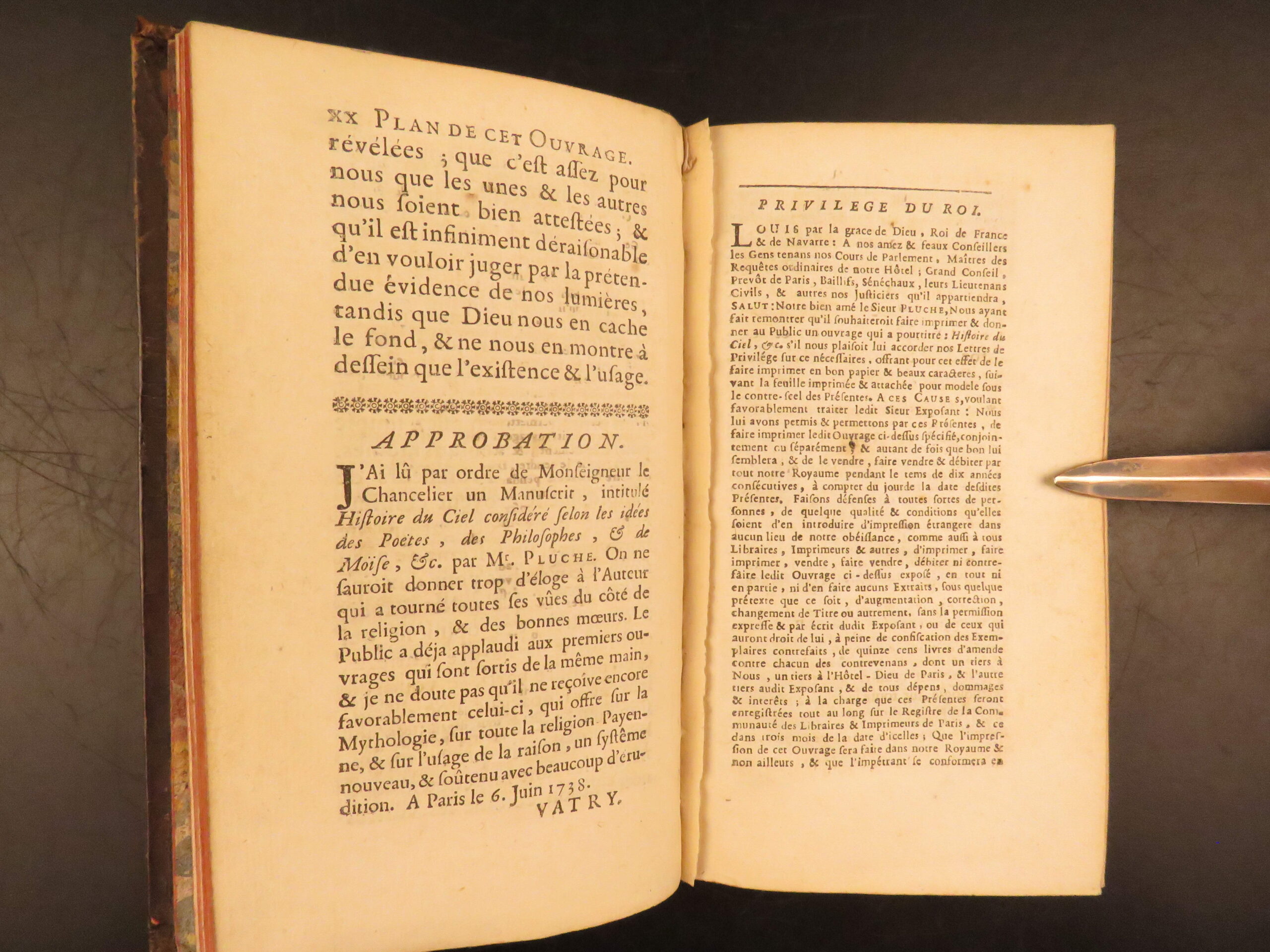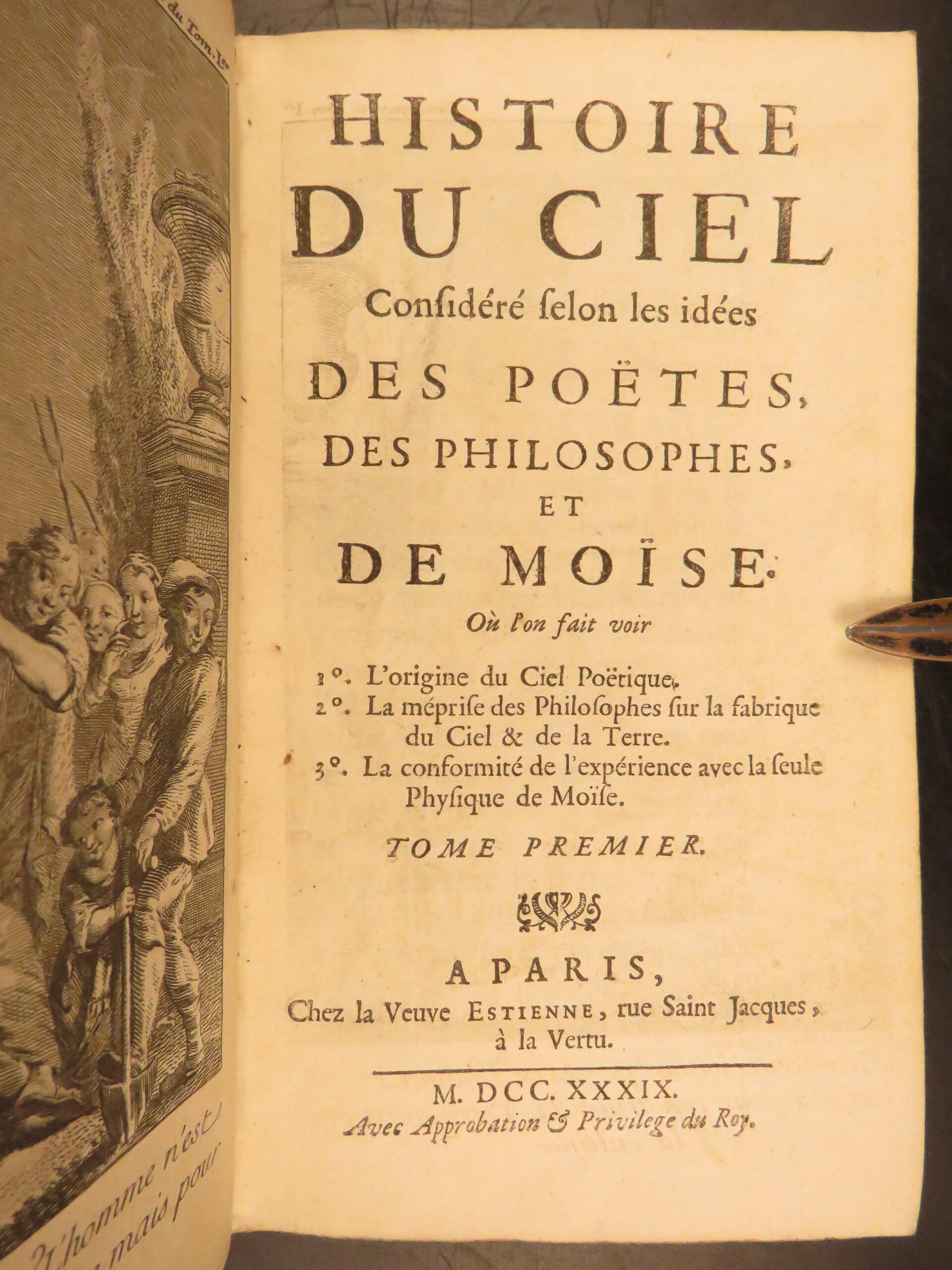 First edition of Noel Antoine Pluche’s Histoire du ciel (1739), a two-volume theological and cosmological study illustrated with twenty-four engravings by J. P. le Bas exploring poetic, philosophical, and biblical conceptions of the heavens.