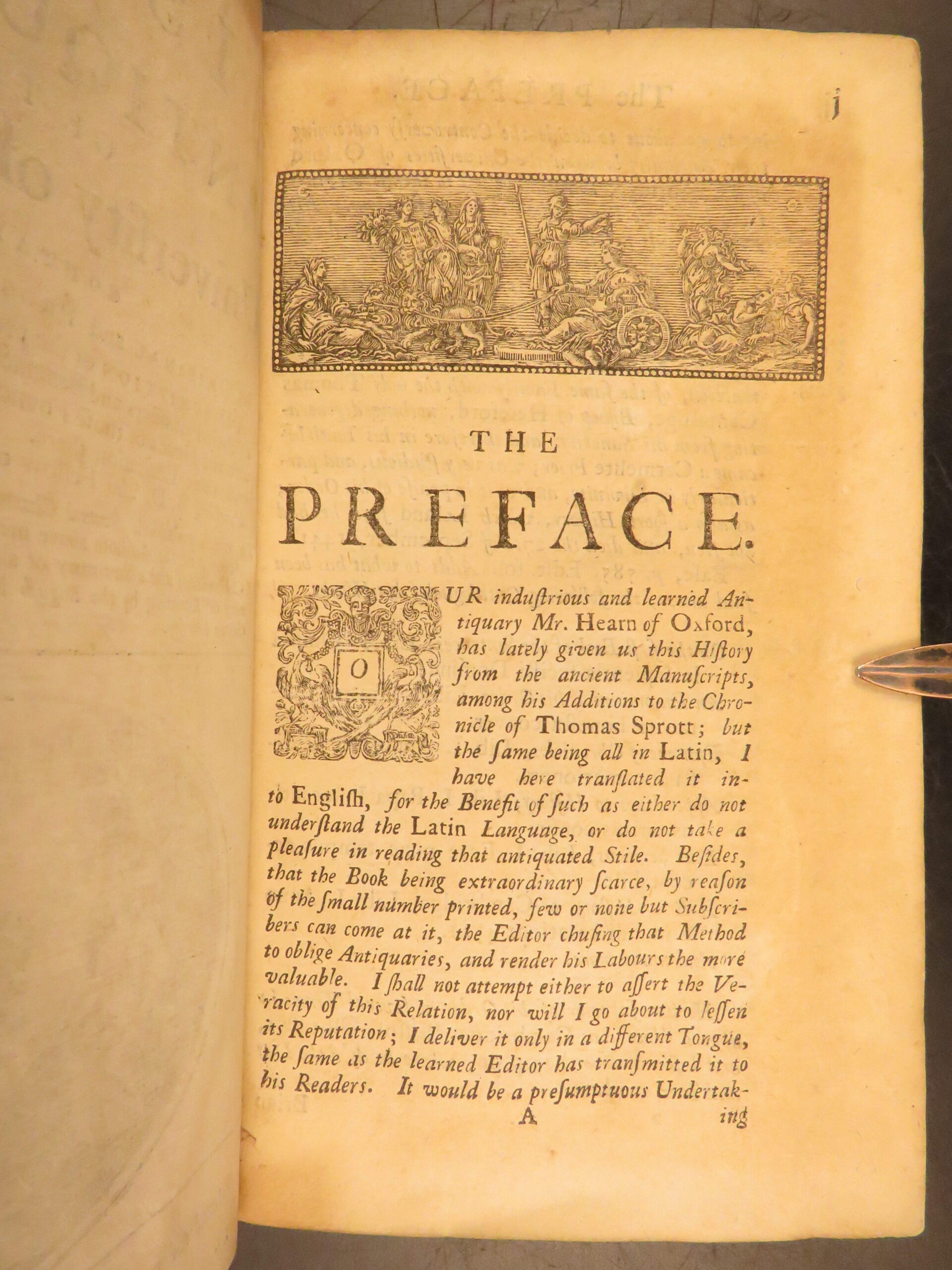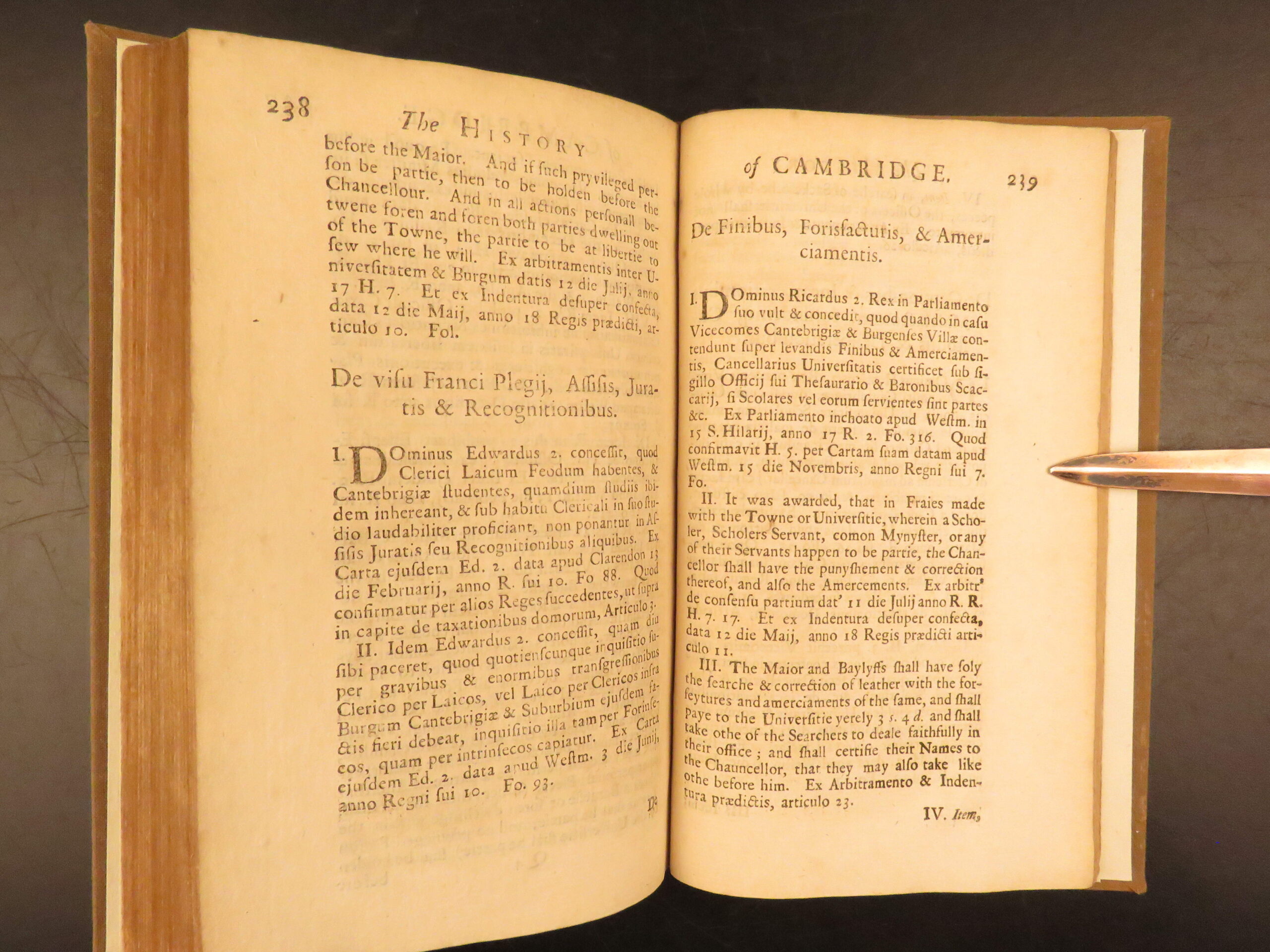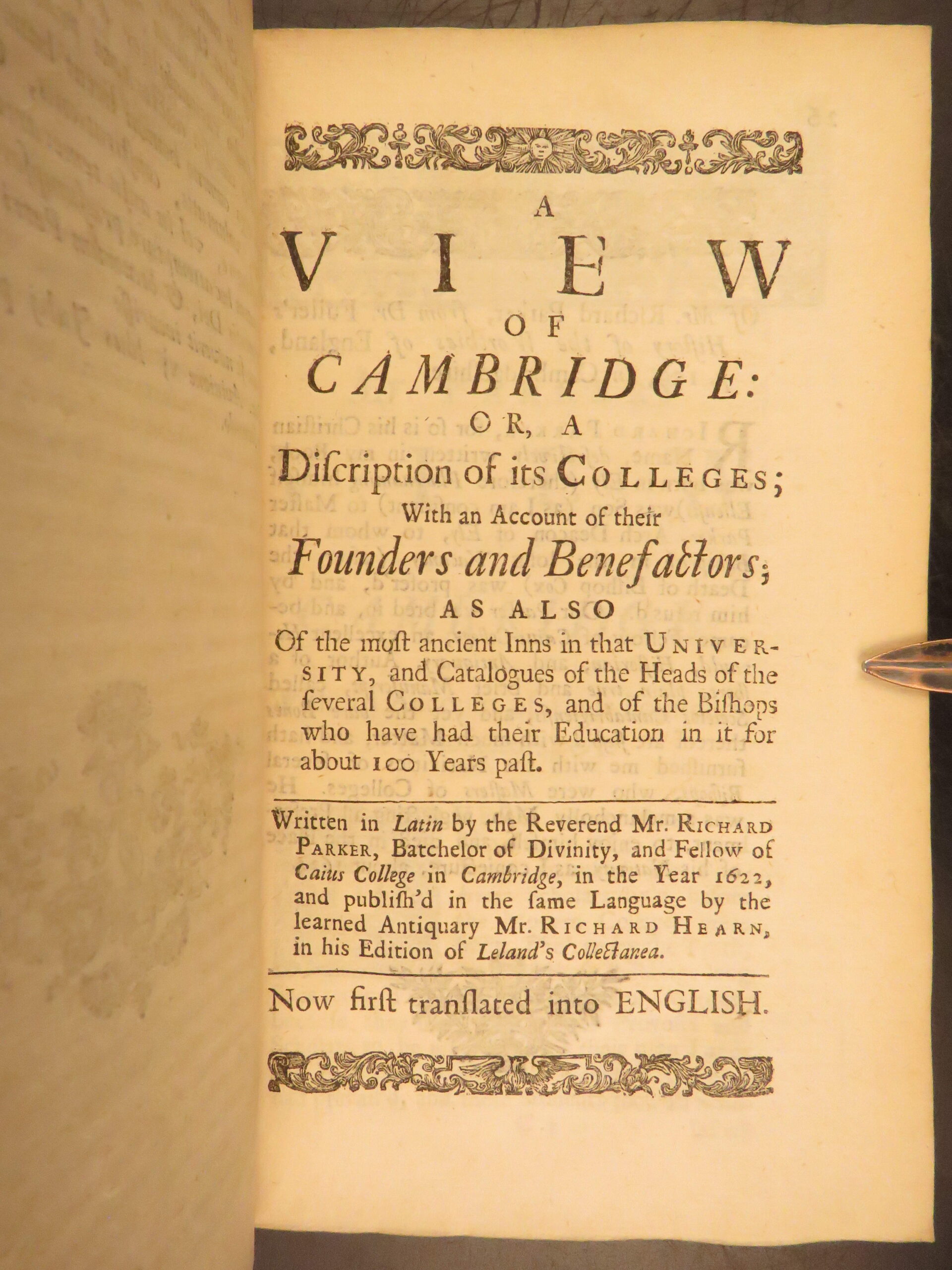 First edition of Parker’s bilingual history of Cambridge, with English translations of two early Latin texts on the university’s origin and colleges. Professionally rebound in leather and cloth.