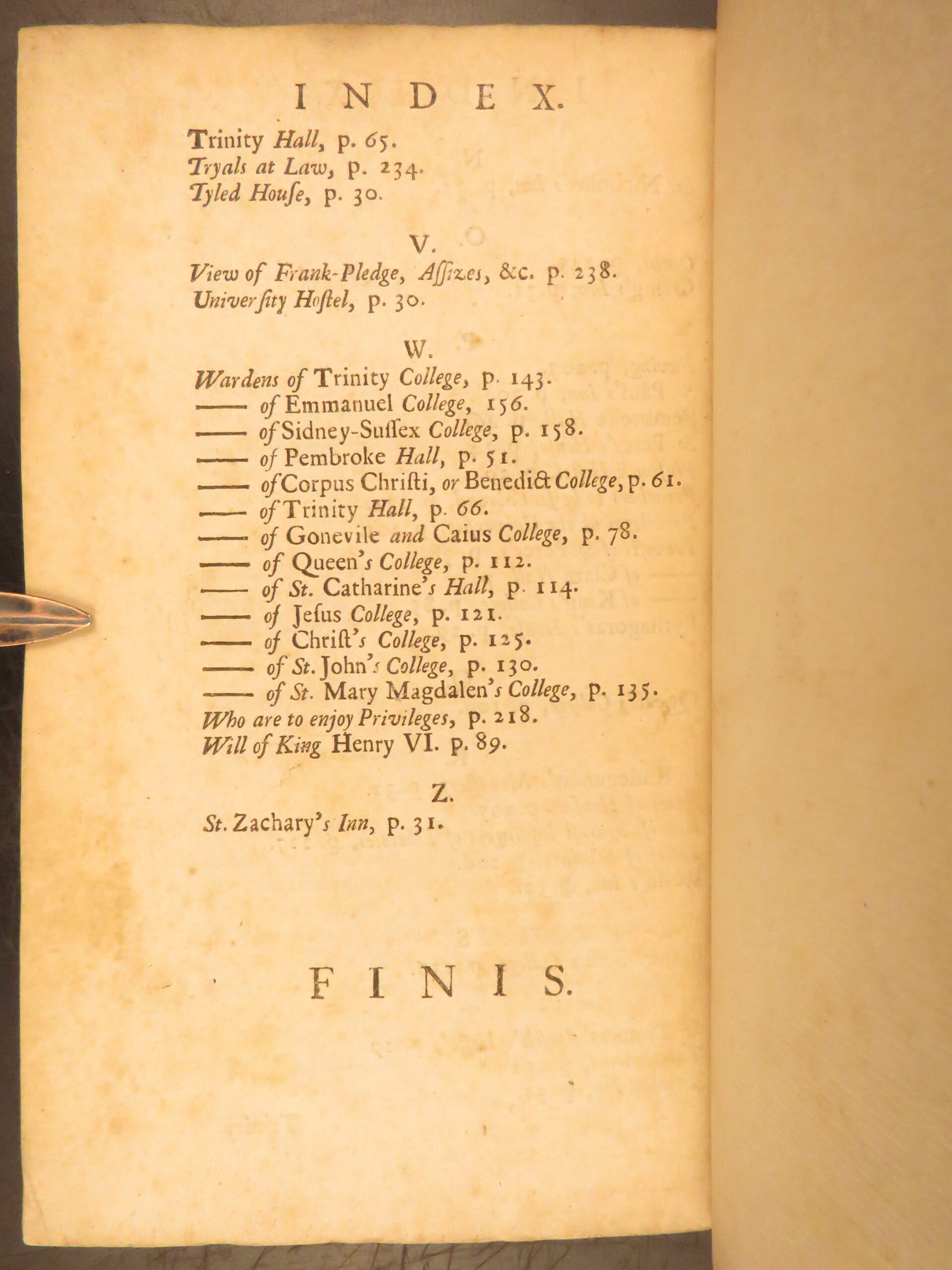 The History and Antiquities of the University of Cambridge is a rare, early 18th-century collection of two early Latin works on the origins and history of the colleges of Cambridge: Historiola Cantabrigiensis by Nicholas Cantalupus and Skeletos Cantabrigiensis by Richard Parker. The book surveys the changes of the colleges through the reigns of Kings and how they affected the university. It also notably includes a table of the diocese of Canterbury and York which includes most famous names such as Thomas Cranmer and Henry Deane.