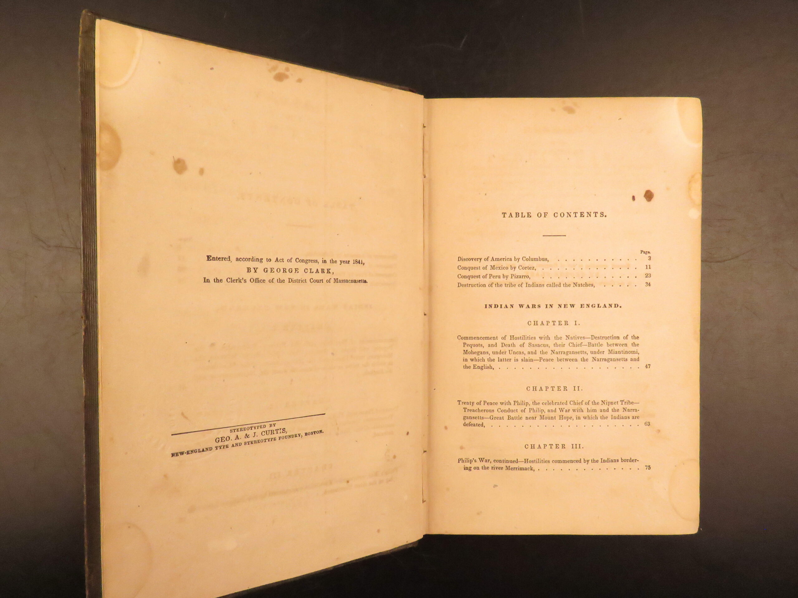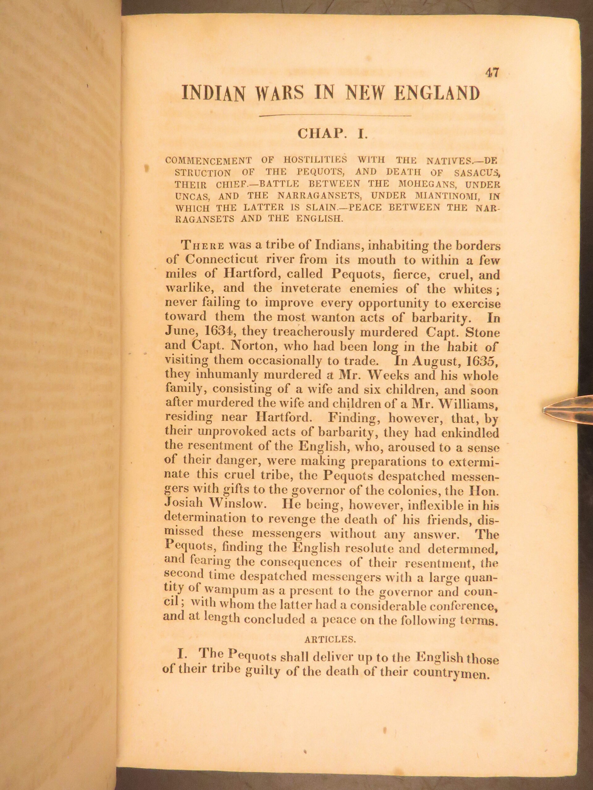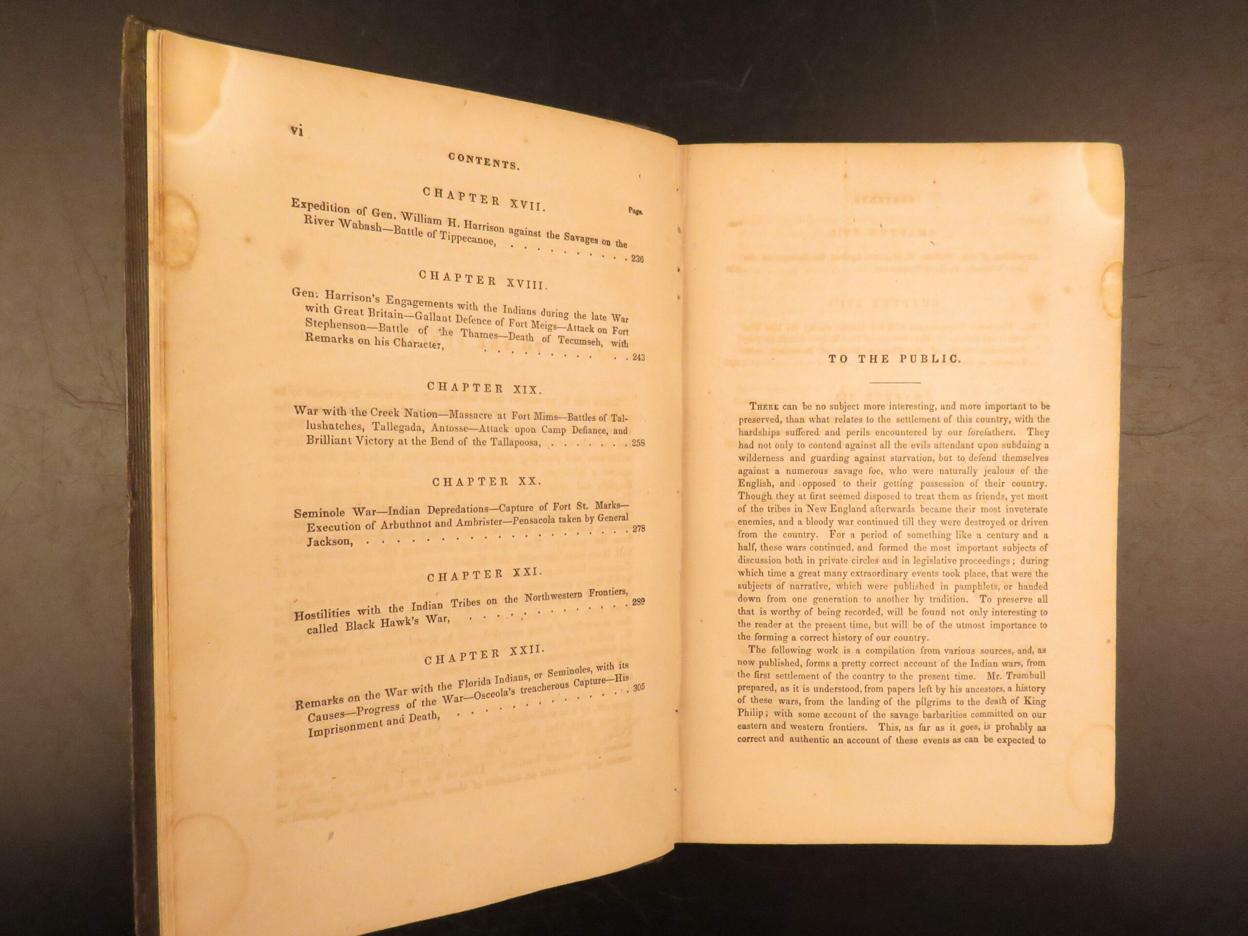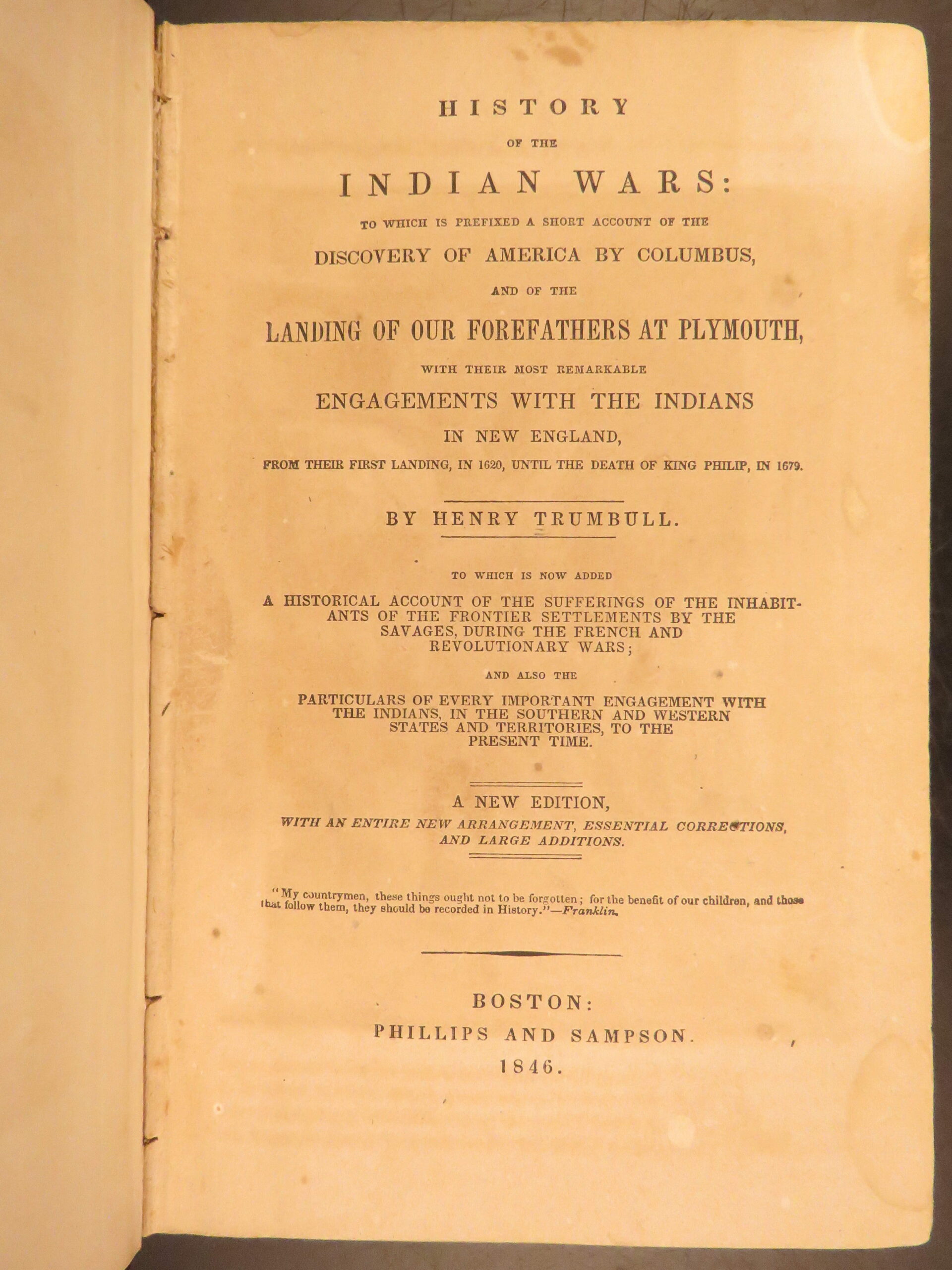 Henry Trumbull’s History of the Indian Wars (Boston, 1846) recounts Columbus, Plymouth, and Native American conflicts including King Philip’s War, the Seminole War, and Black Hawk’s War, with illustrations