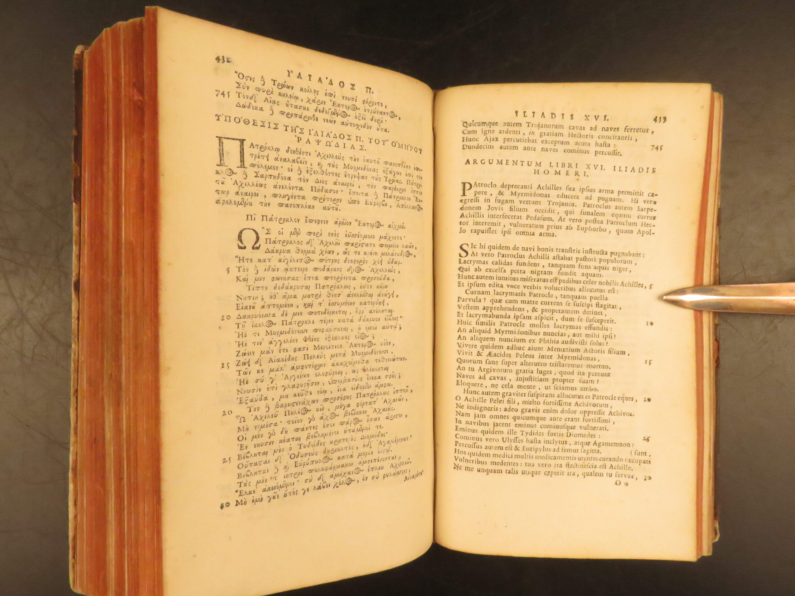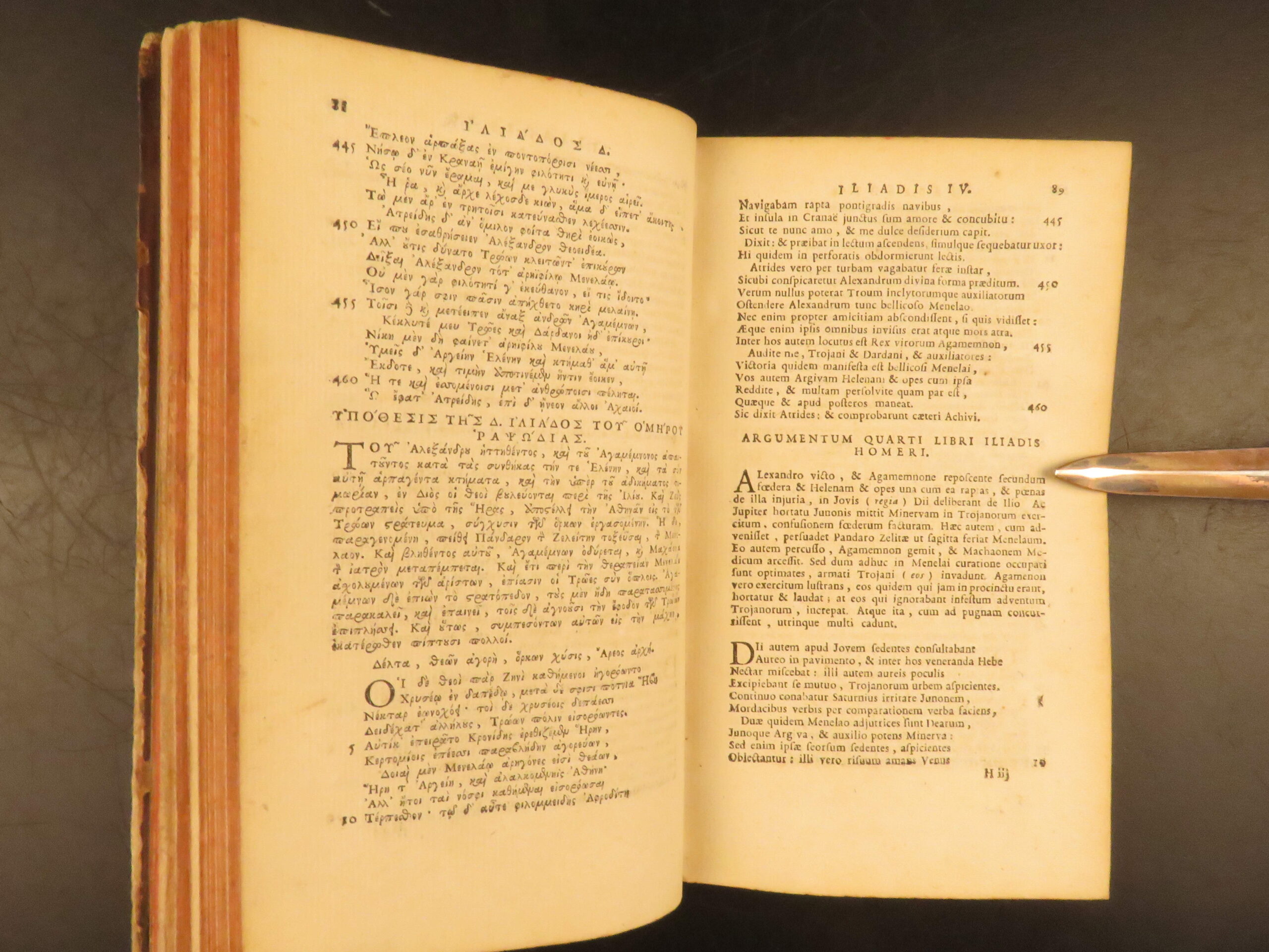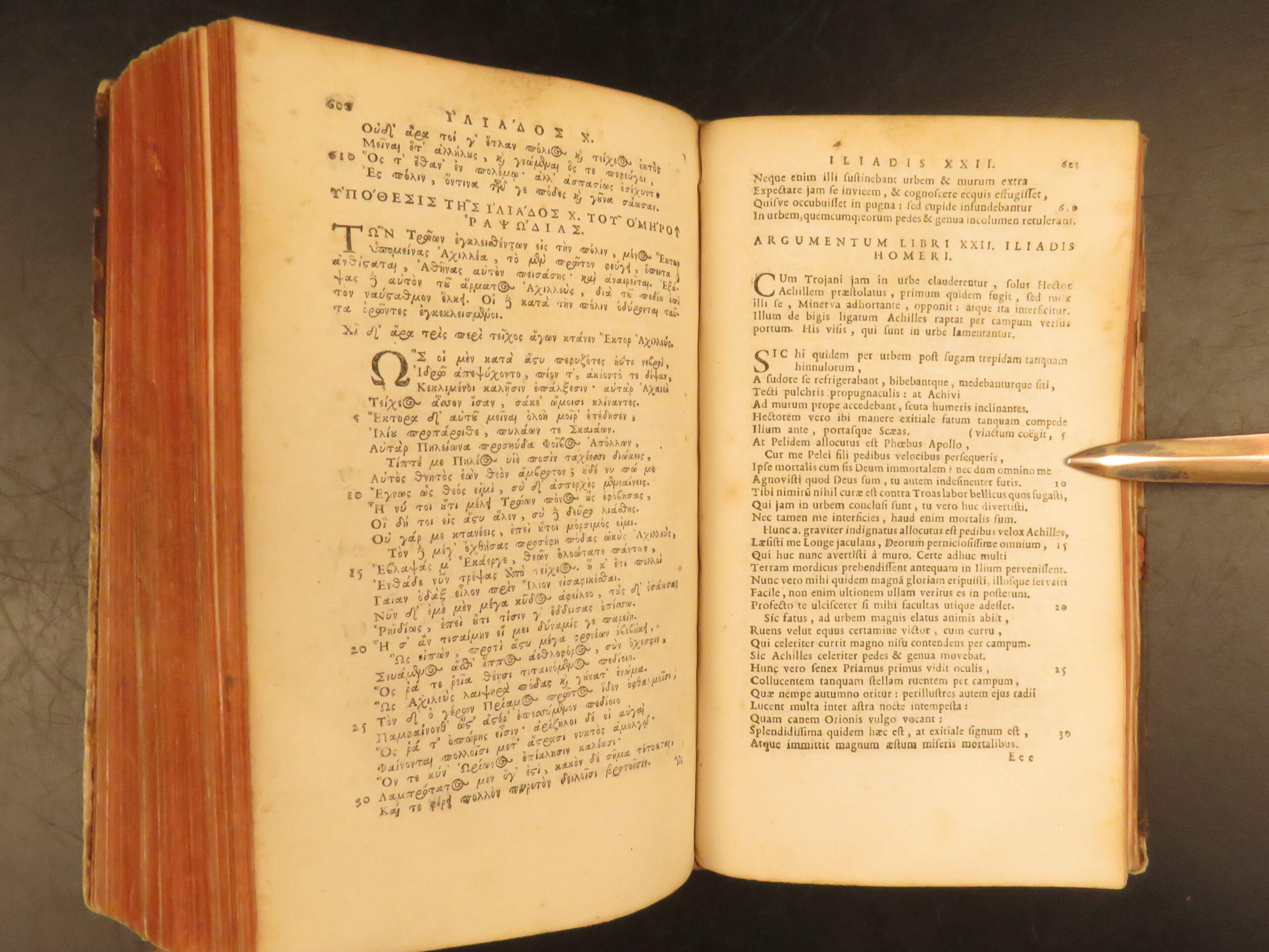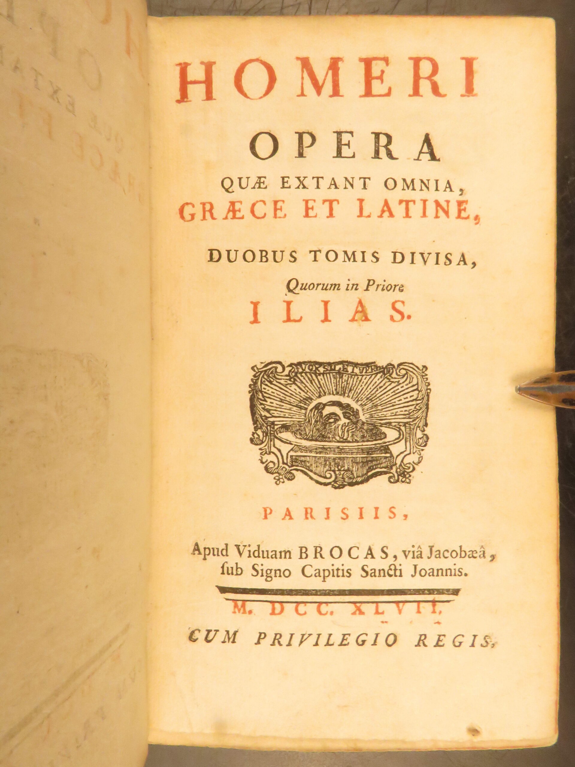 1747 Paris printing of Homer’s Iliad presenting Greek and Latin texts on facing pages, in full leather binding with marbled endpapers. A scarce bilingual eighteenth-century edition printed by the widow Brocas.