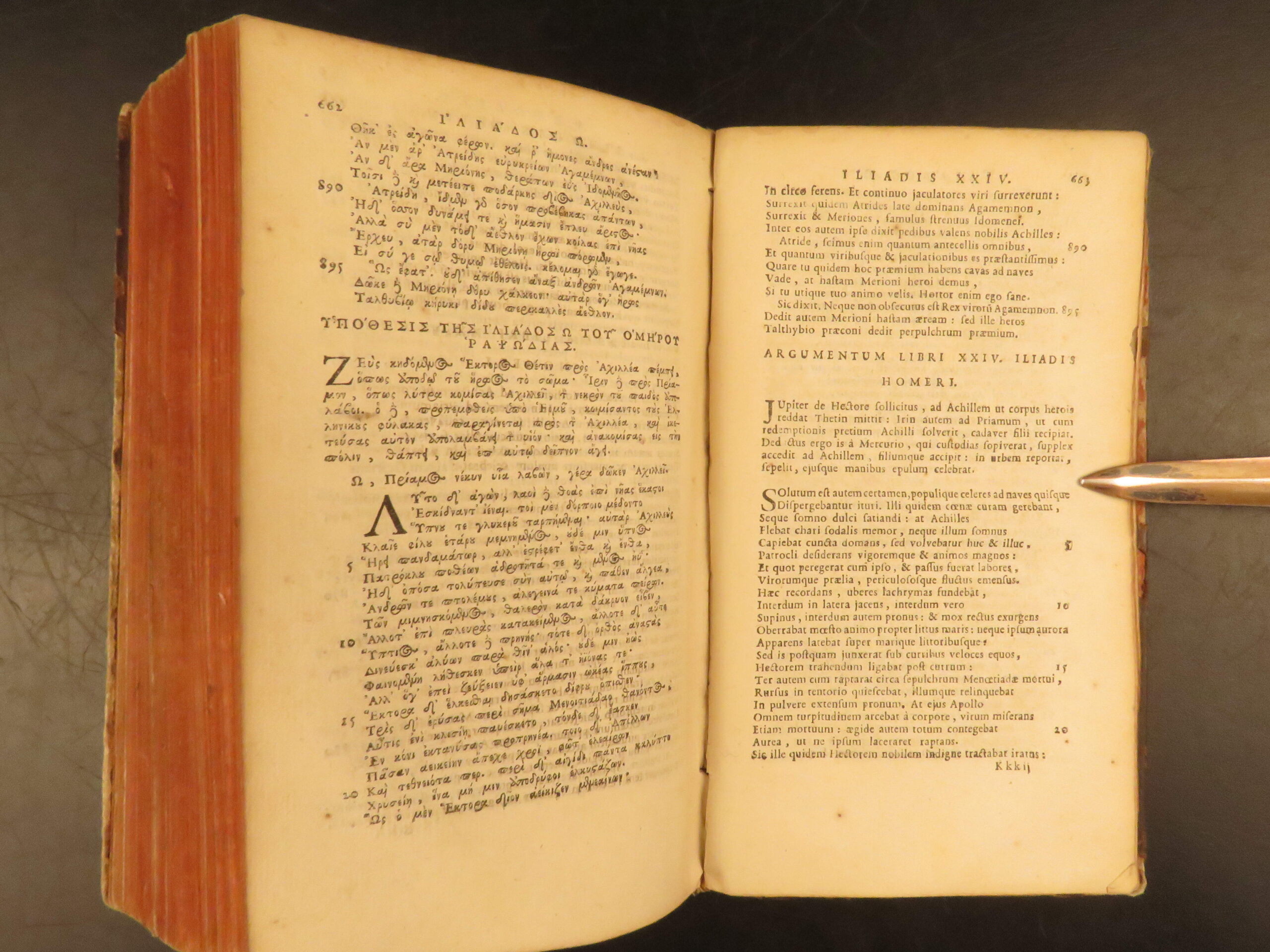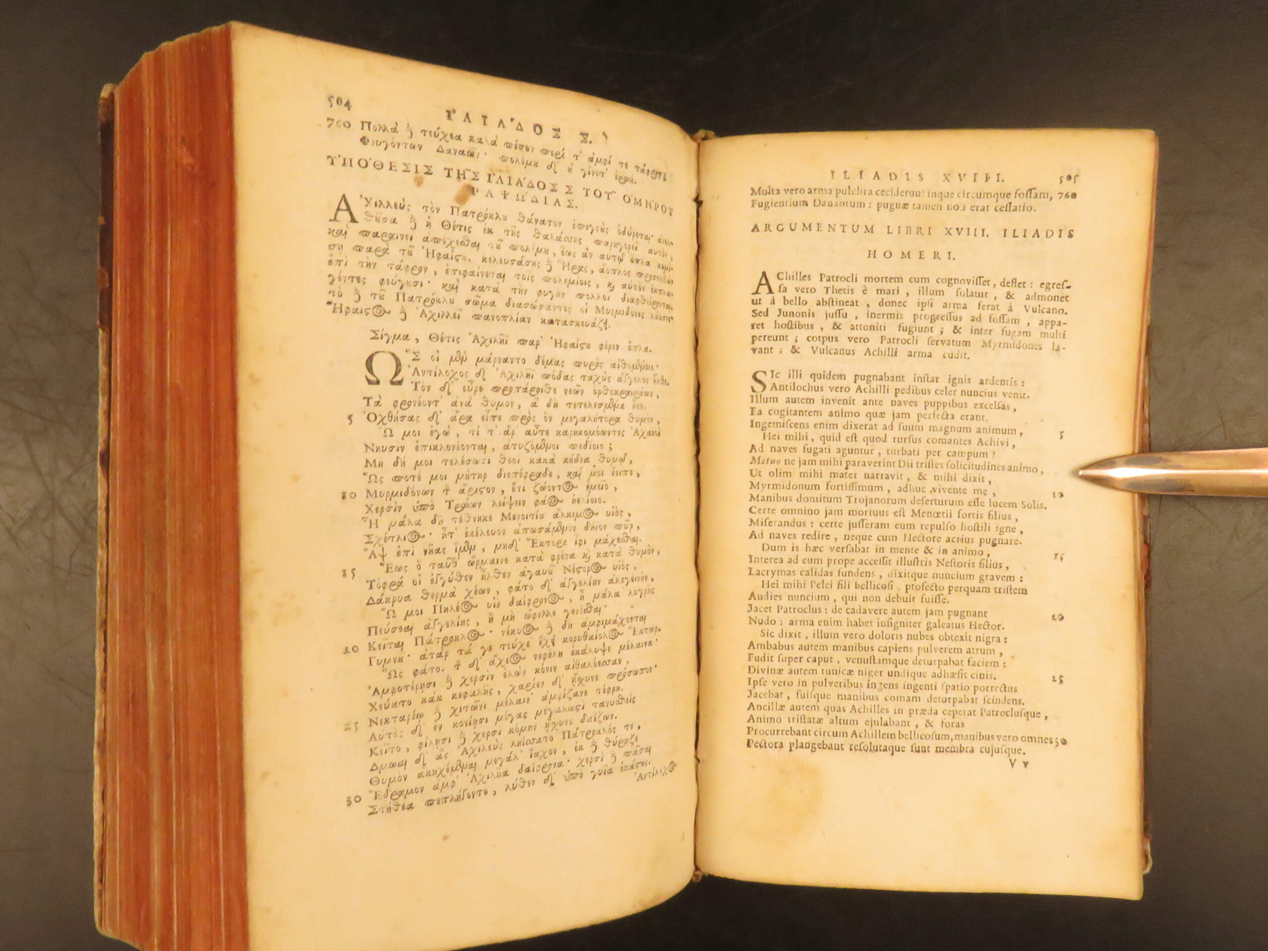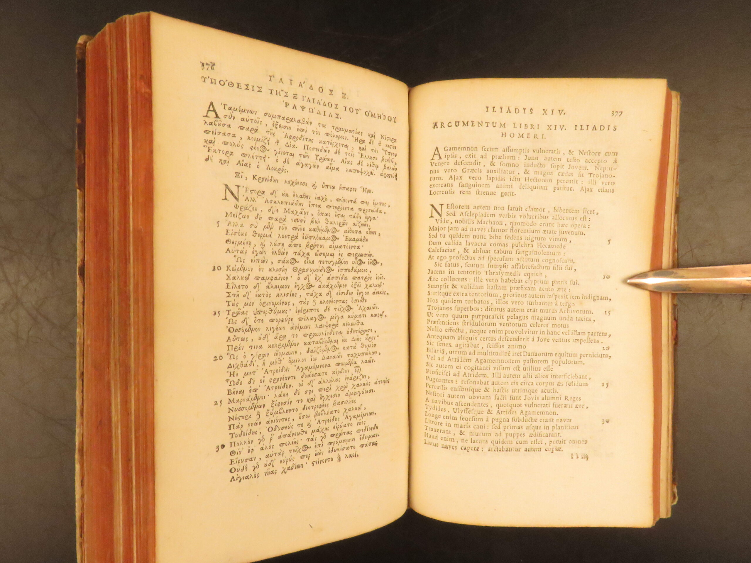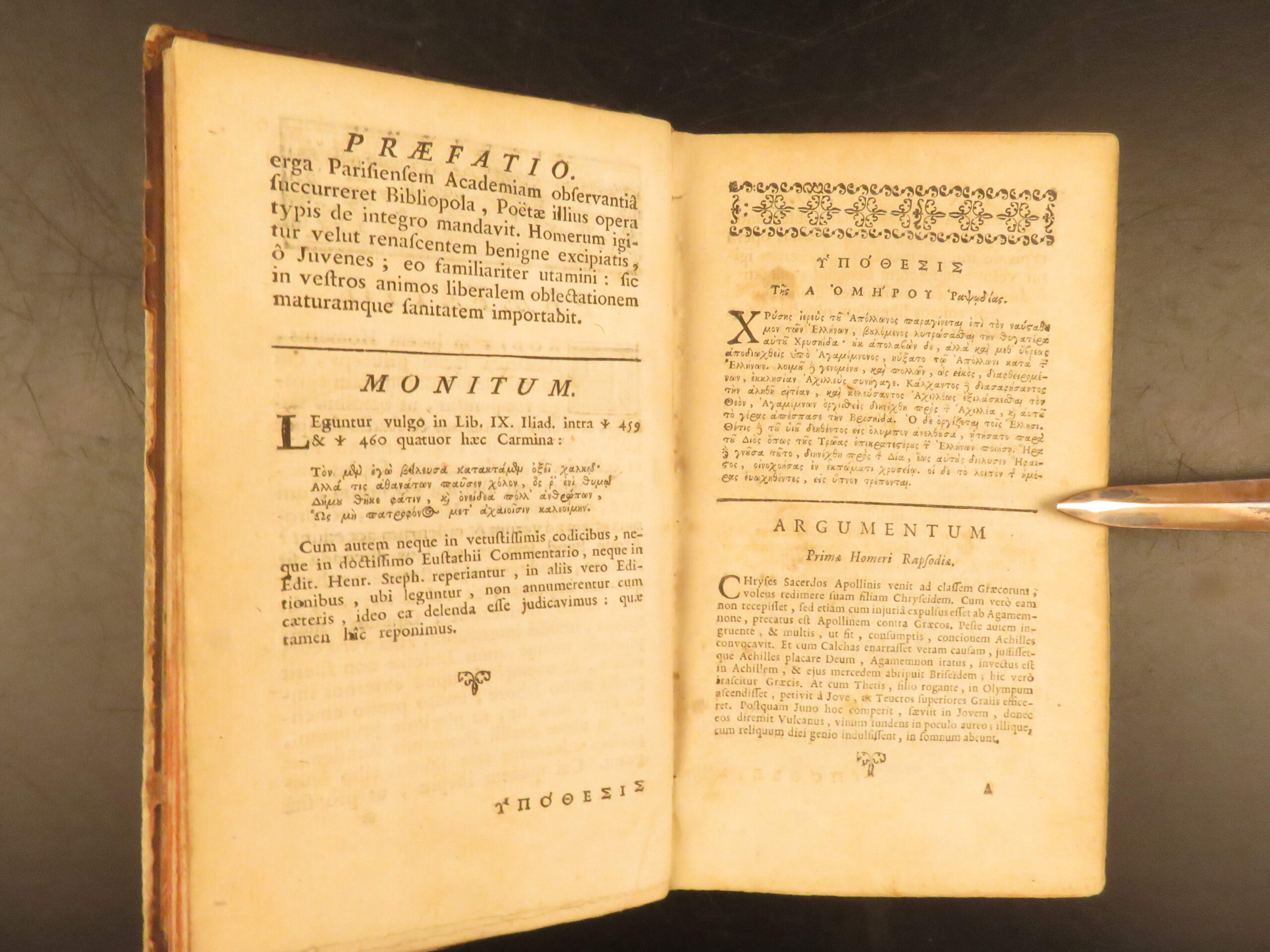 1747 Paris printing of Homer’s Iliad presenting Greek and Latin texts on facing pages, in full leather binding with marbled endpapers. A scarce bilingual eighteenth-century edition printed by the widow Brocas.