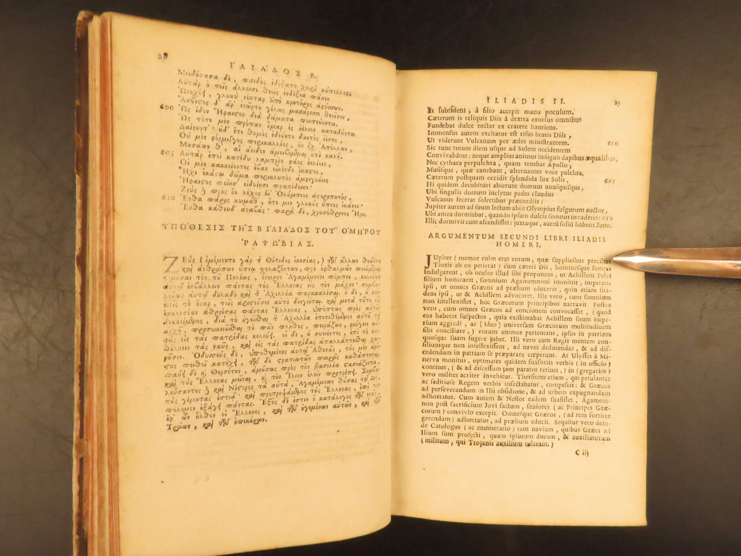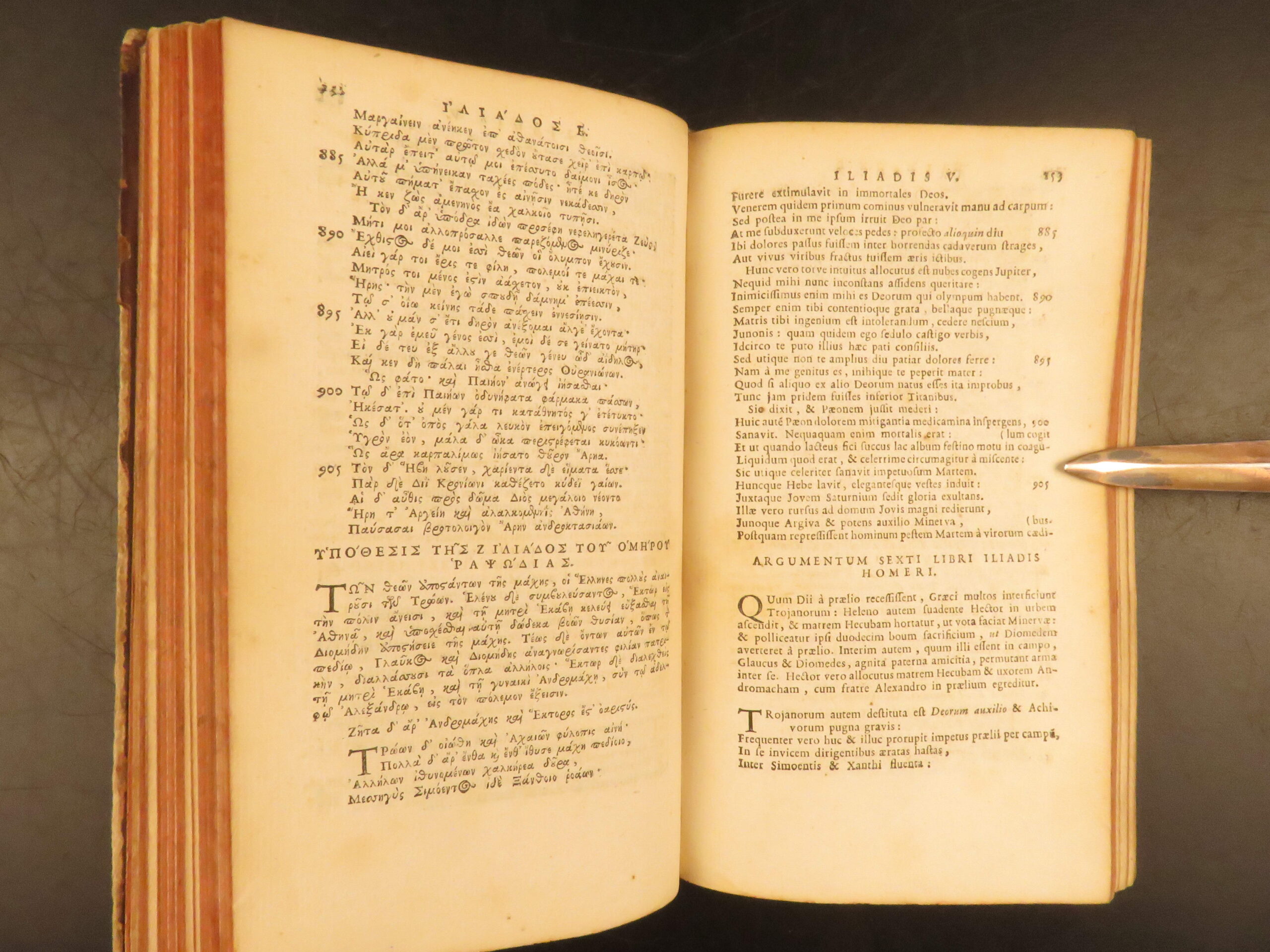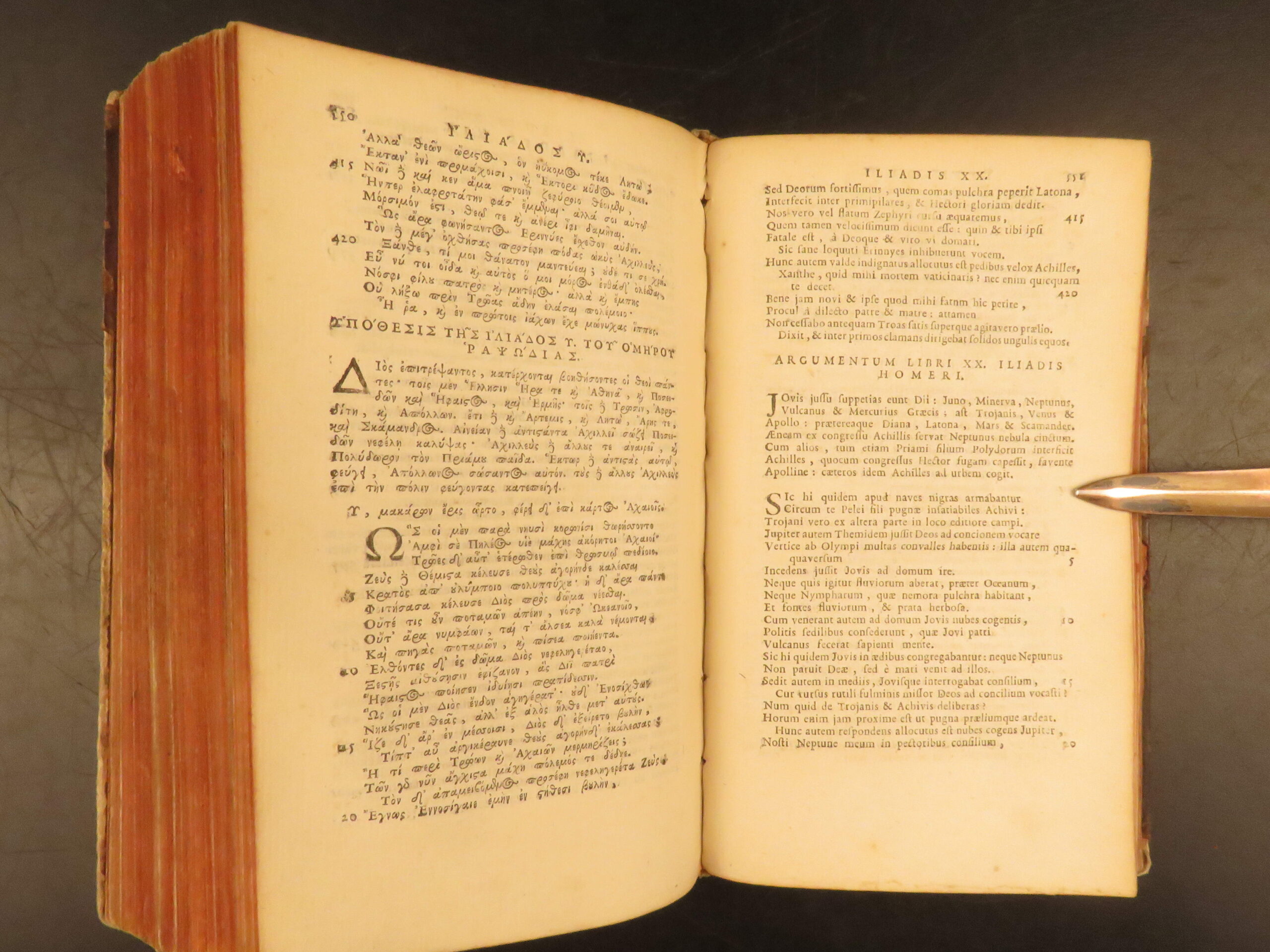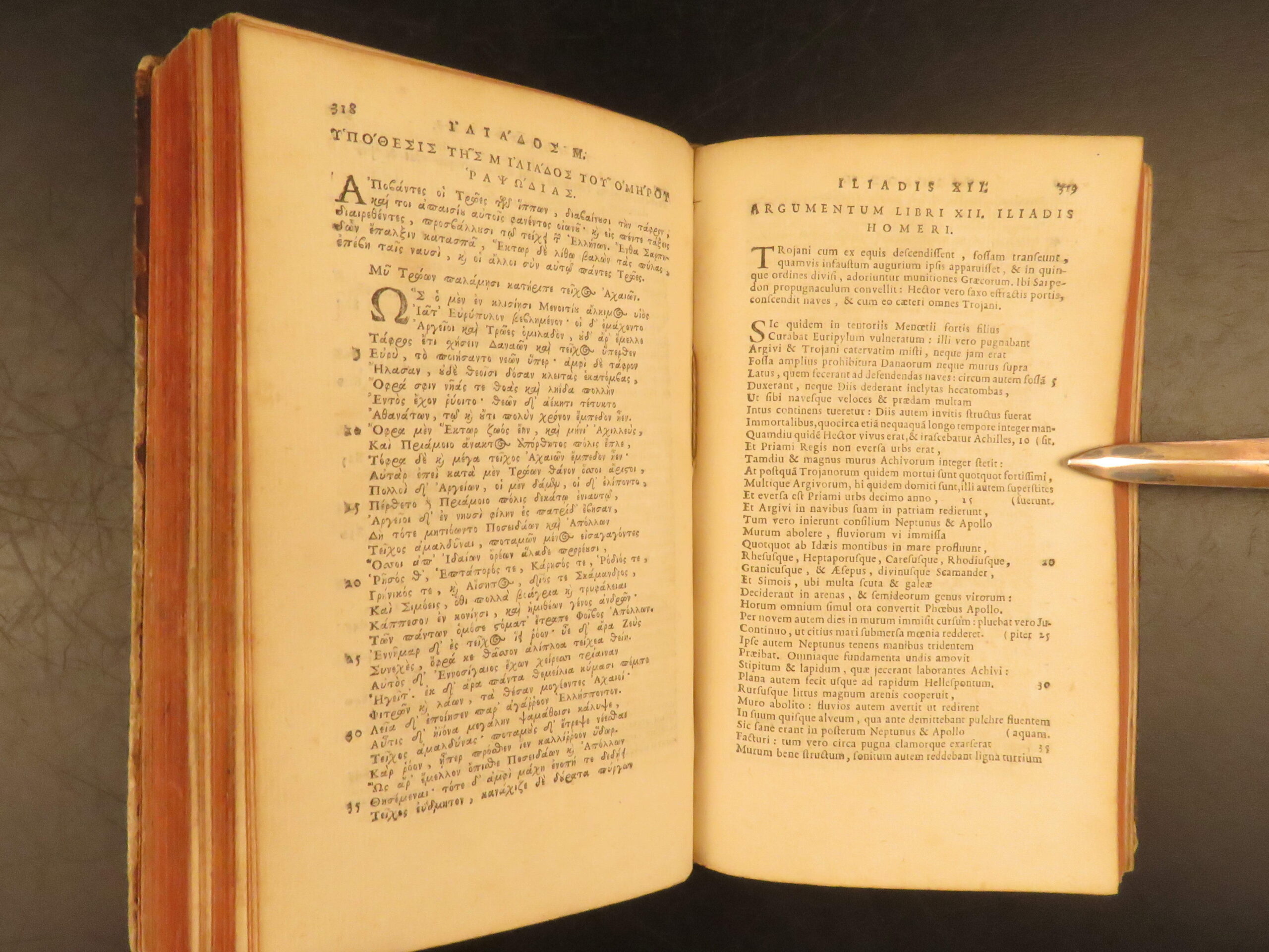 1747 Paris printing of Homer’s Iliad presenting Greek and Latin texts on facing pages, in full leather binding with marbled endpapers. A scarce bilingual eighteenth-century edition printed by the widow Brocas.