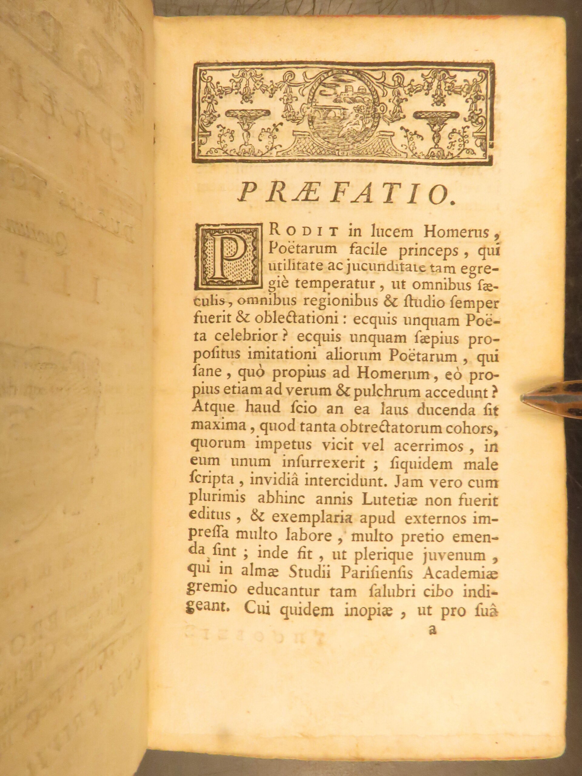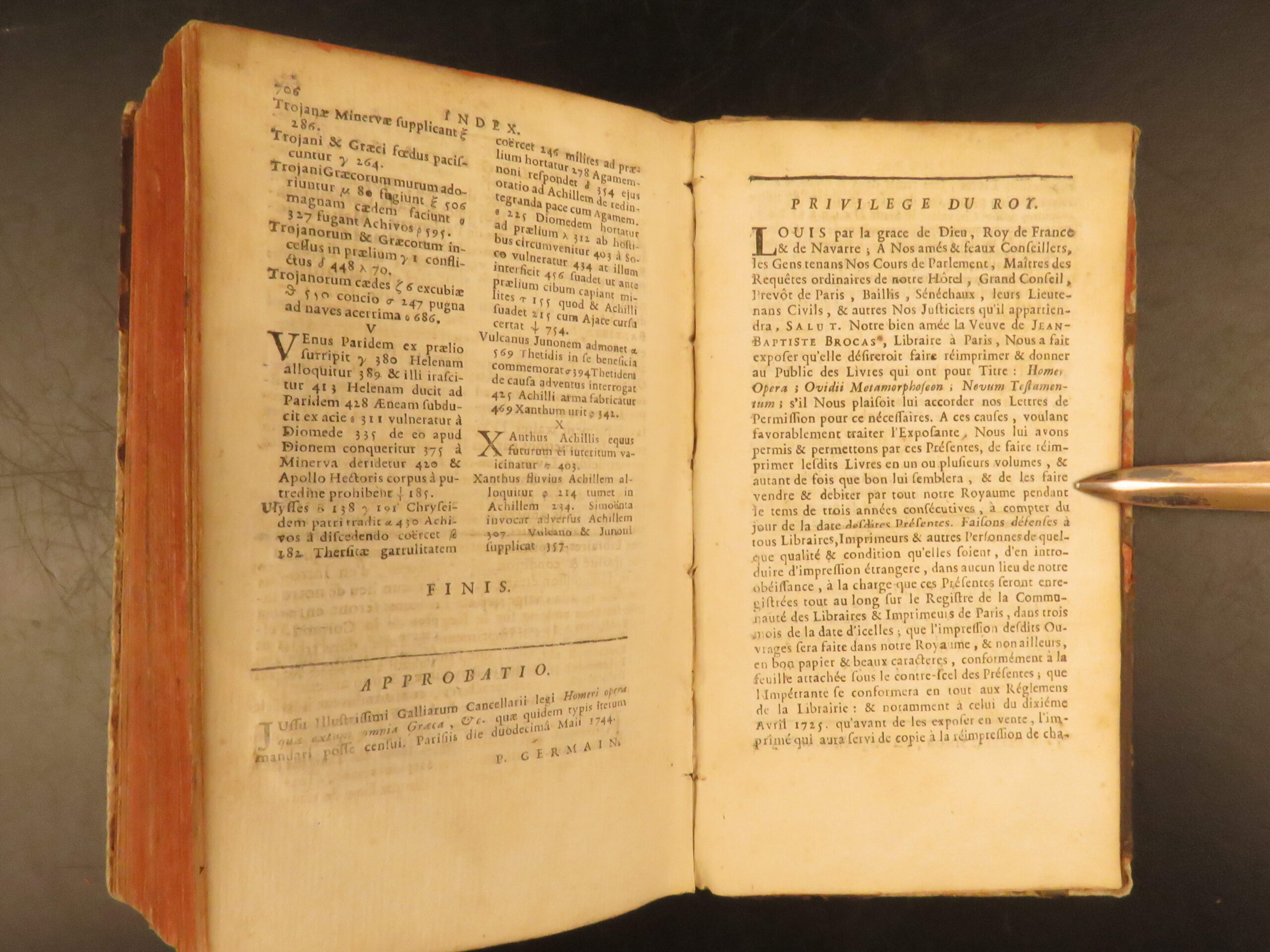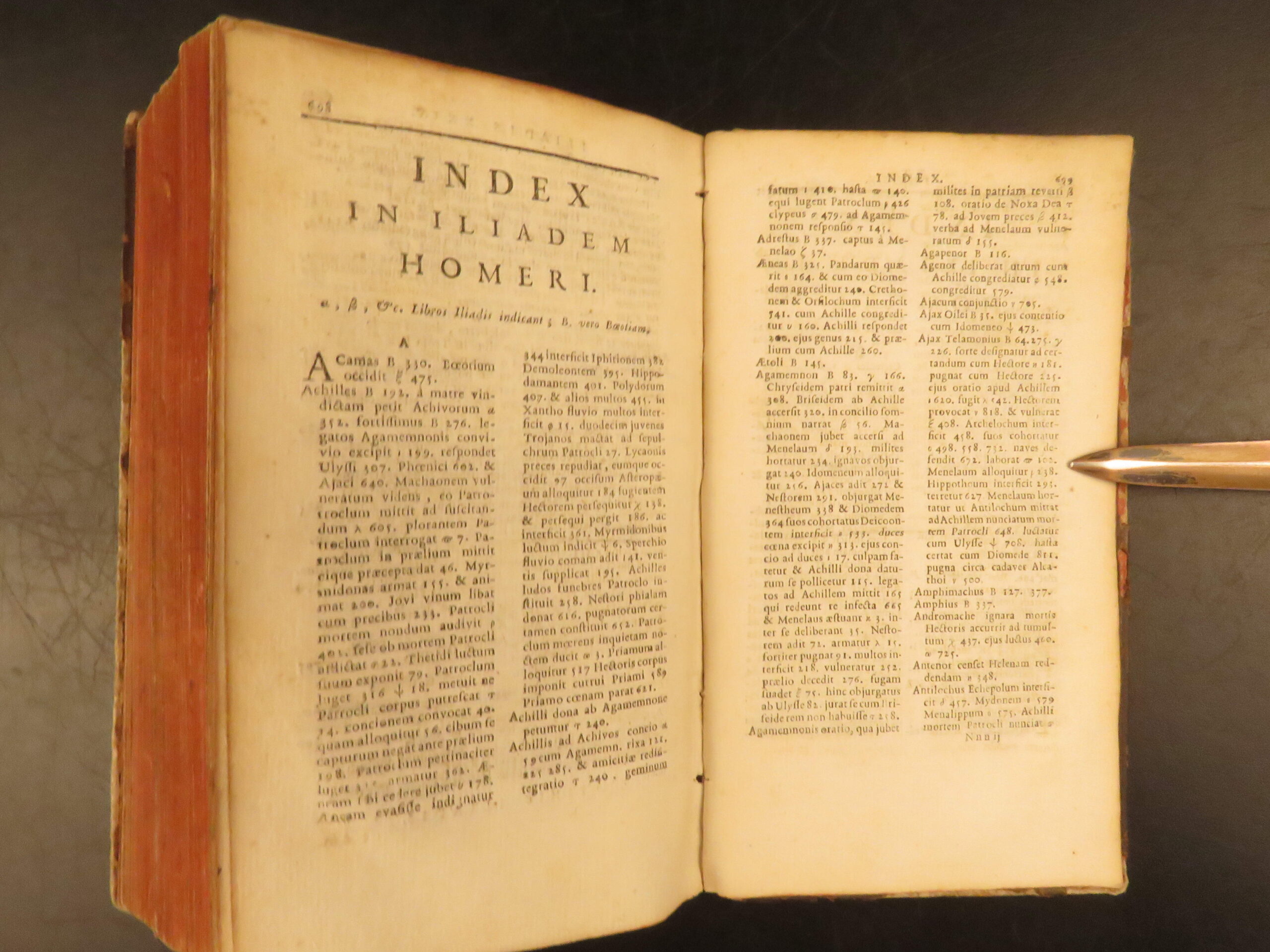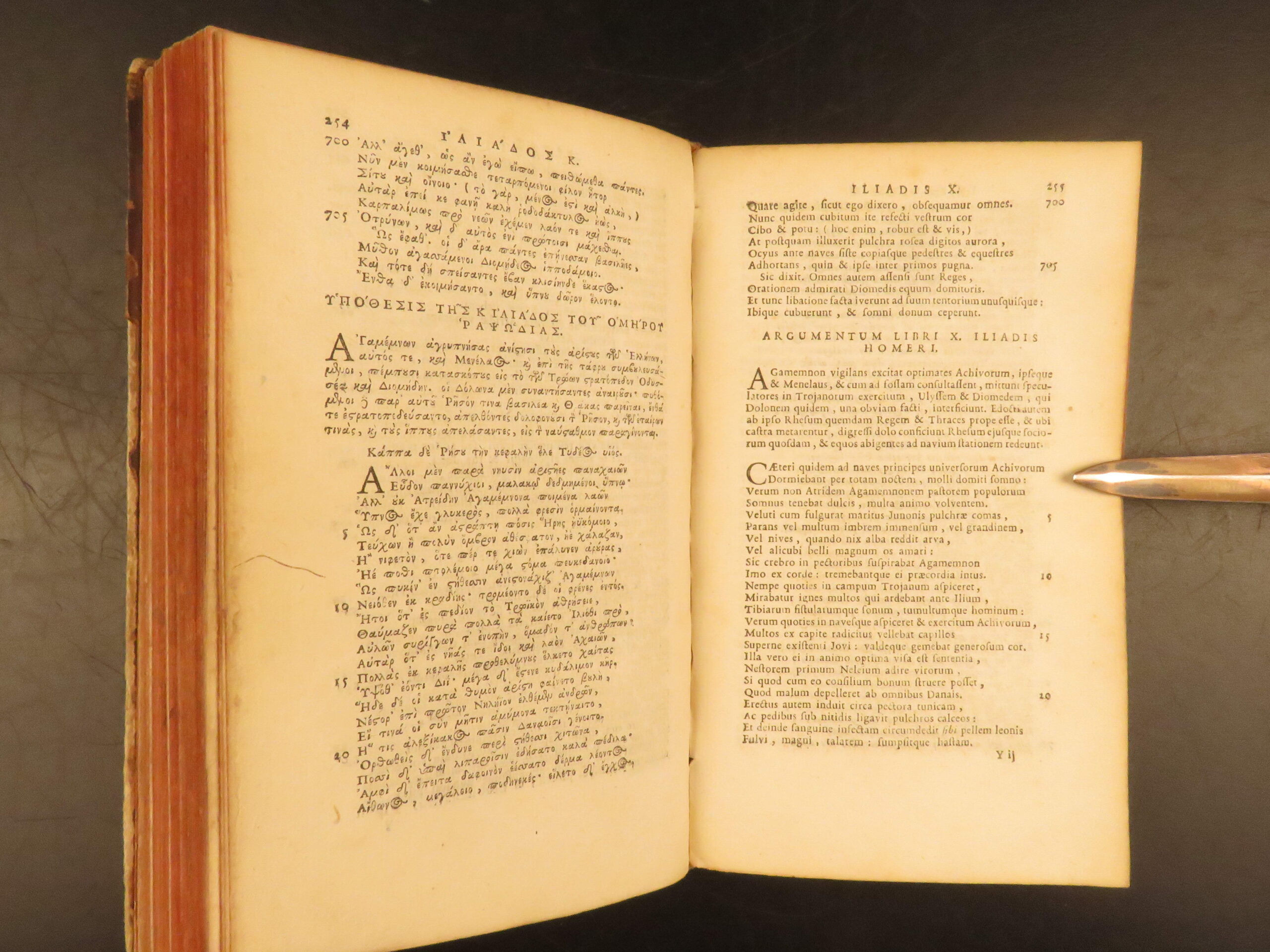 1747 Paris printing of Homer’s Iliad presenting Greek and Latin texts on facing pages, in full leather binding with marbled endpapers. A scarce bilingual eighteenth-century edition printed by the widow Brocas.