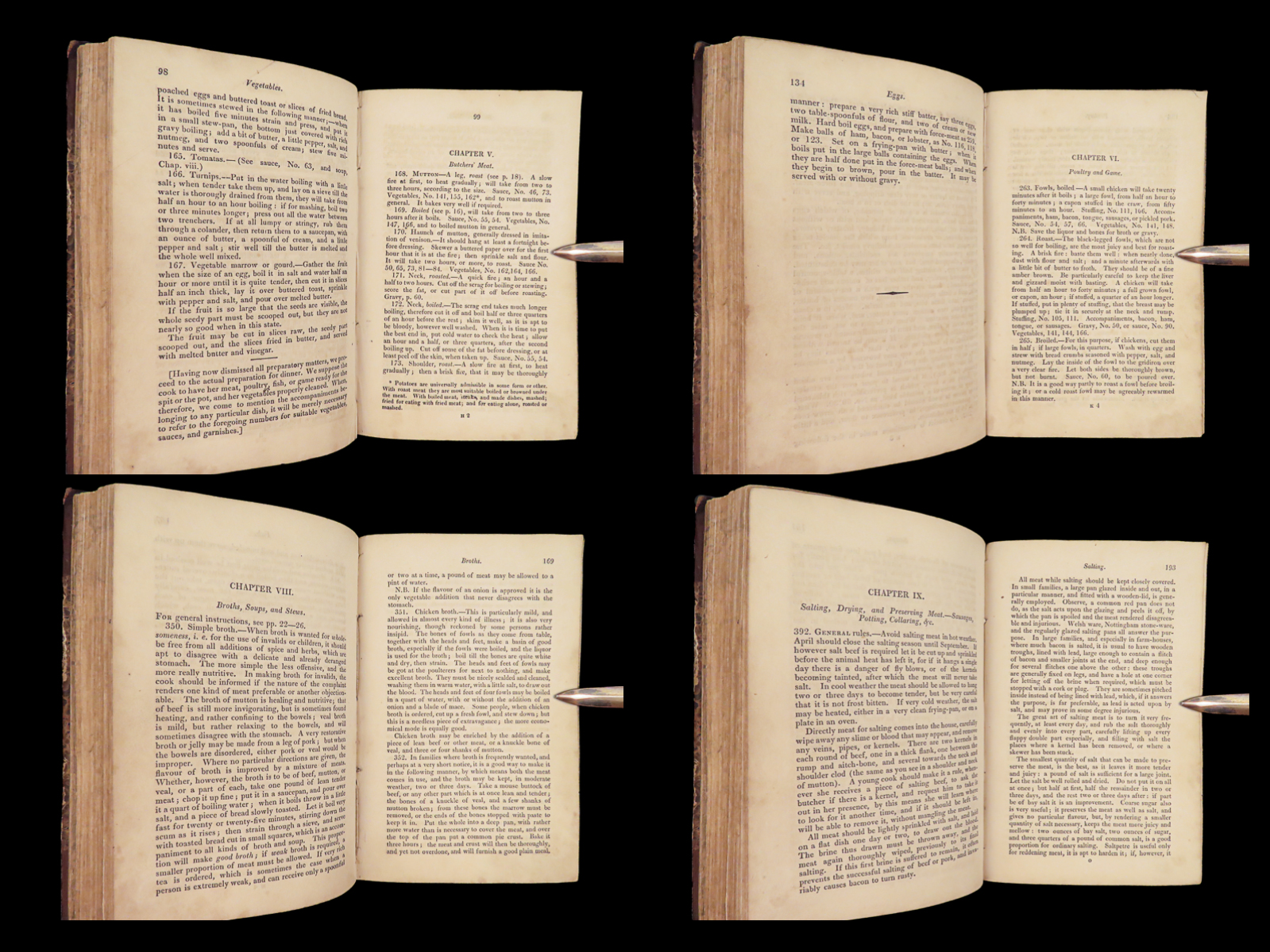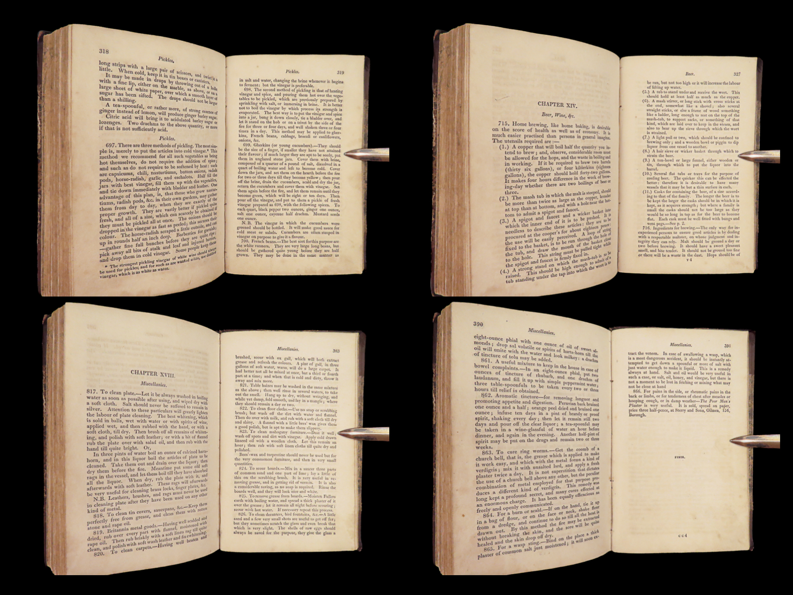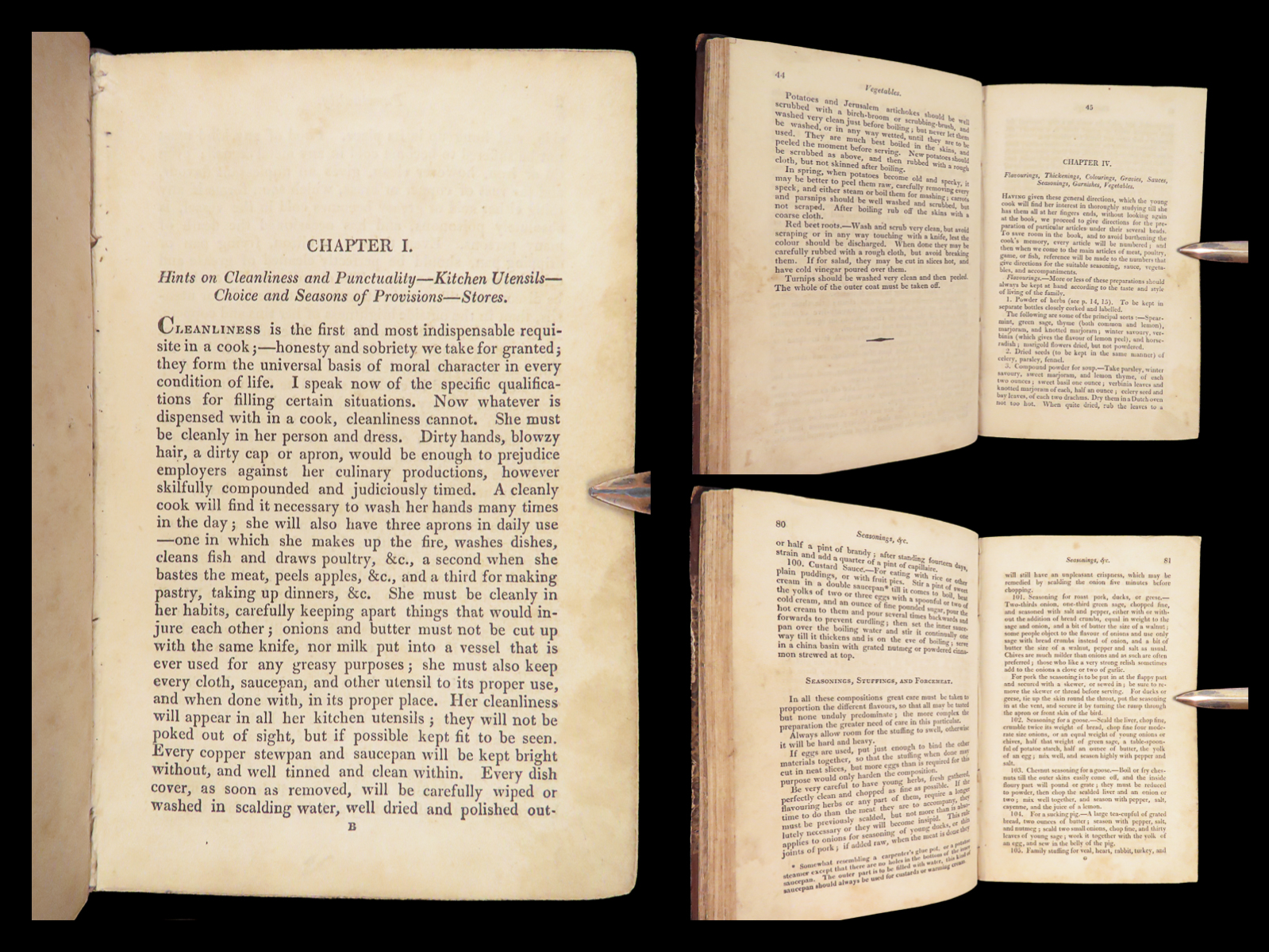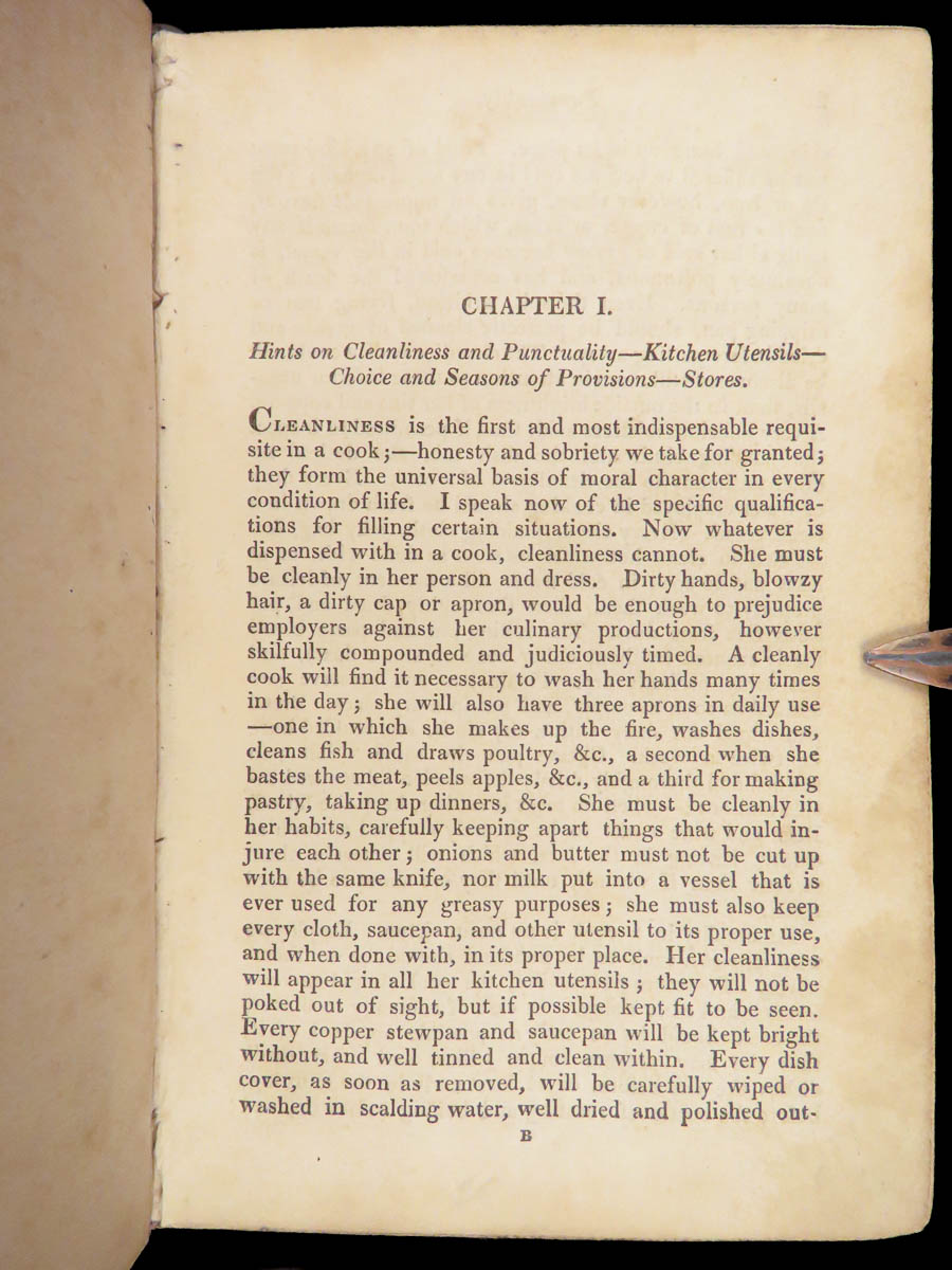 This first edition covers topics such as kitchen utensils, sauce preparation, instructions for butchering mutton and poultry, methods for preparing varieties of fish, direction on make stews, fruit pies, and preserves. It also includes sections on making wine and beer, making chocolate, and how to keep poultry and pigs healthy.