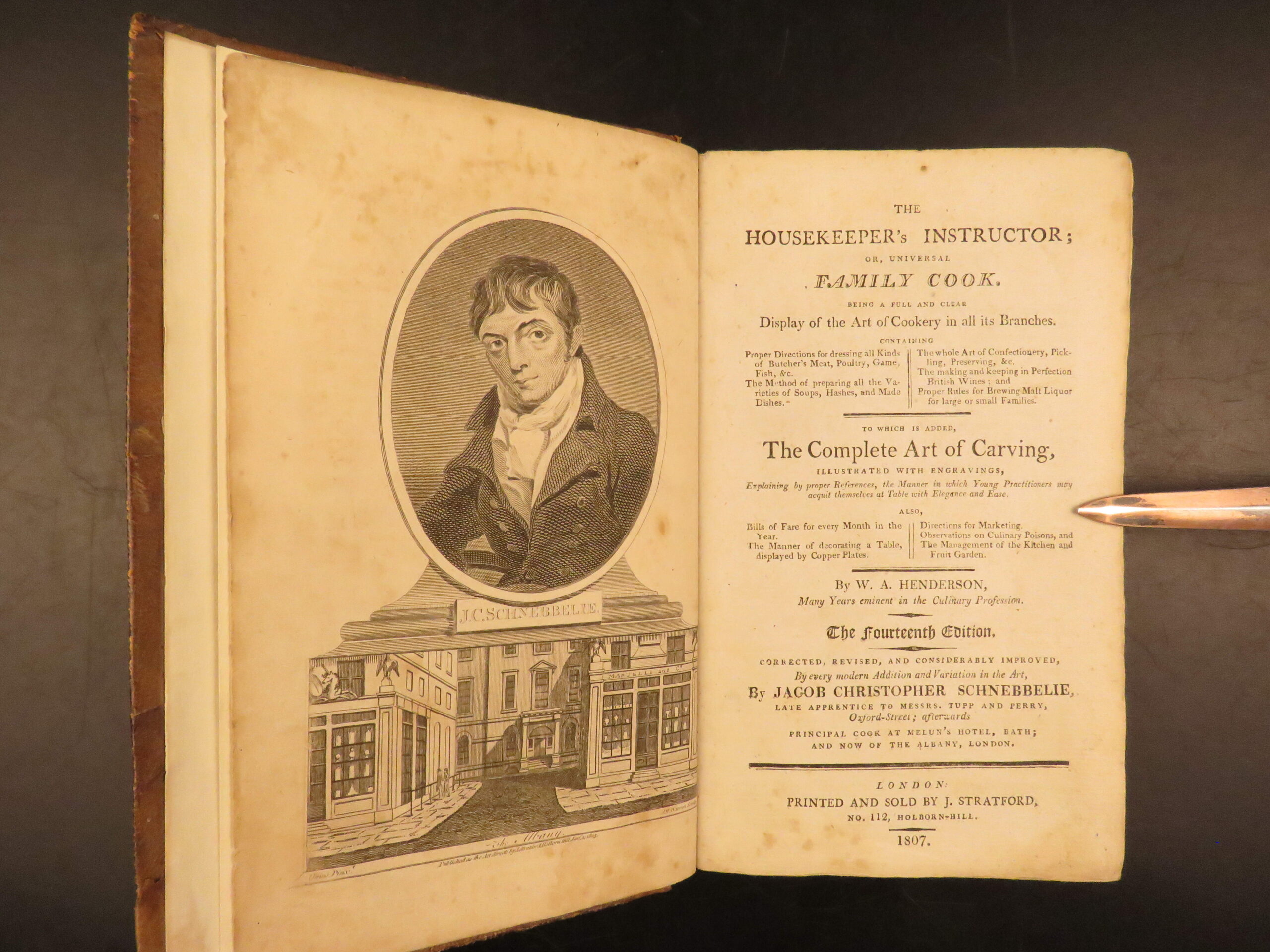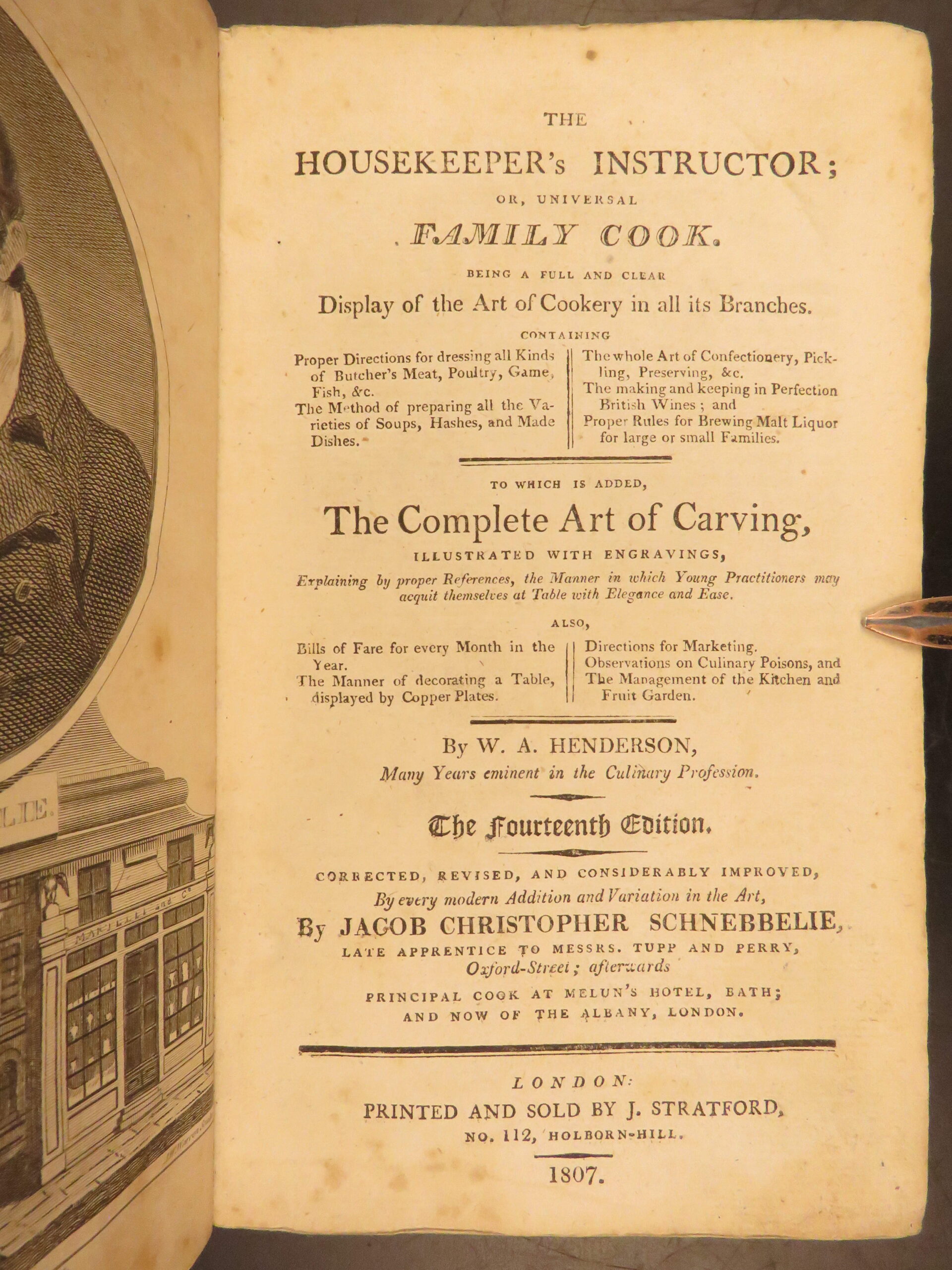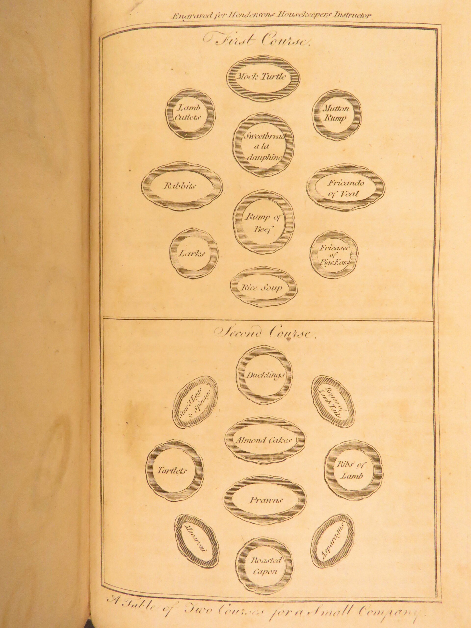 William Augustus Henderson’s The housekeeper’s instructor (1807, 14th edition) is an early English cookery manual with recipes, household instruction, and 11 engraved plates of carving and table service.
