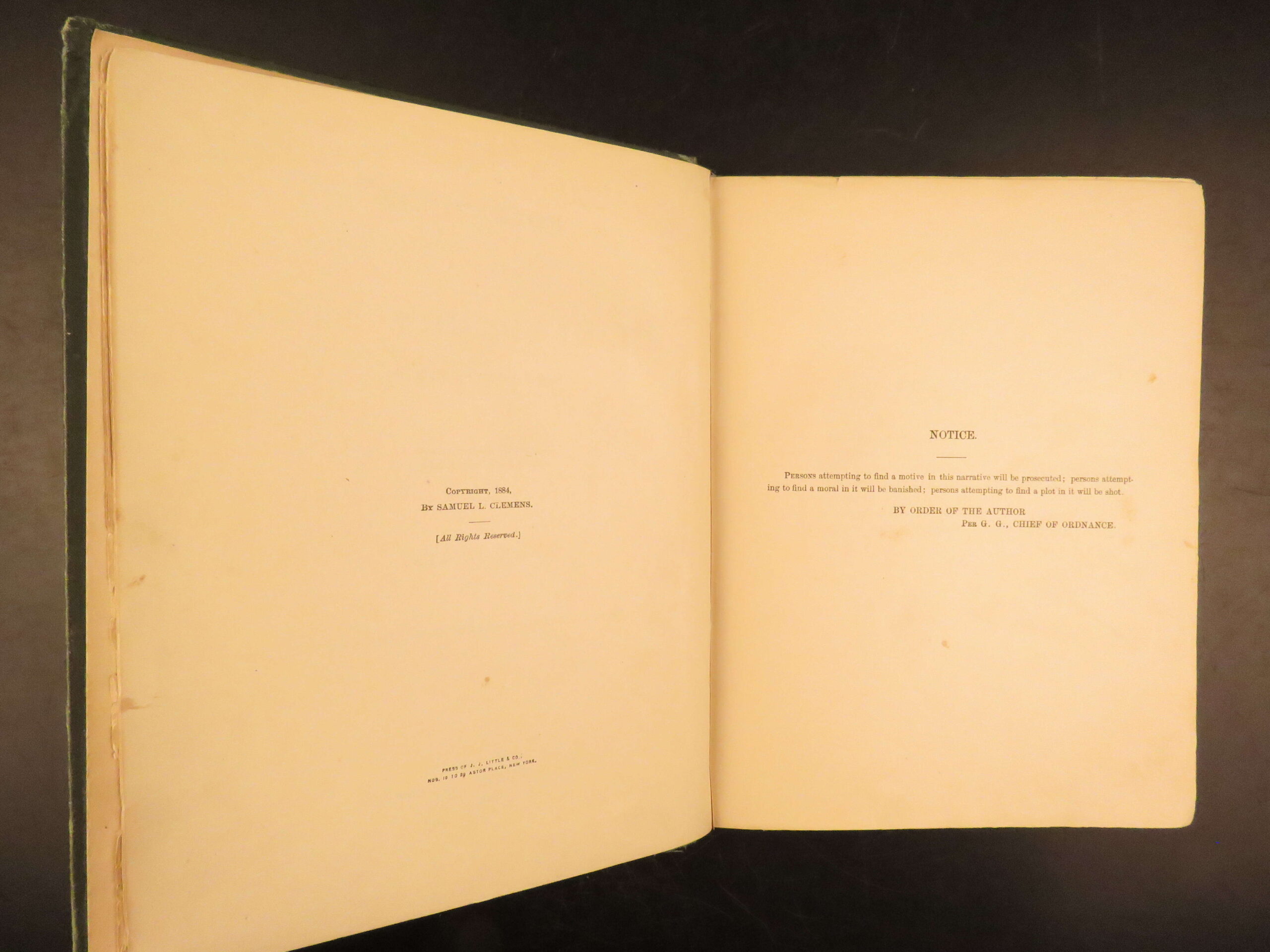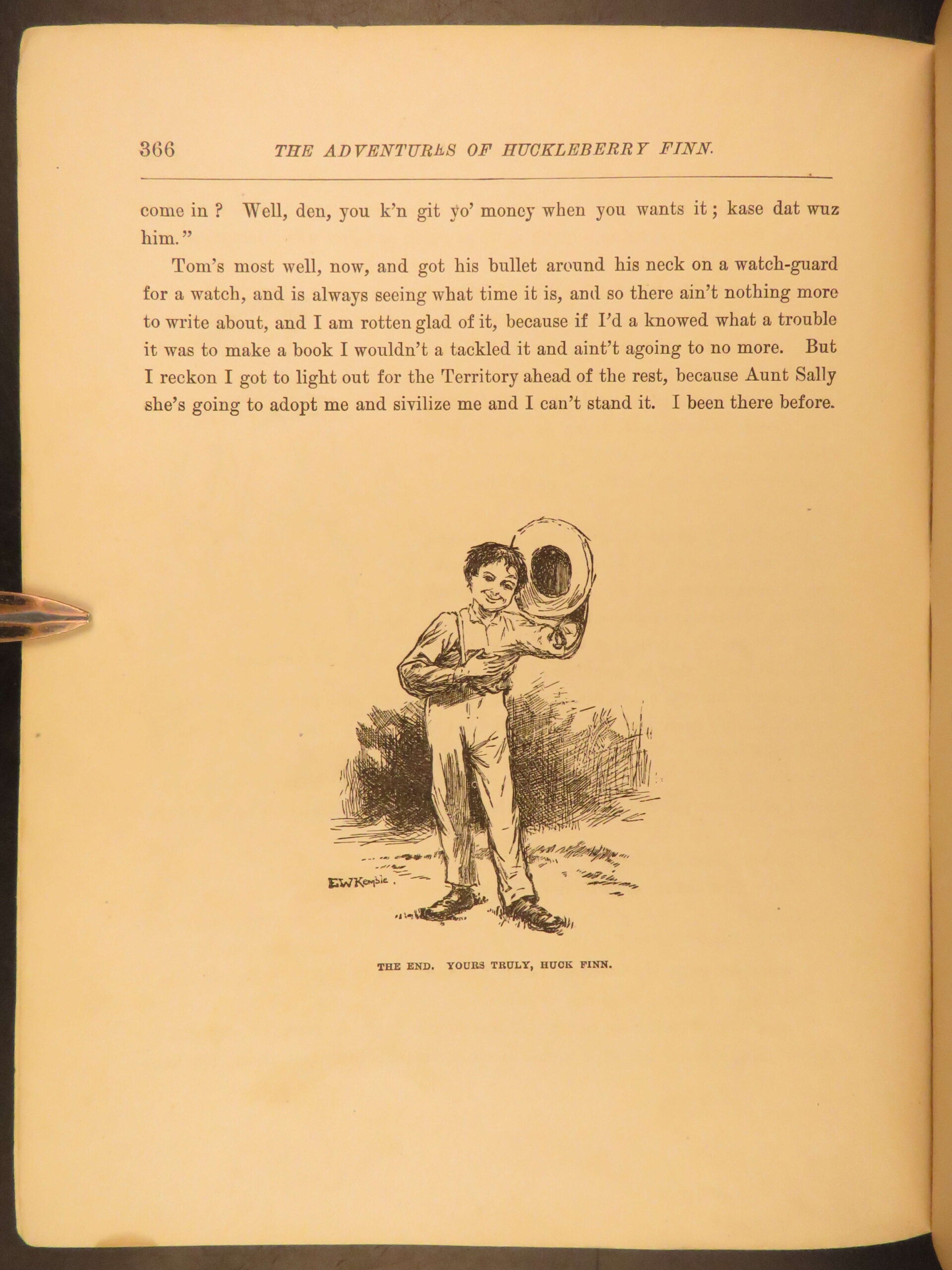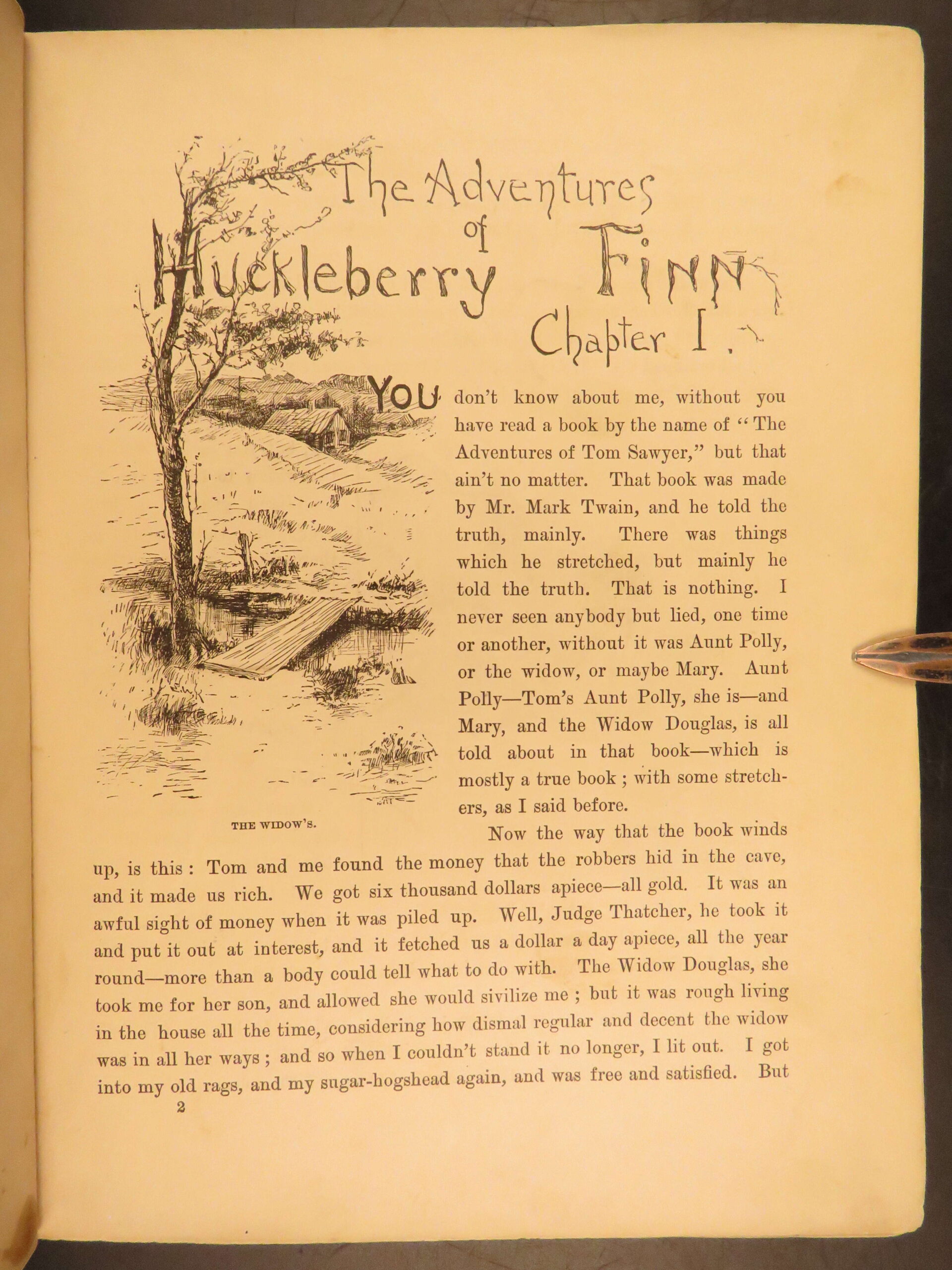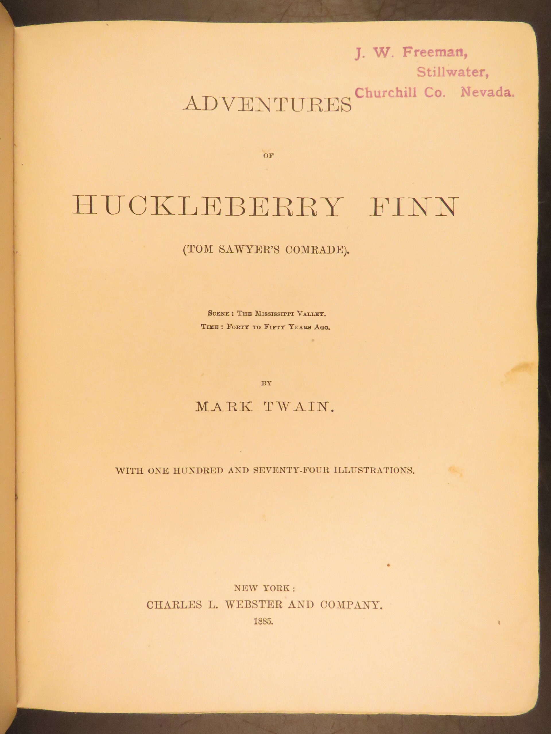 Mark Twain’s momentous book Huckleberry Finn has been the source of arguments, discussion, and controversy since it first appeared in 1885. It has been reprinted countless times and is still considered to be one of the most popular American novels, if not the most popular. This first American printing meets the first edition points according to the BAL (see below).