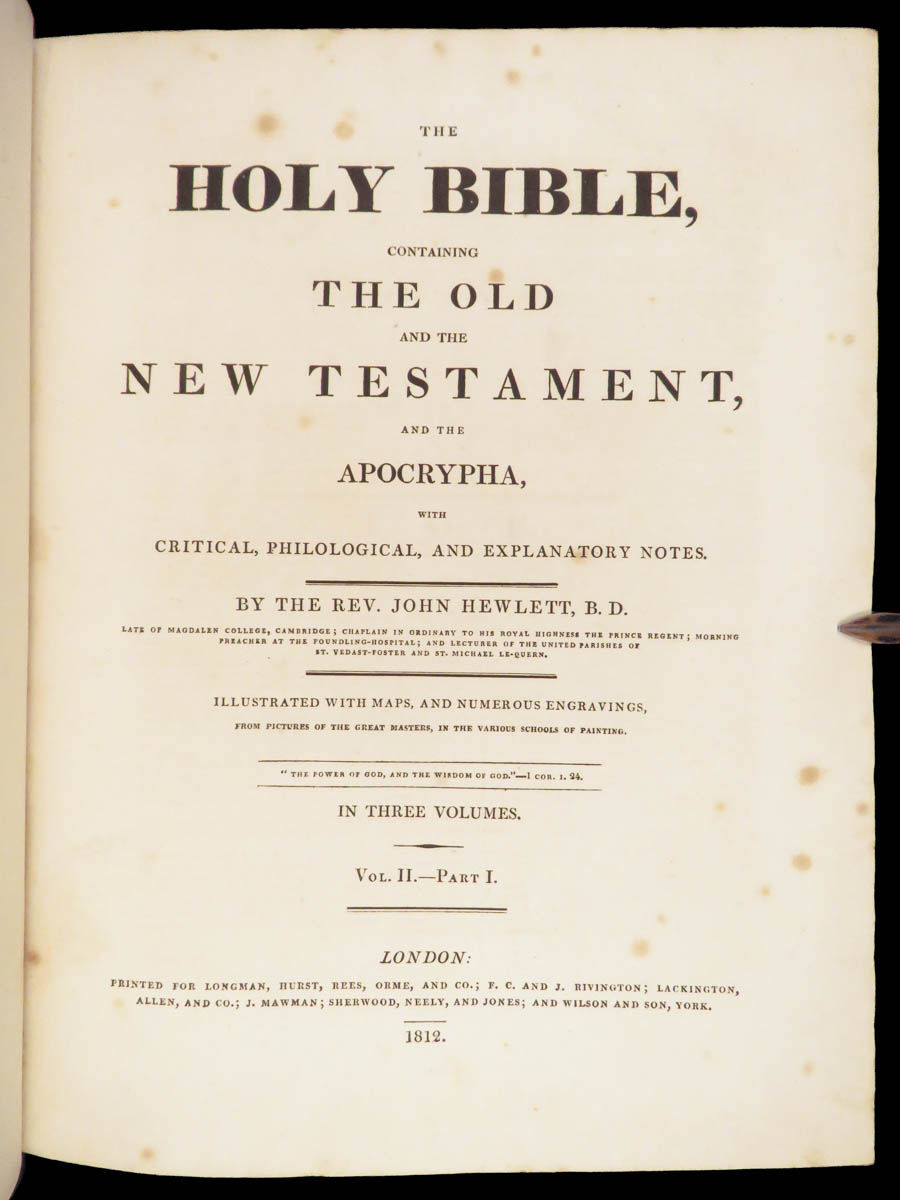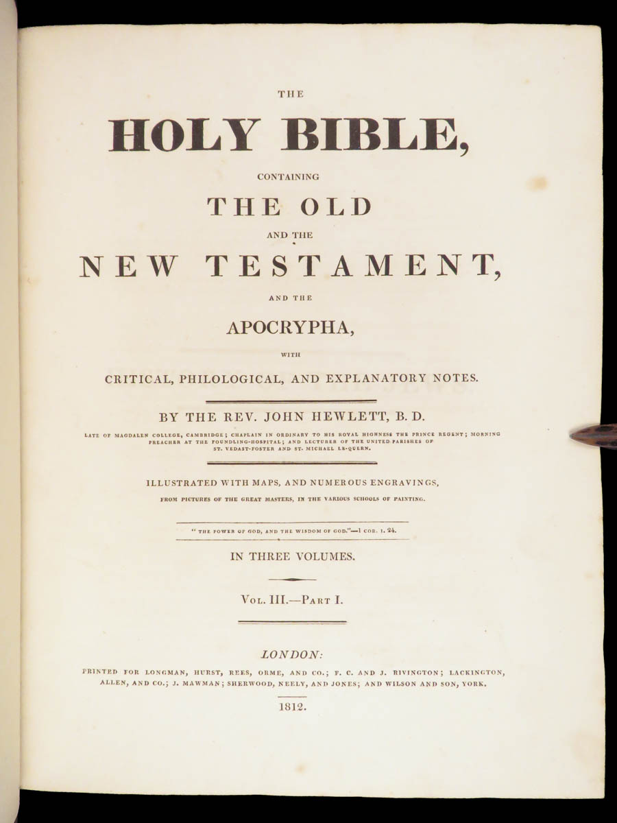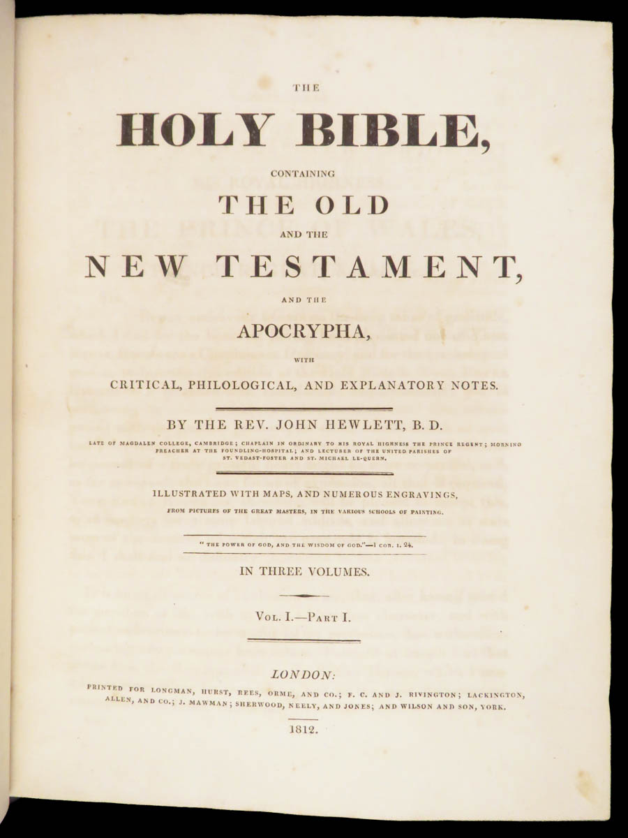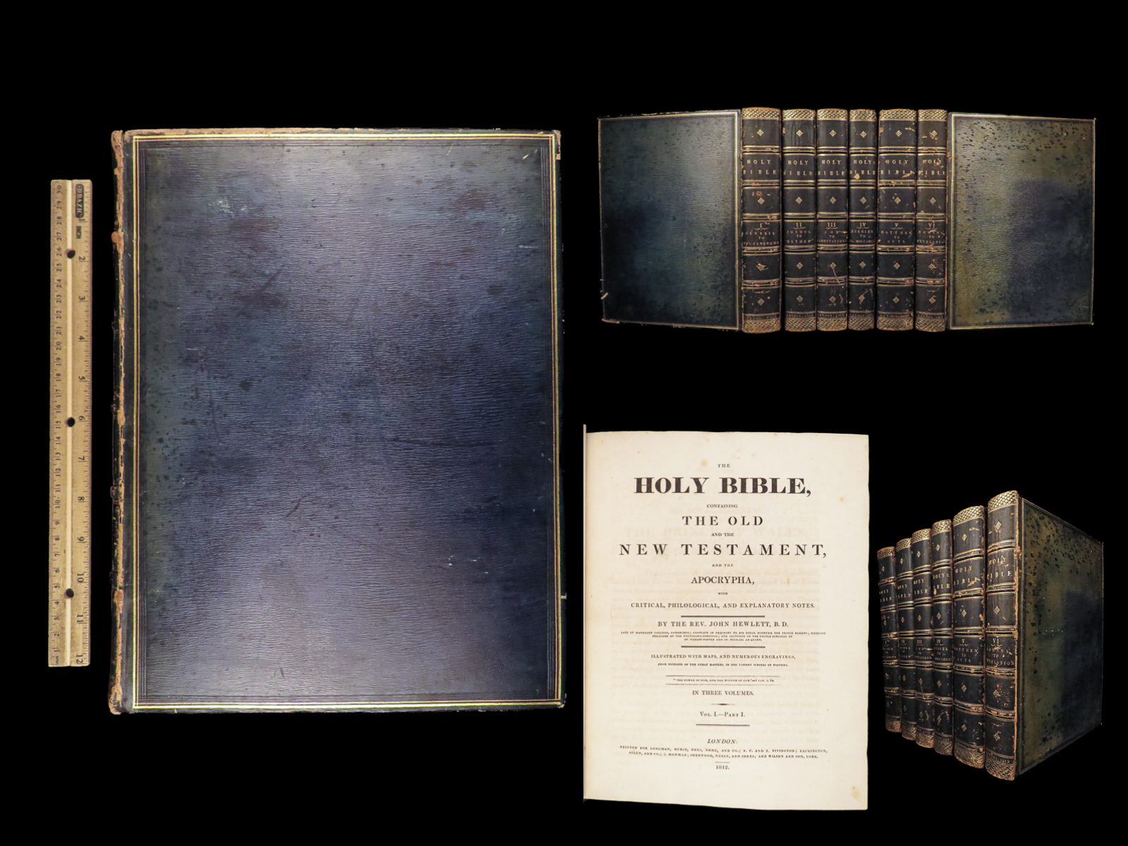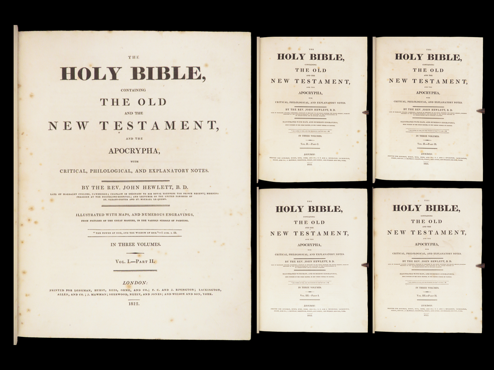 The Holy Bible, containing the Old and the New Testament, and Apocrypha was published in London in 1812 in six huge volumes. Each volume features extensive notes and commentary by Hewlett, a known biblical editor of the early 19th century. The set includes 120 engraved plates, integrated across the biblical text and apocryphal books.